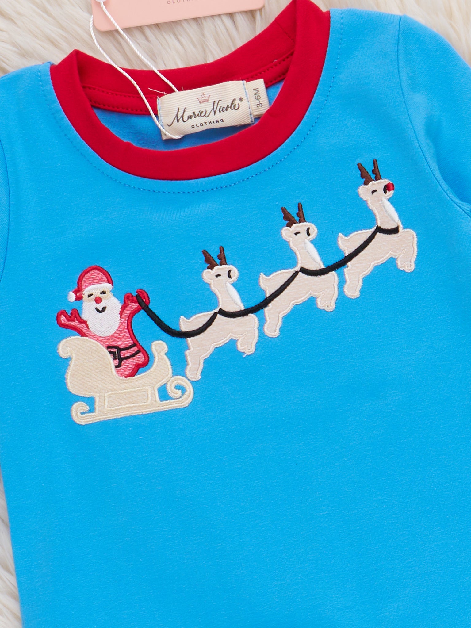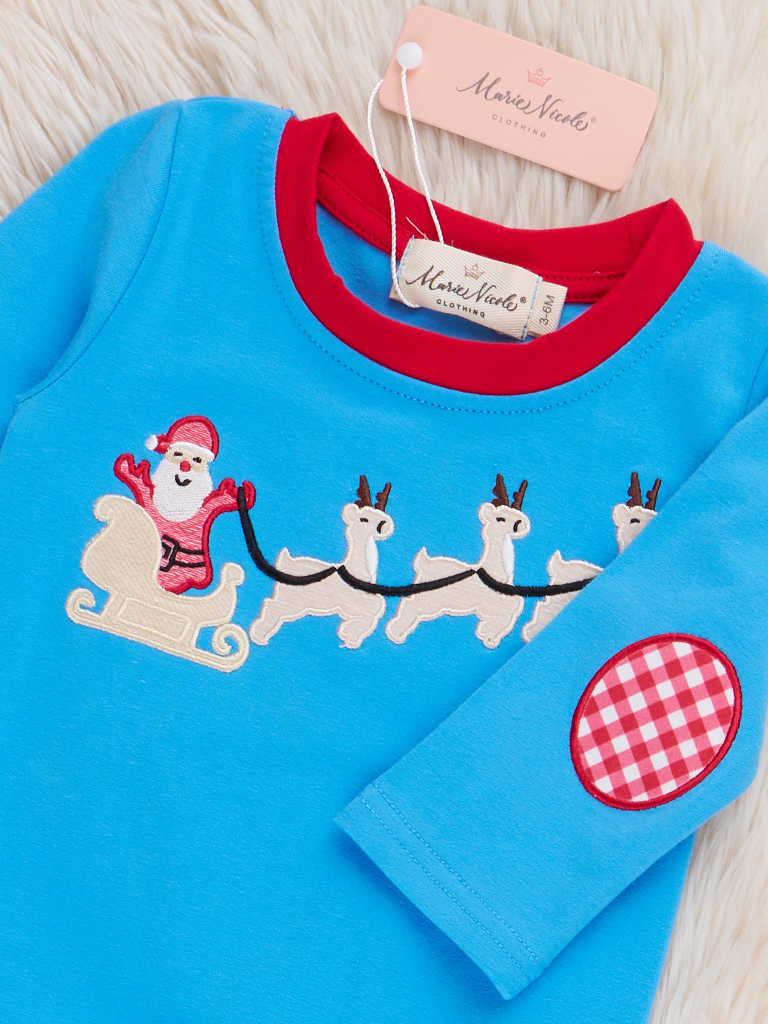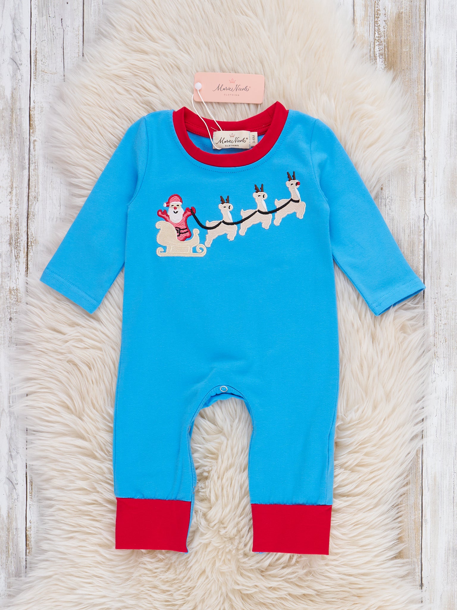 The Reindeer Night Christmas Embroidered Romper by Marie Nicole features a soft, long-sleeve design with a festive sleigh and reindeer embroidery across the chest. This cozy romper is styled with solid color ribbed cuffs at the sleeves and ankles, making it both comfortable and cheerful for all your holiday celebrations