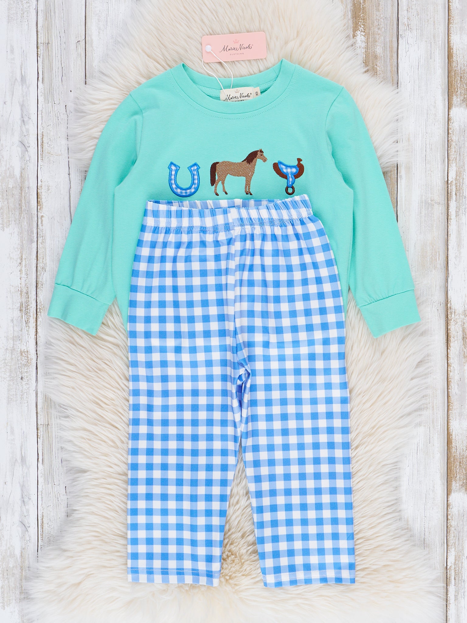Horse around in style with this playful Horsing Around Embroidered Gingham Outfit. This outfit features a teal top with an adorable embroidered horse motif and comfy blue gingham pull-on pants. Perfect for horse-loving boys, this outfit by Marie Nicole Clothing is both stylish and fun!