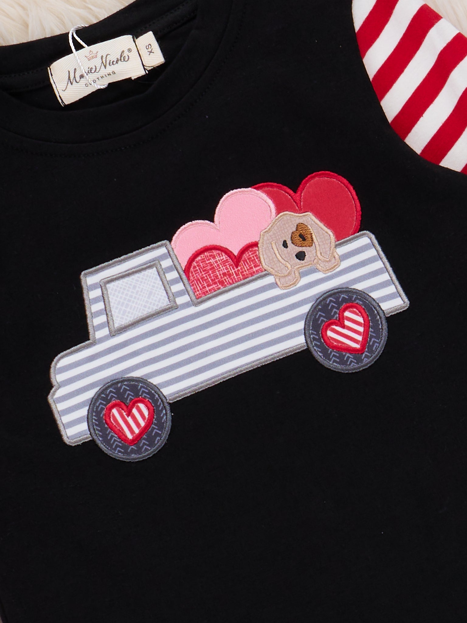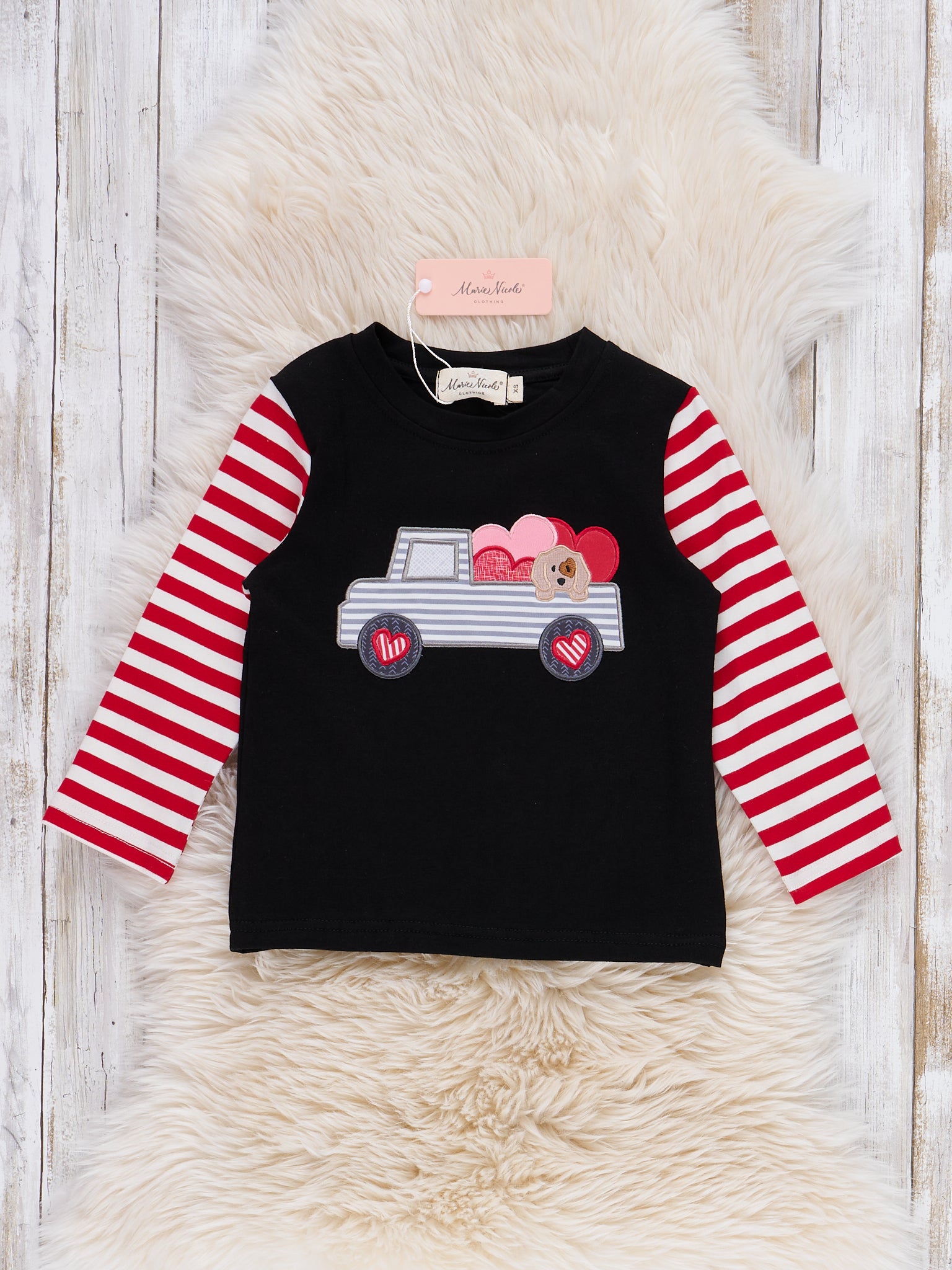 Love on Wheels Embroidered Shirt by Marie Nicole Clothing showcases a playful truck loaded with hearts on the chest, complete with lively striped sleeves for extra charm. This top is perfect for adding a festive, adventurous spirit to everyday outfits, and makes a standout piece for special occasions, Valentine's Day, or casual celebrations of love-filled moments.