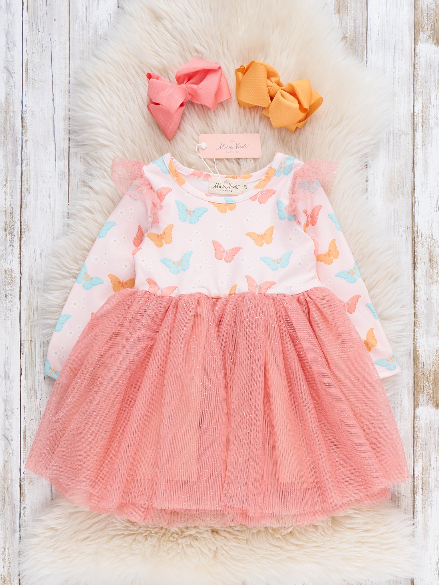Butterfly Garden Whimsy Tulle Dress by Marie Nicole Clothing features a soft, long-sleeve bodice with charming butterfly prints and delicate tulle ruffles at the shoulders. The full, peach-toned tulle skirt brings playful elegance, making this dress perfect for spring outings, garden parties, or twirling celebrations.
