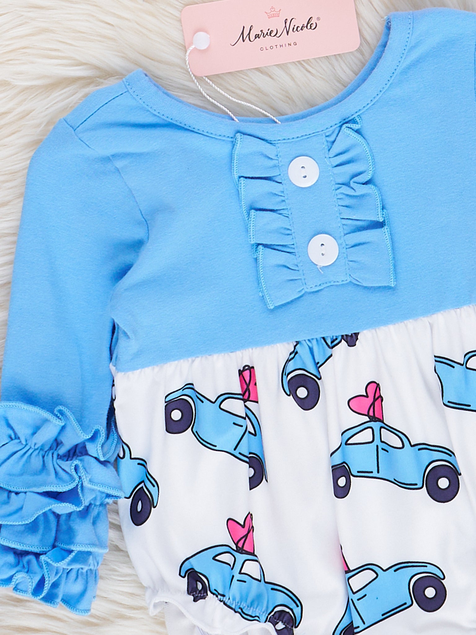 Introducing the perfect treat for Valentine's Day! Our Blue Carry My Heart Ruffle sister set by Marie Nicole Clothing features the perfect combo of blue icing ruffle sleeves and a blue car carrying a bright red heart. Show your sis you care - no words needed!