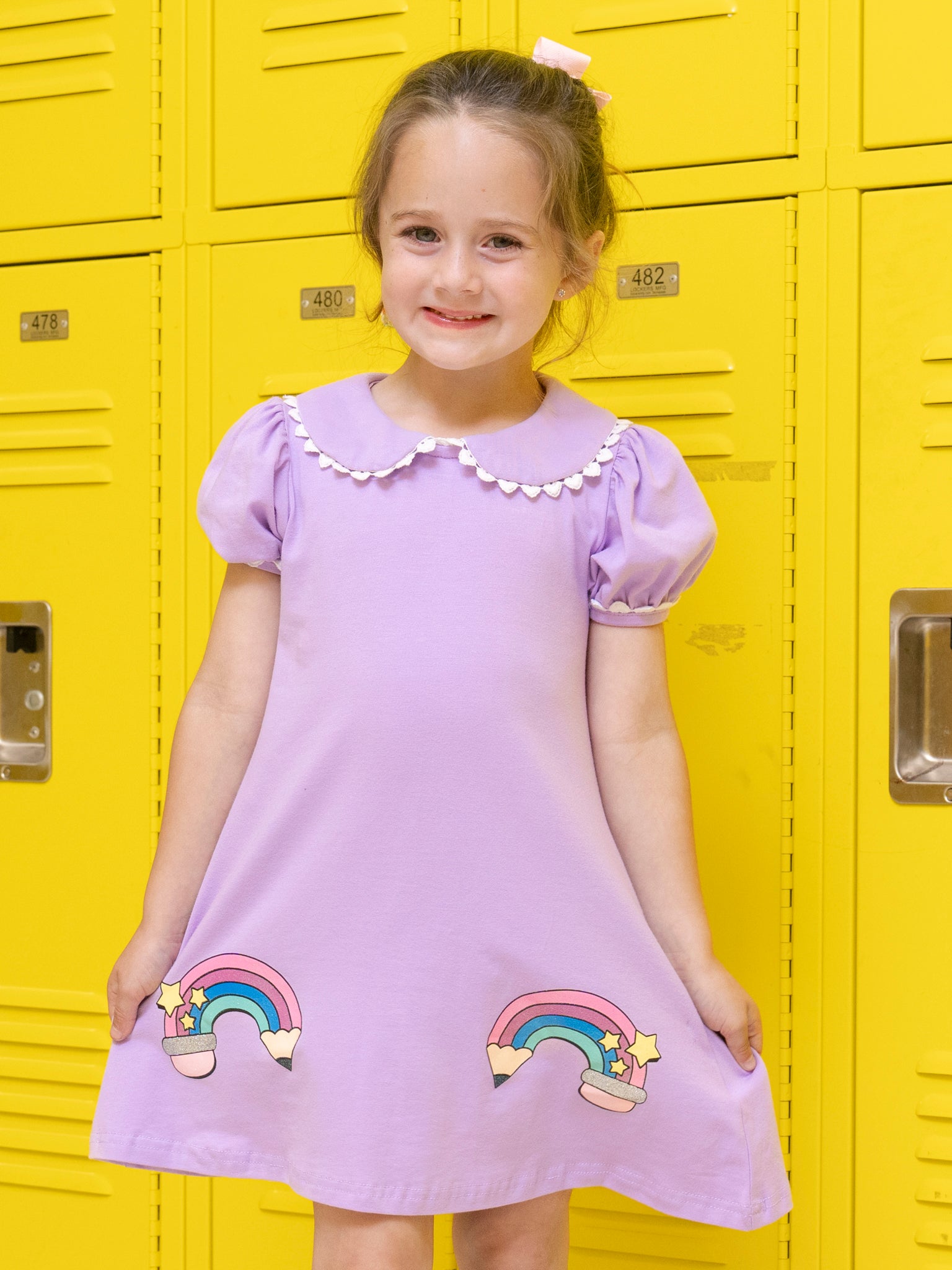 The Rainbow Pencils Dress is a bright and cheerful choice that’s perfect for school days, art time, or any day full of color and creativity. Featuring a playful rainbow pencil print and finished with sweet peter pan collar, this dress from Marie Nicole Clothing brings fun and flair to her everyday wardrobe. Soft, lightweight, and easy to wear, it’s made for little ones who love to learn, play, and stand out in style.