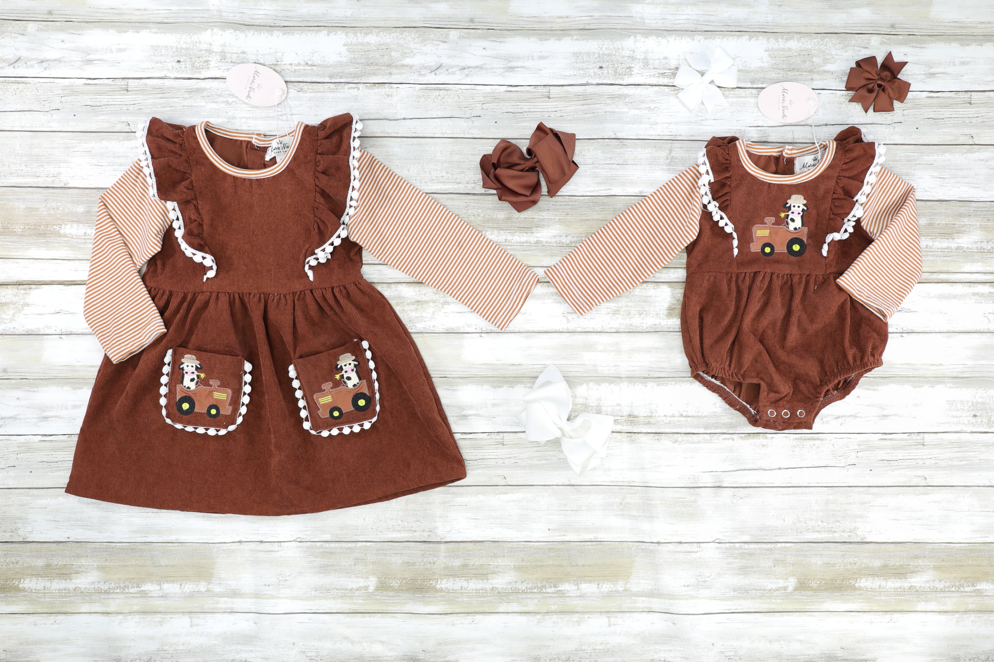 A farming cow? YES! This aMOOsing set has something for all the kiddos! This brown romper features striped raglan sleeves, flutter trim, a cow on a tractor detail, & pom pom trim.