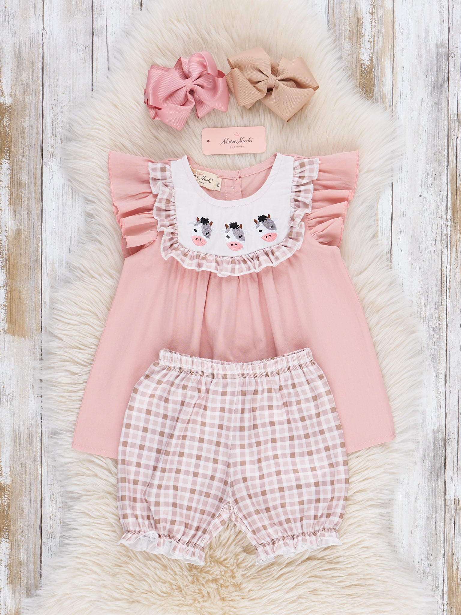 Get ready to moo-ve in style with this Embroidered Cows Ruffle Bib Outfit! The soft pink ruffle top and gingham ruffle hem shorties will keep your little one comfortable while the adorable embroidered cow design adds a touch of whimsy. Perfect for sisters or a fun, coordinated look. By Marie Nicole Clothing.