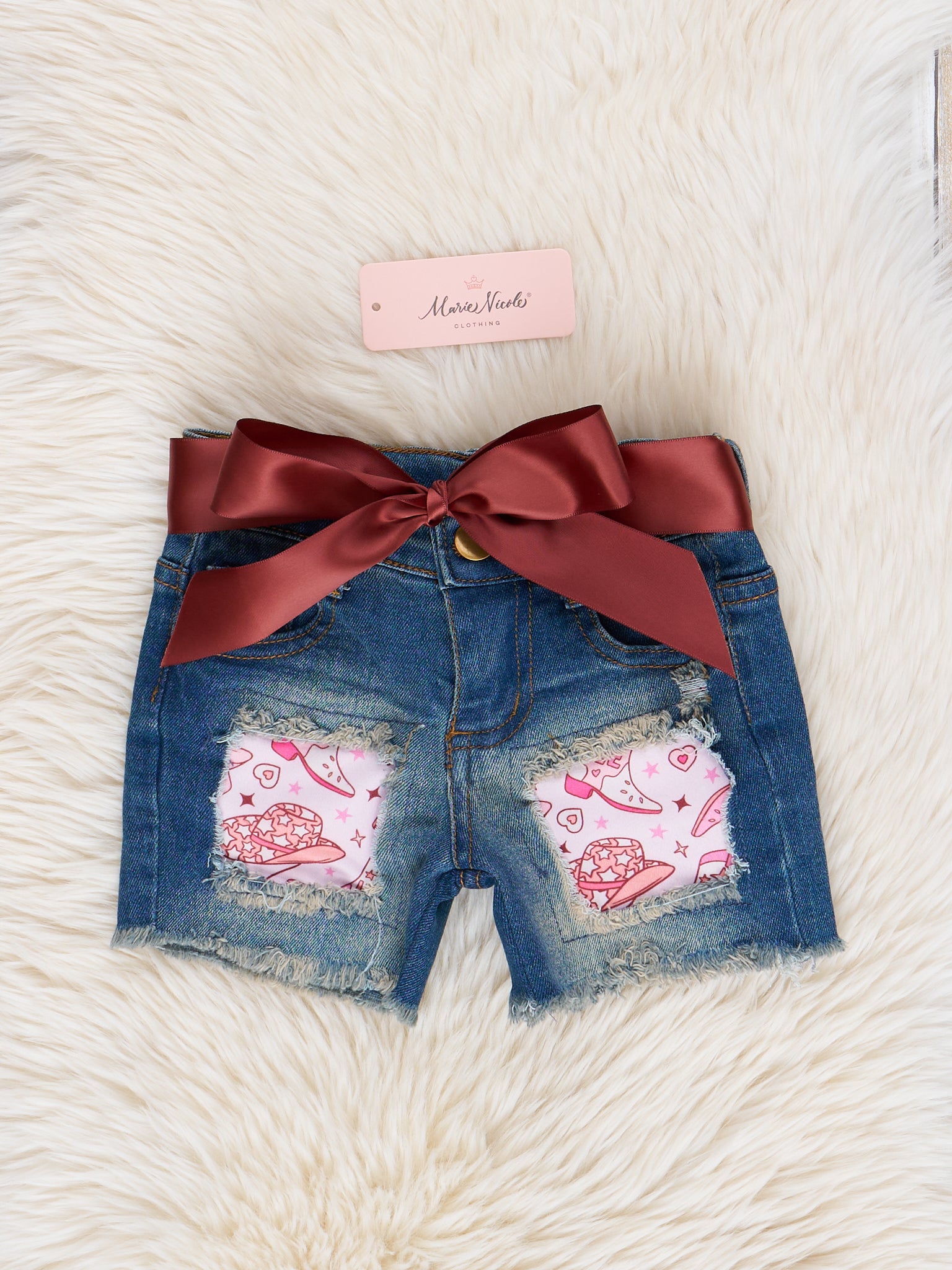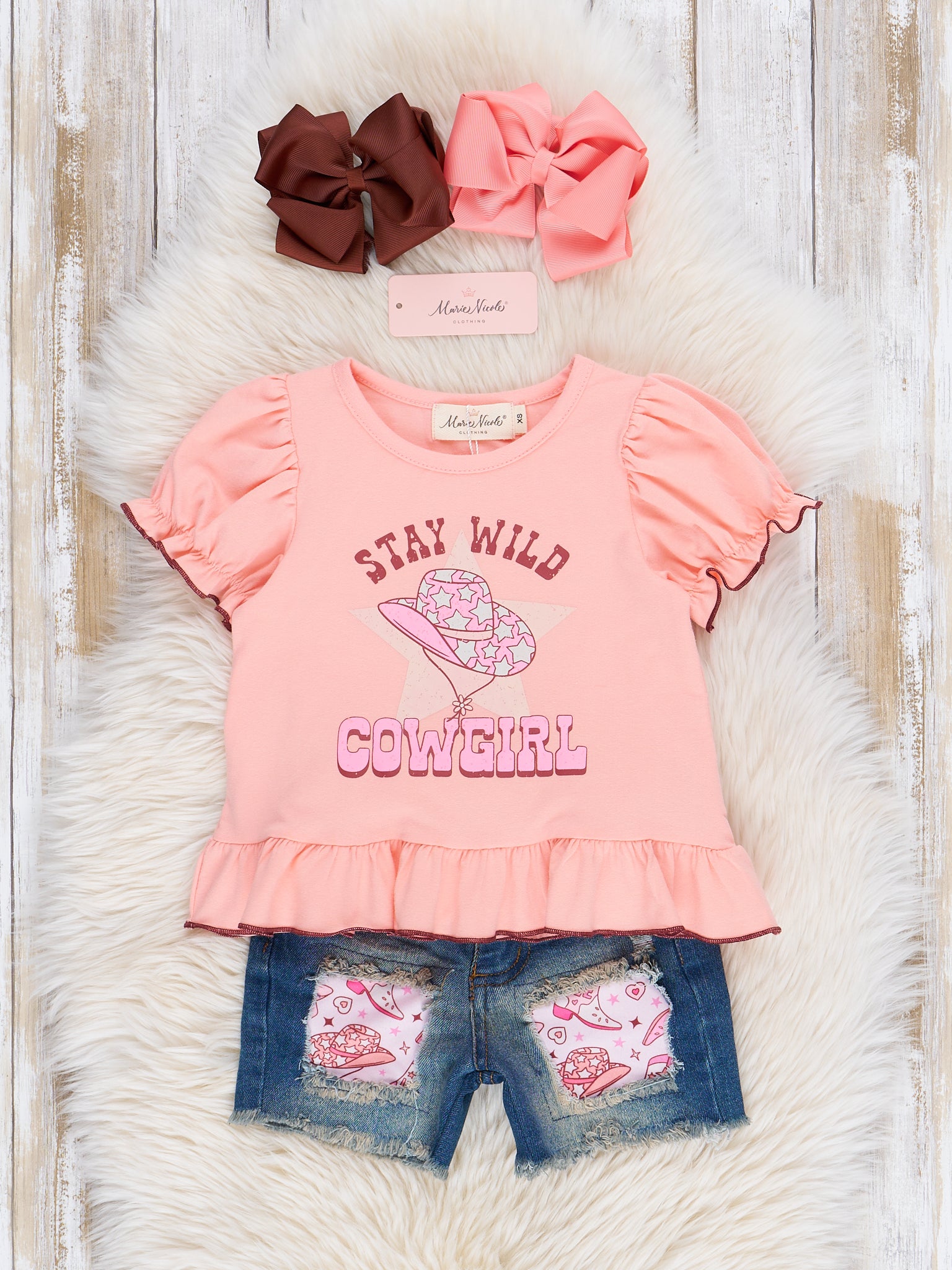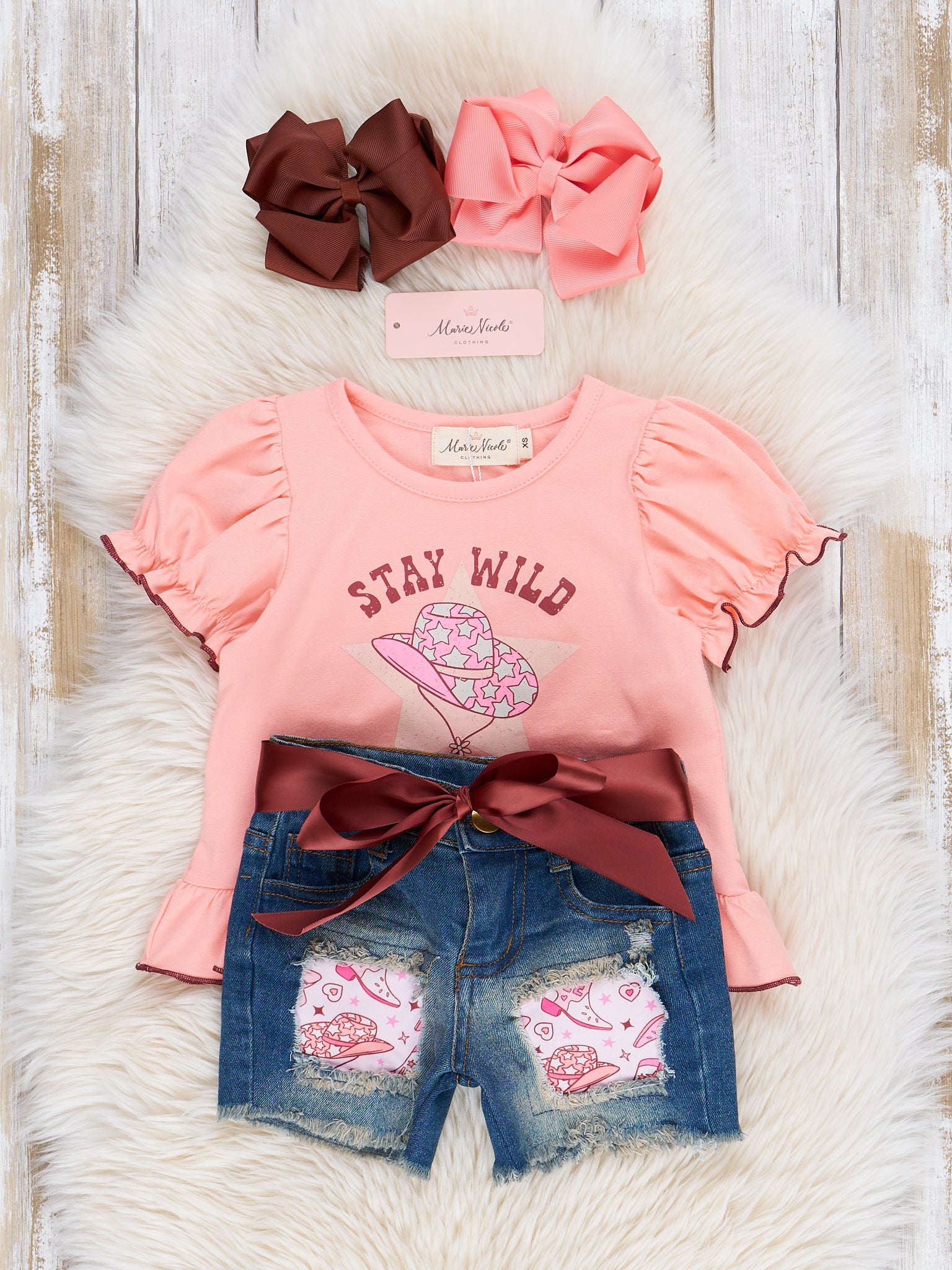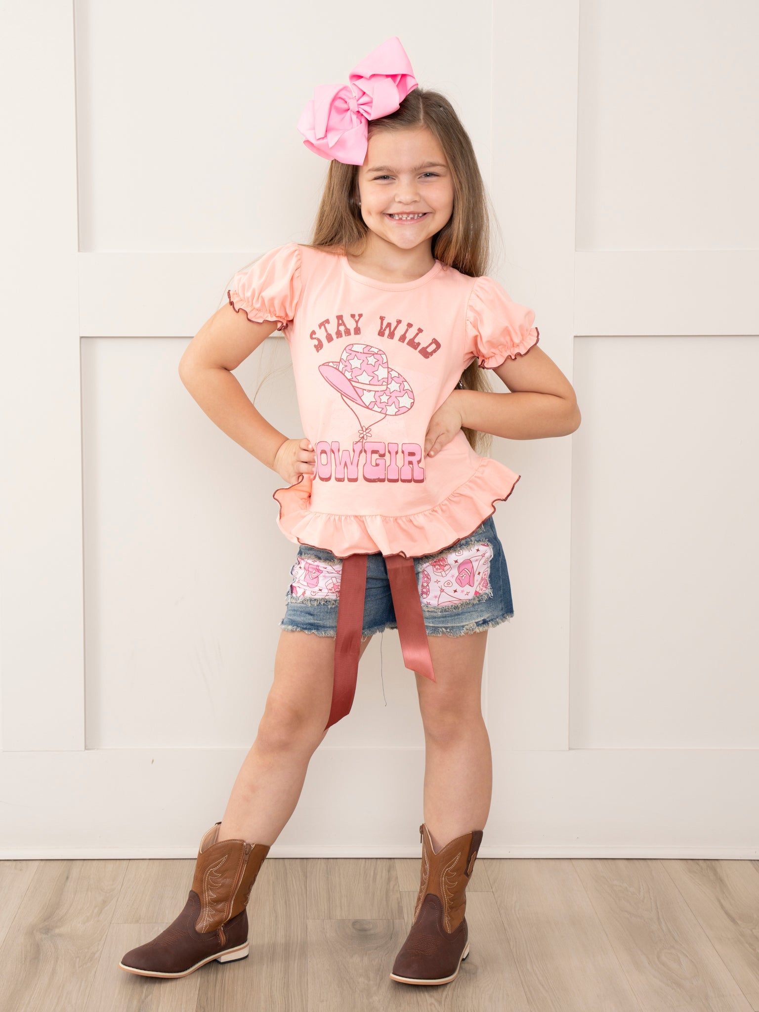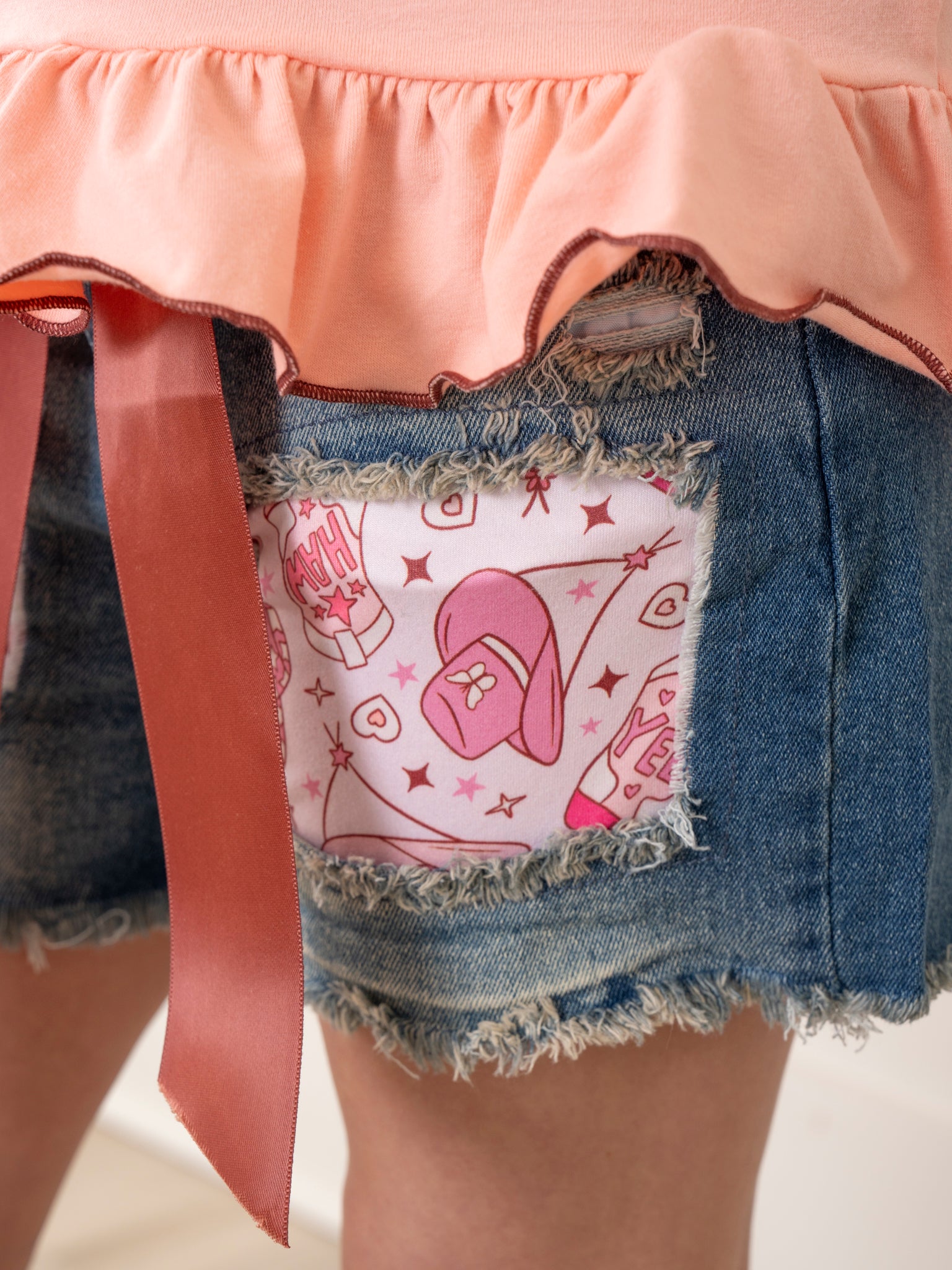 Yeehaw! This Peach Cowgirl Ruffle Denim Outfit is perfect for your little wild child. The ruffle top adds a touch of sweetness, while the ripped denim shorts bring out her inner cowgirl. Don't forget the ribbon bow belt for a fun finishing touch. Stay wild, cowgirl! 🤠