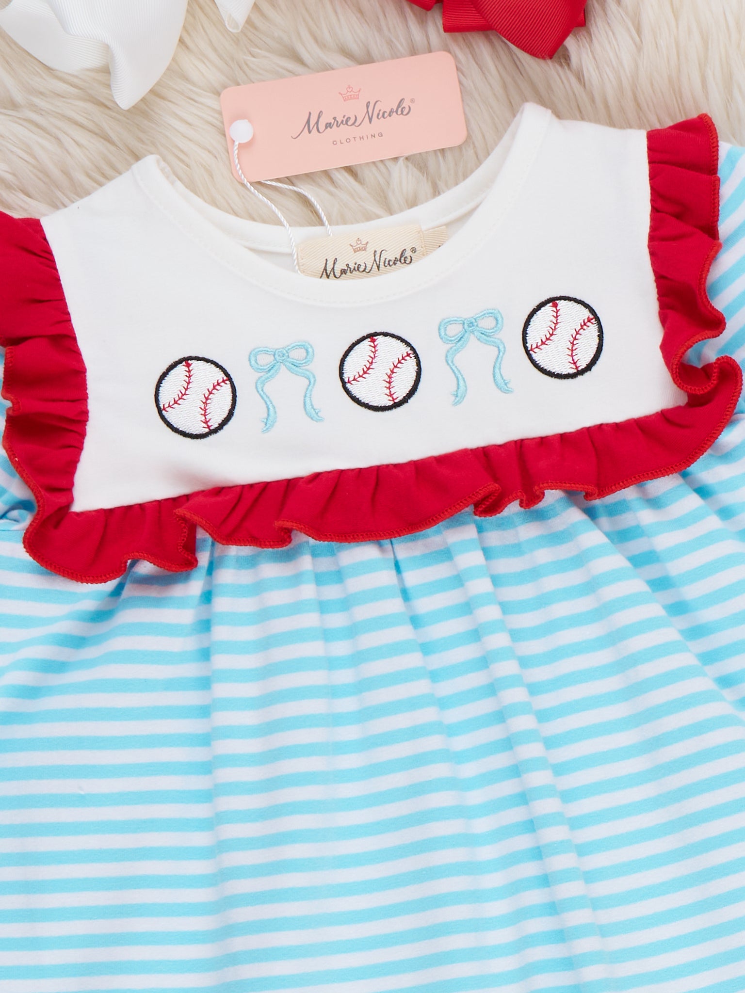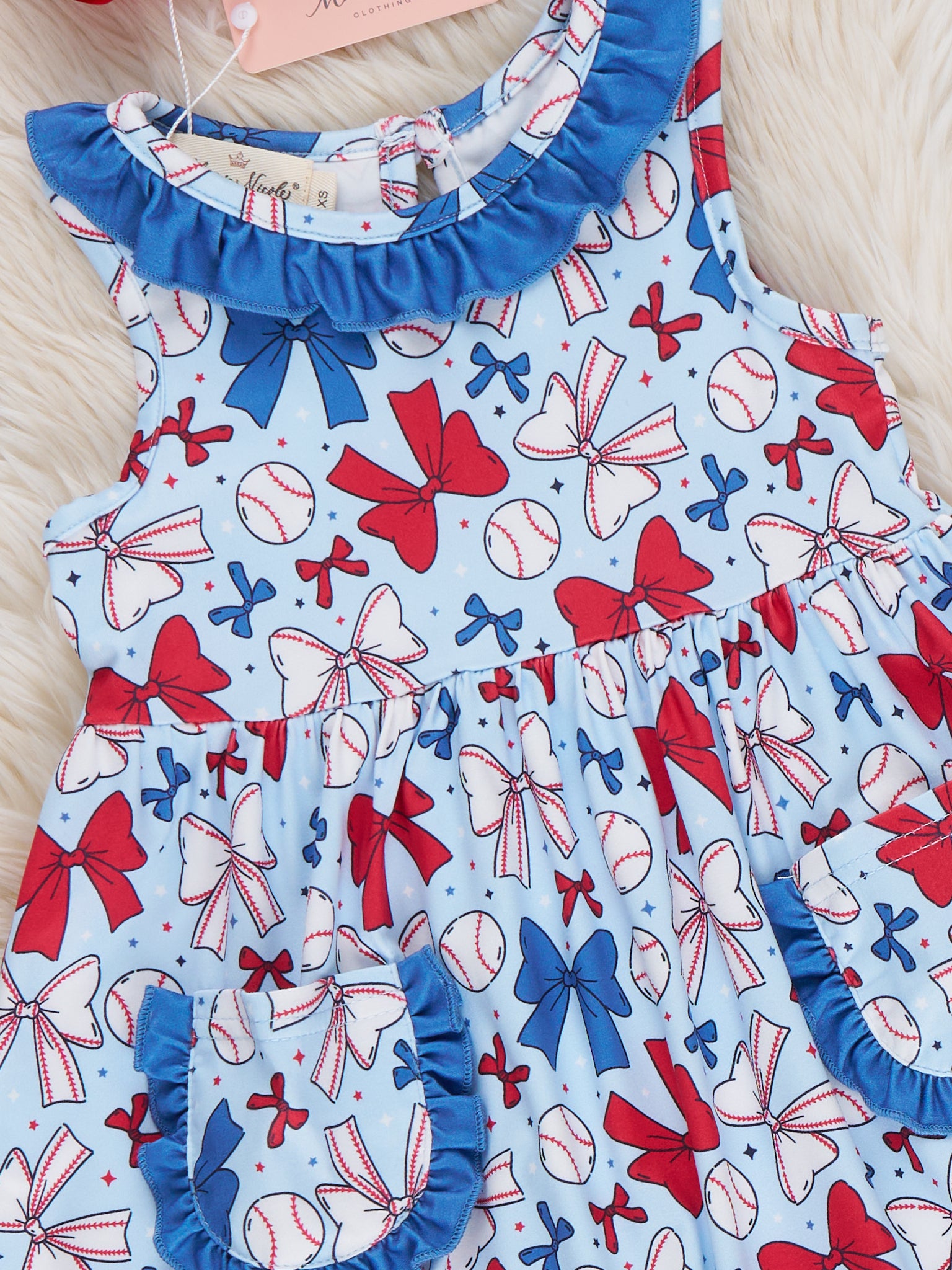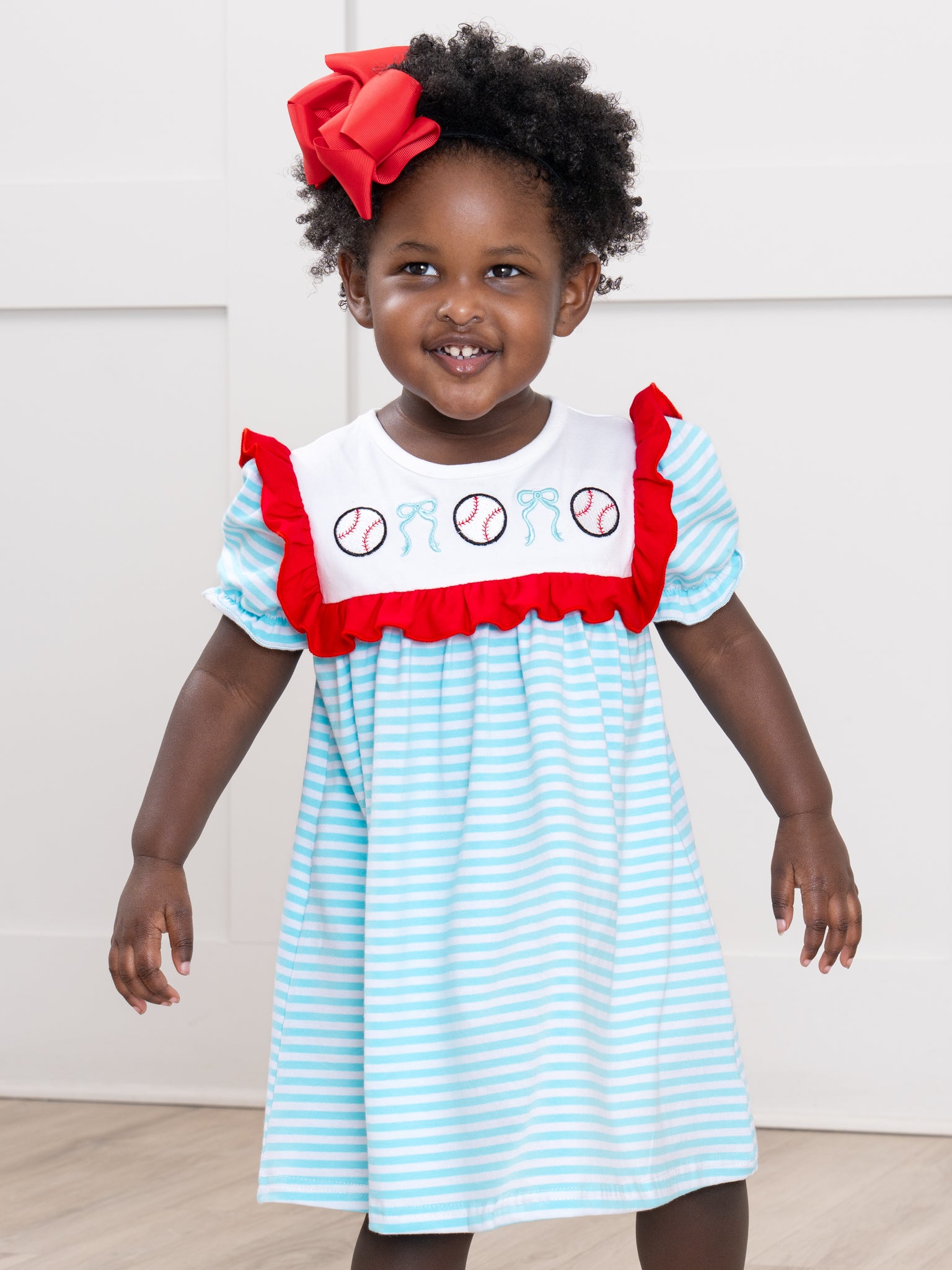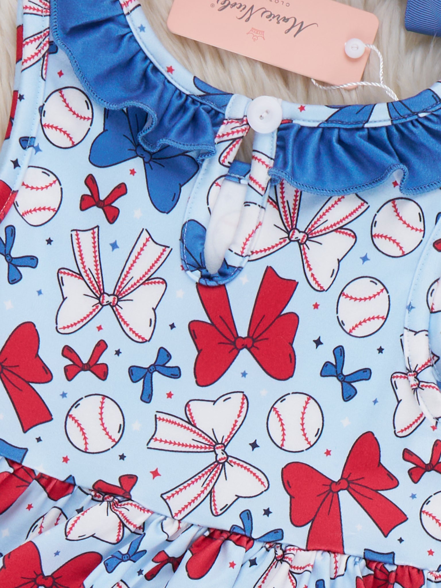 Bow Knot Baseball Embroidered Cotton Ruffle Dress
