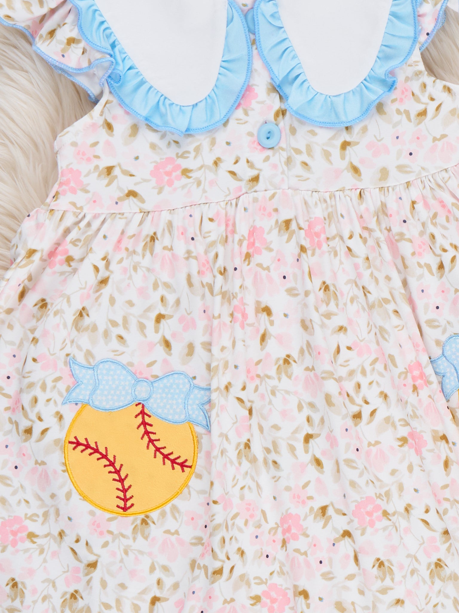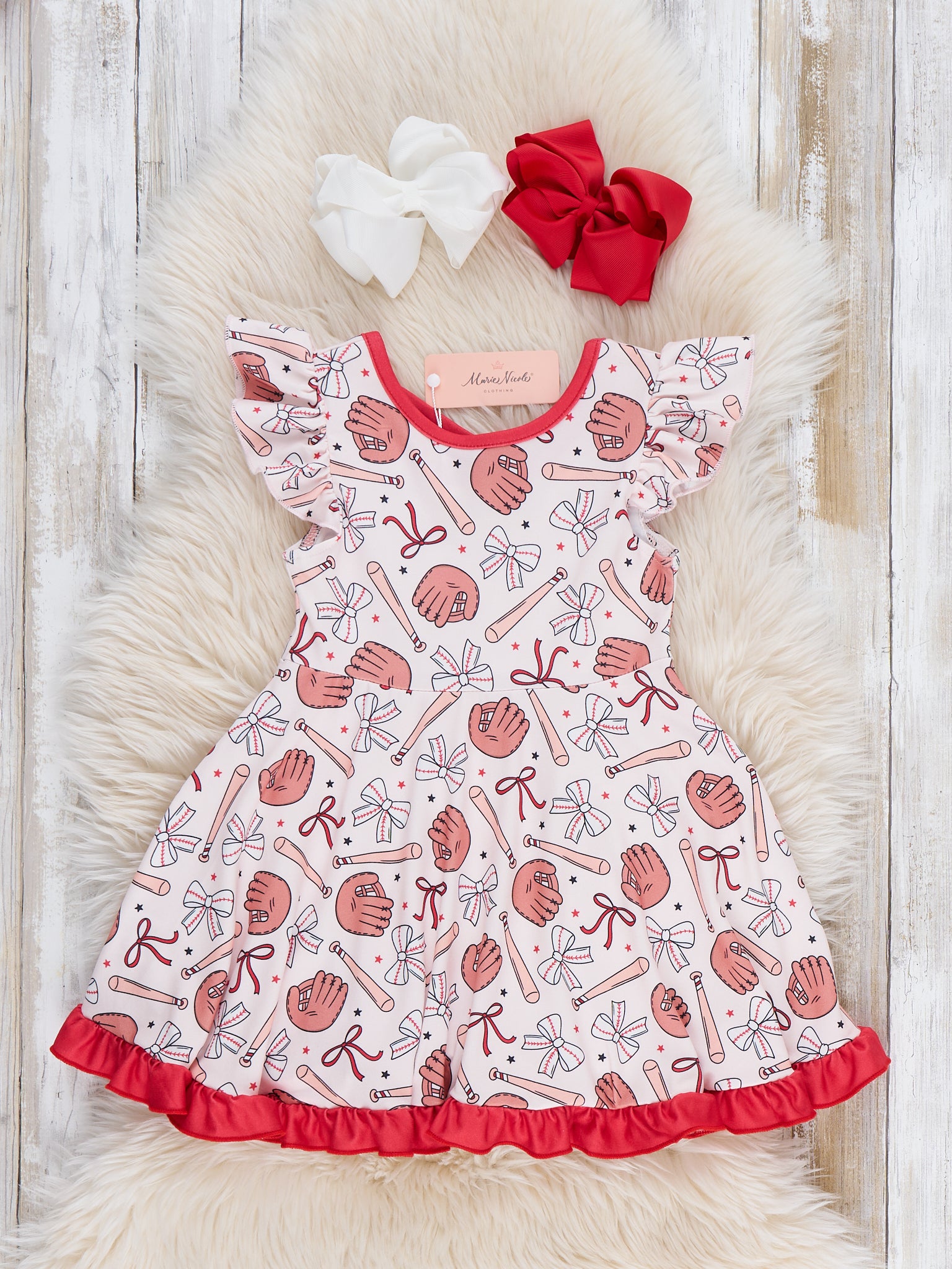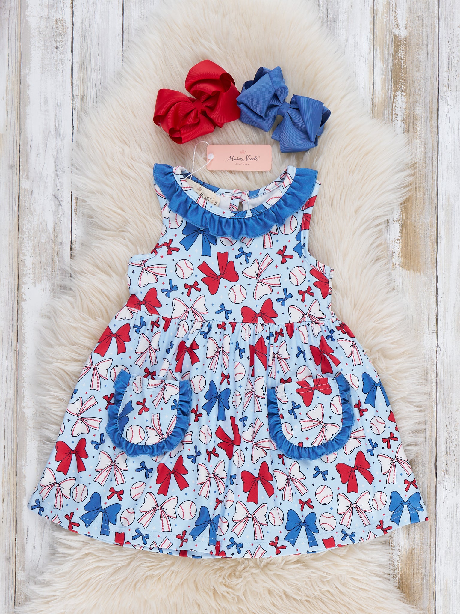 Bow Knot Baseball Embroidered Cotton Ruffle Dress