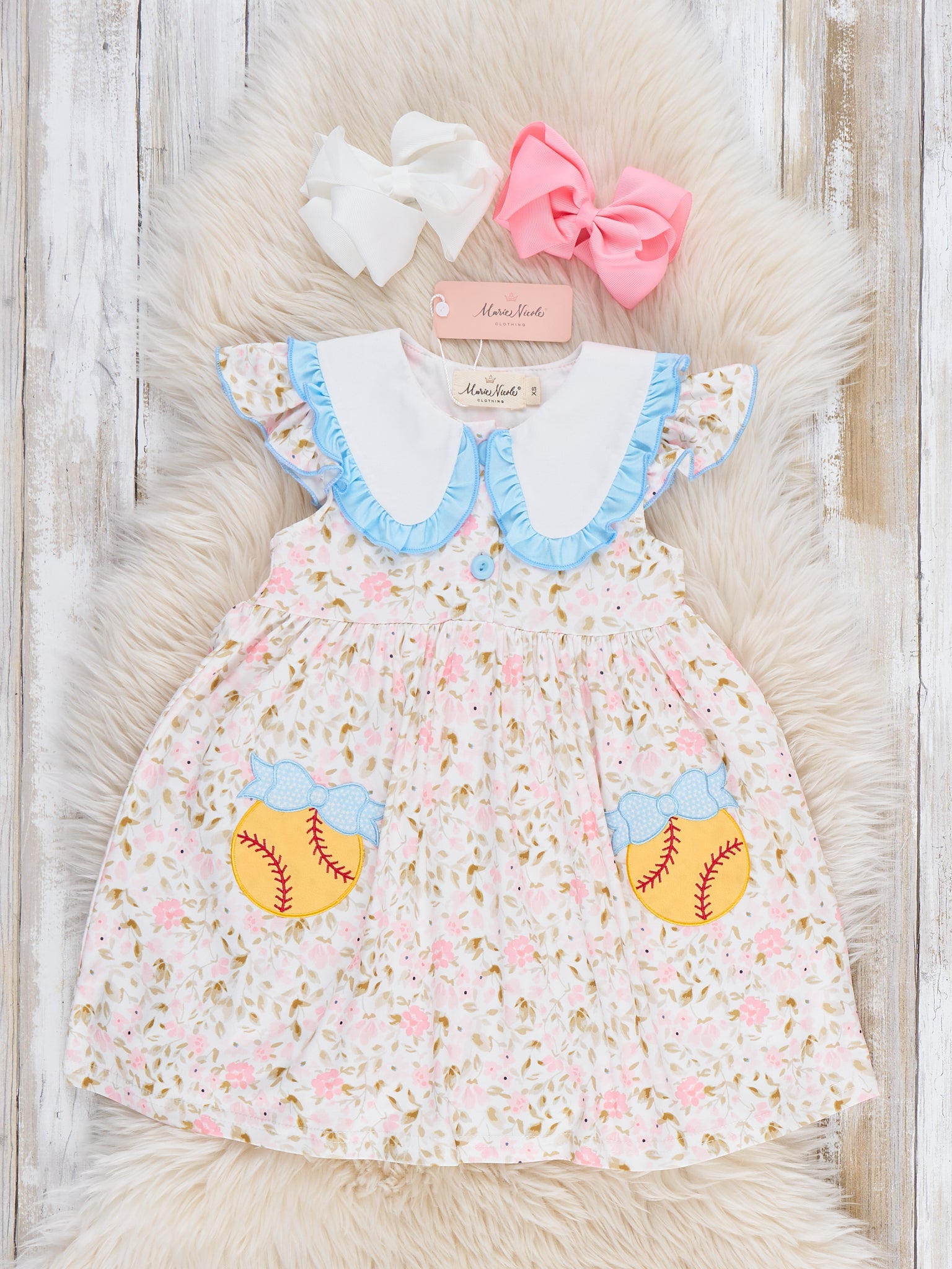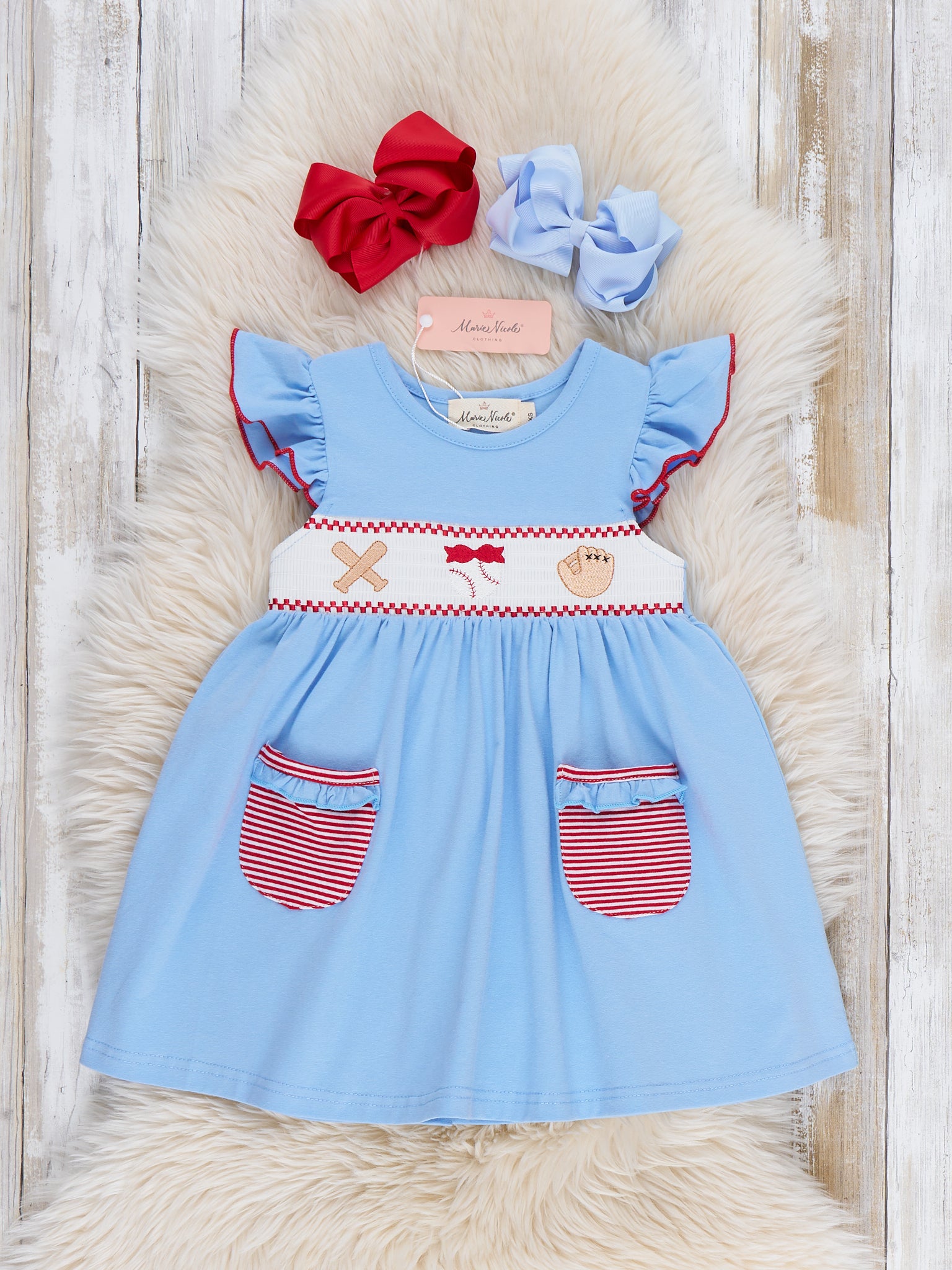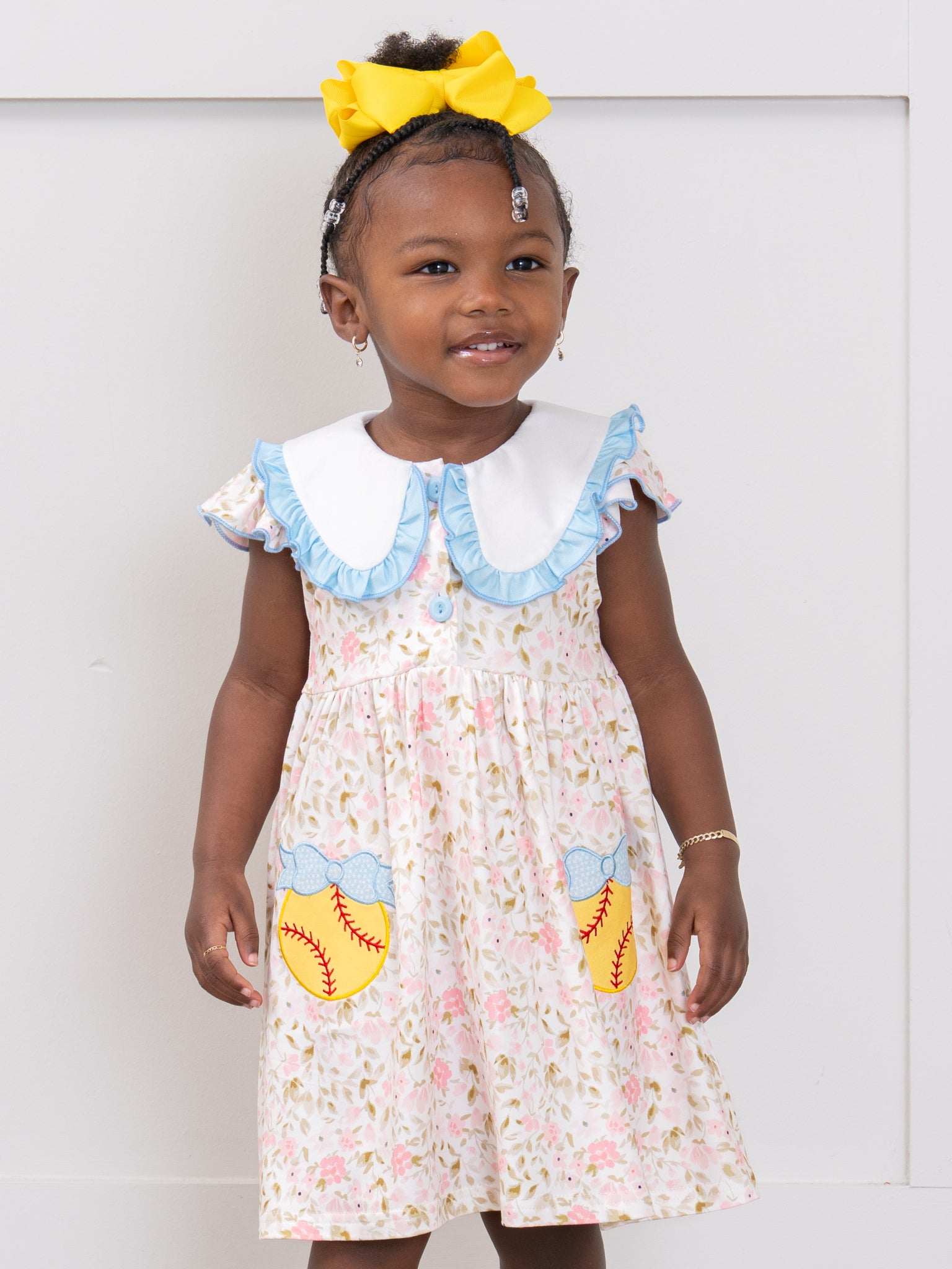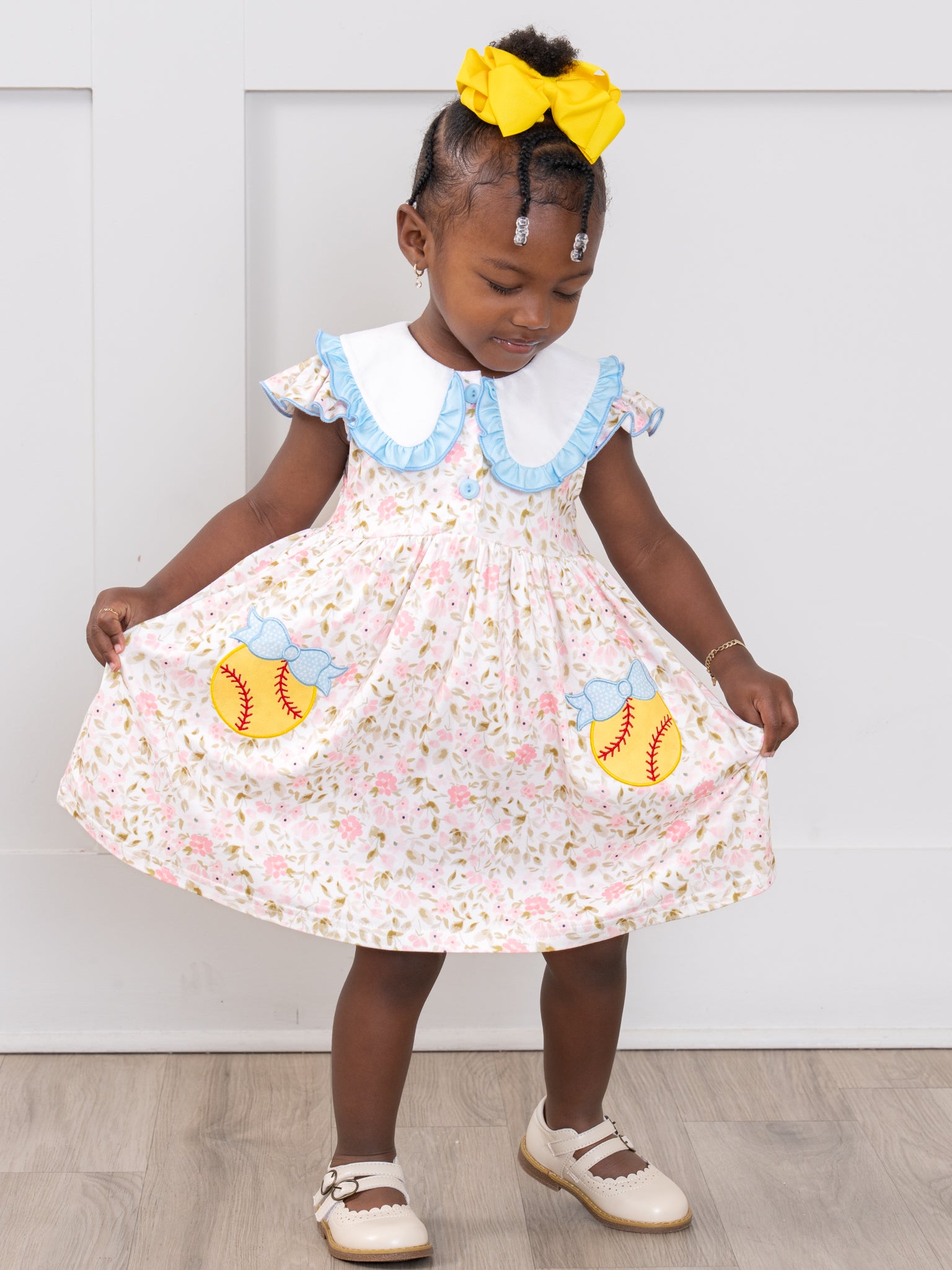 Bow Knot Baseball Embroidered Cotton Ruffle Dress
