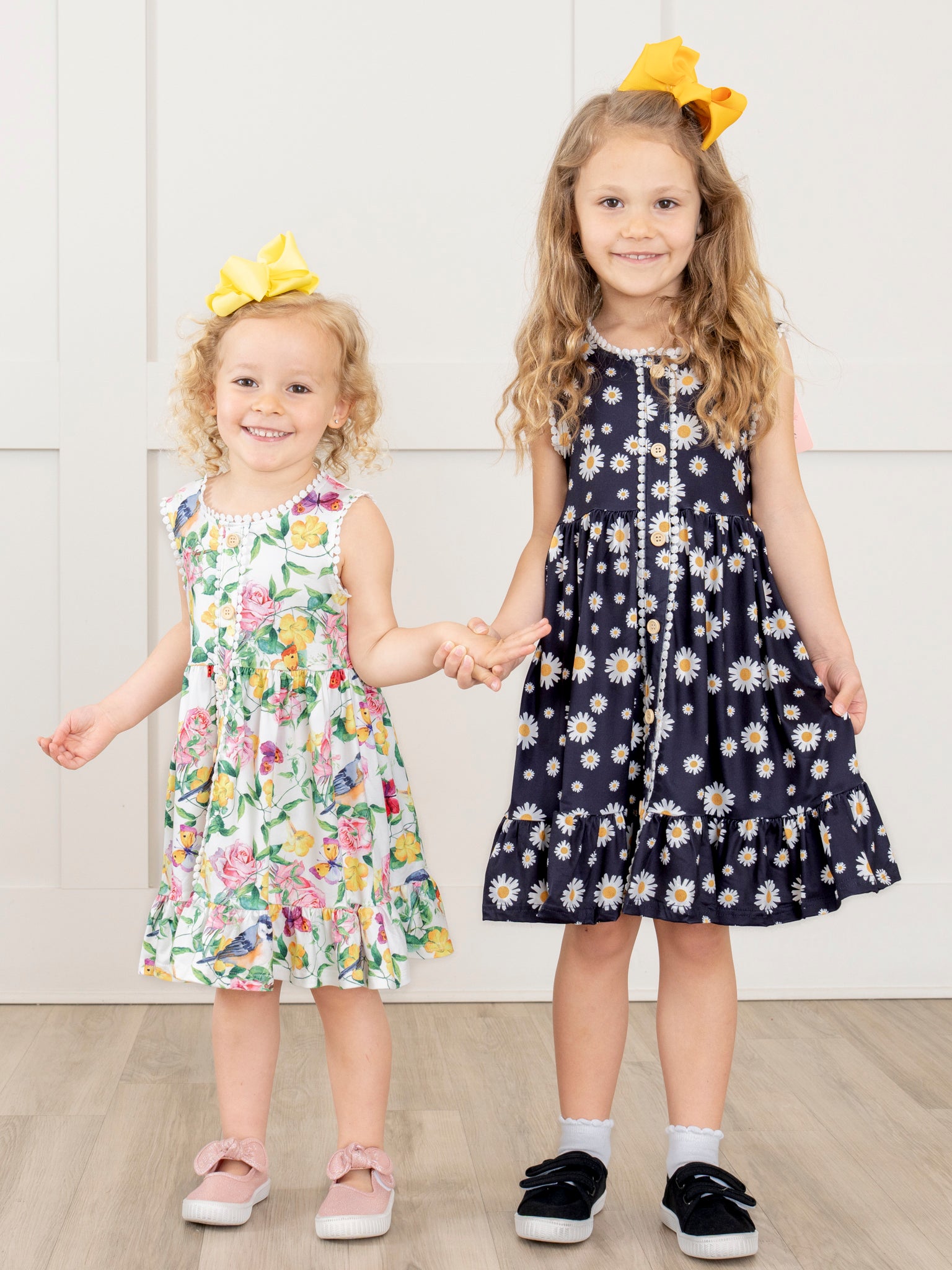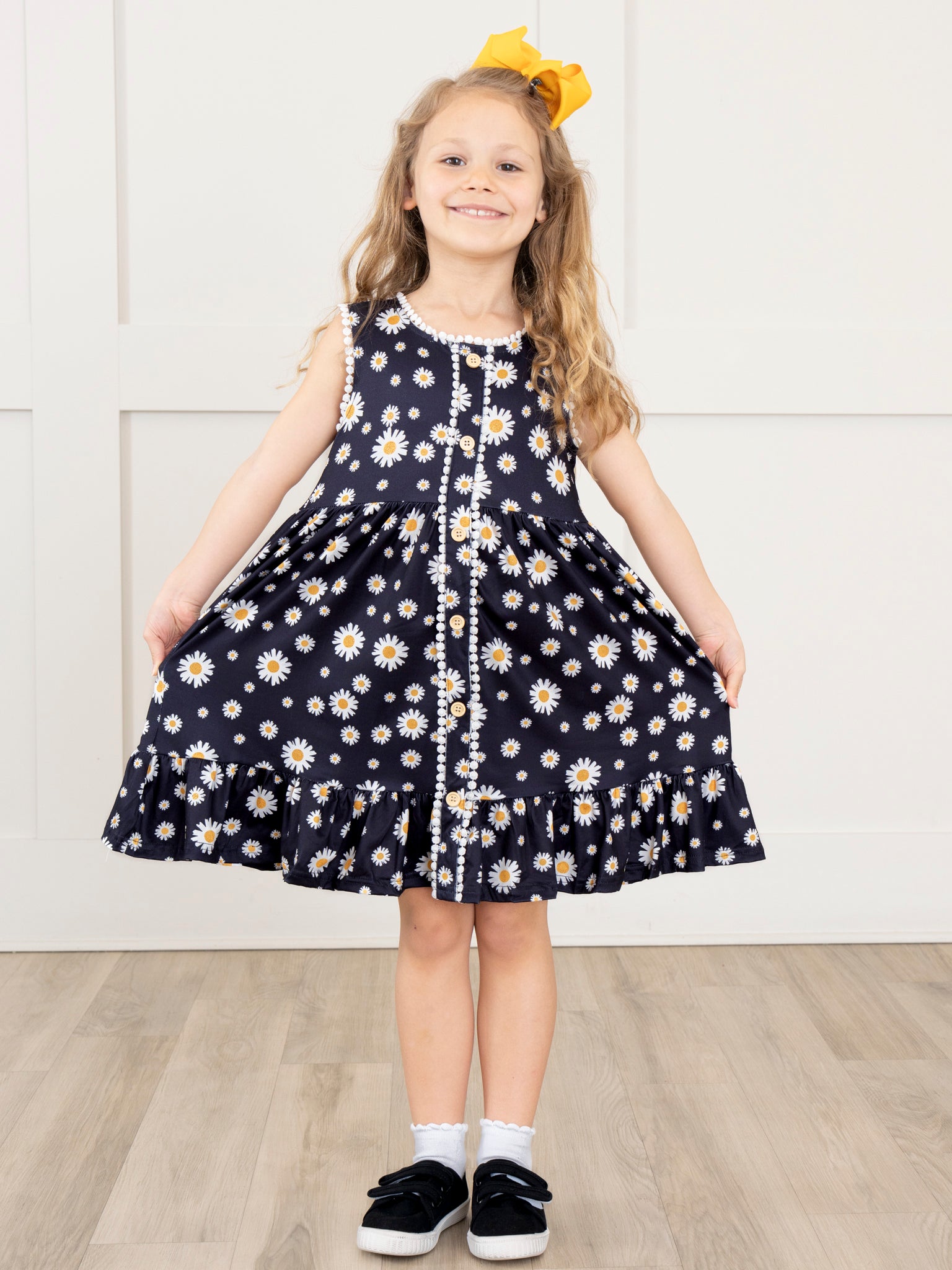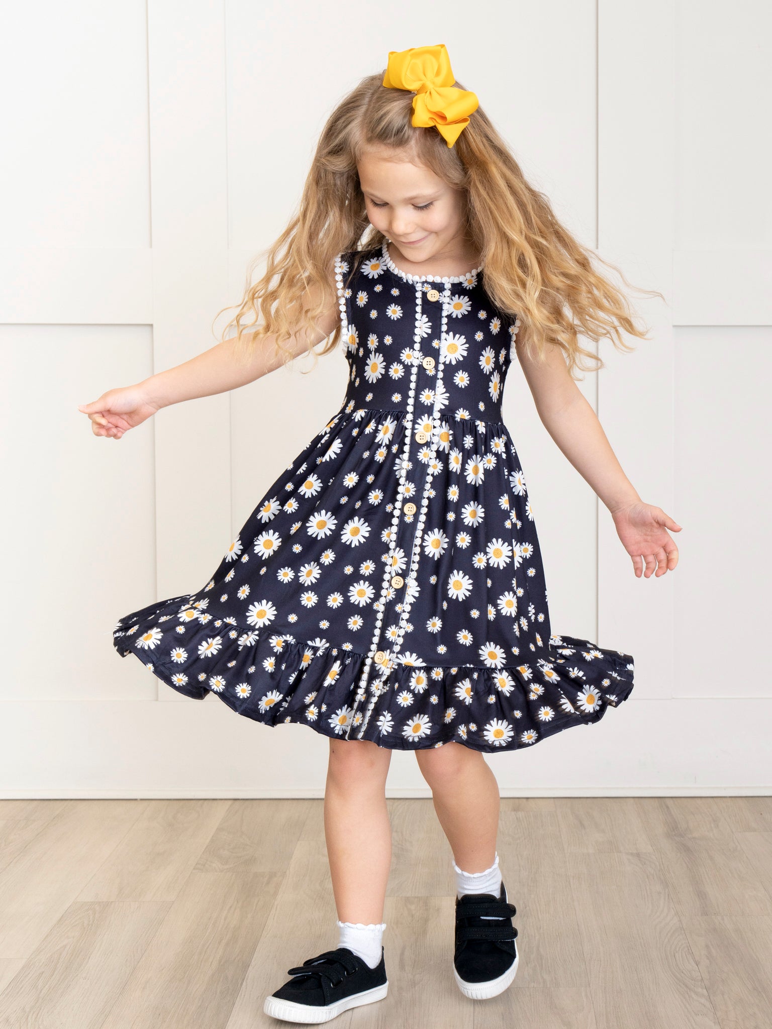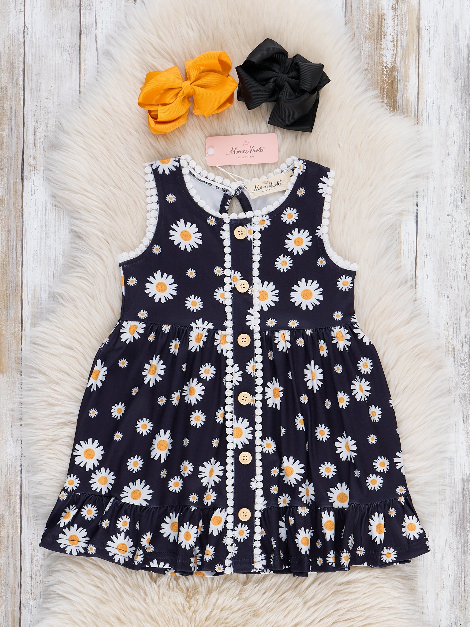 Introducing our playful Button Front Pom Pom Dress in Black Daisy! Perfect for summer, this girls' dress from Marie Nicole Clothing features a black bodice with an allover daisy print and fun pom pom trim. The button front detail adds charming detail, and it comes in more prints to choose from. Sleeveless for cool comfort.
