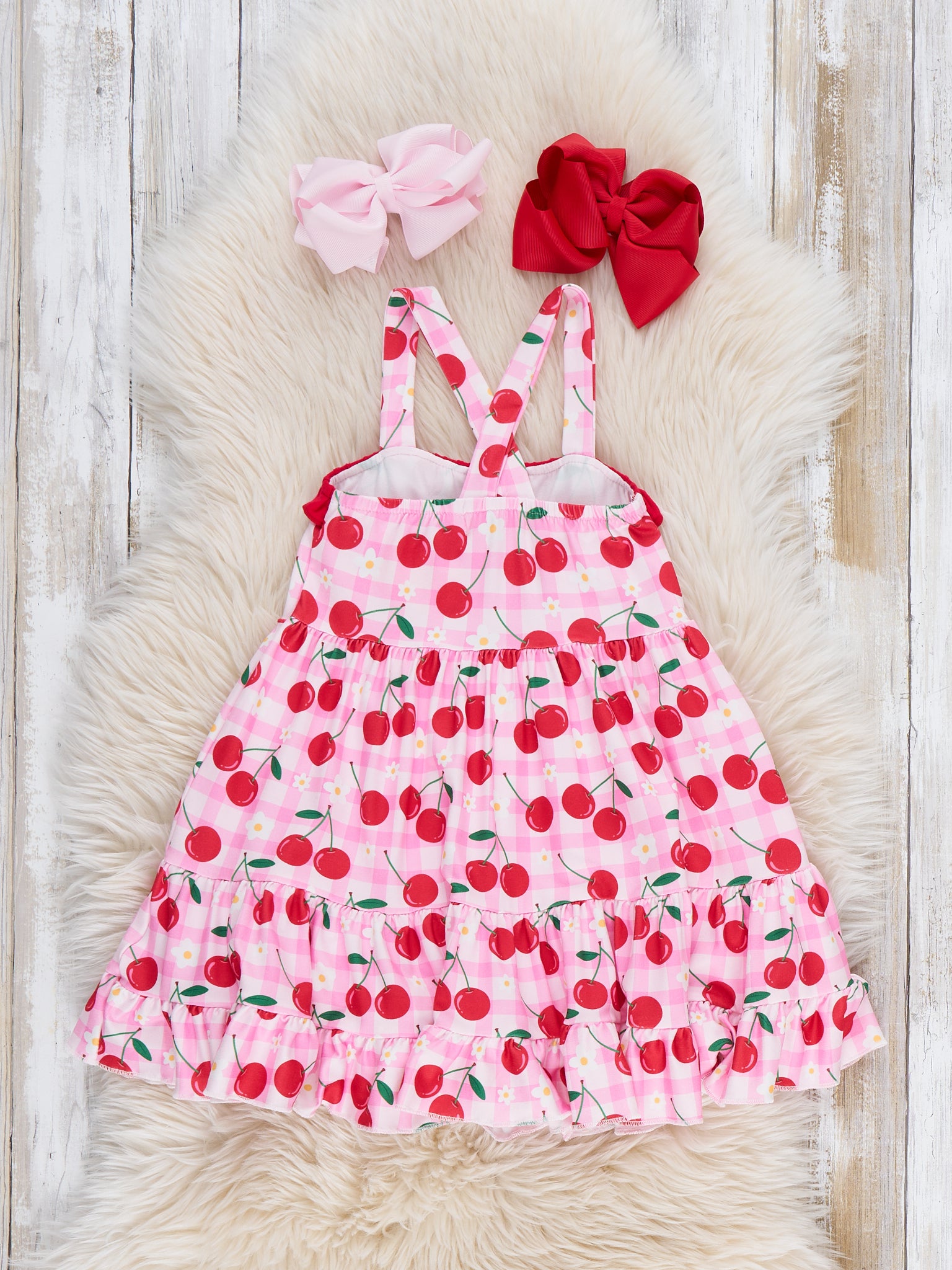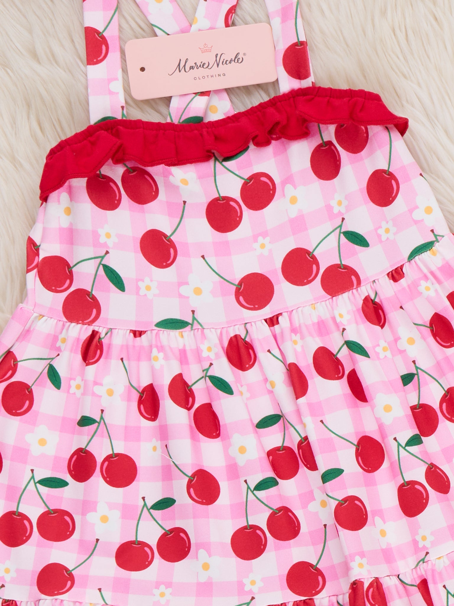 The Cherry Berries Delight Ruffle Dress by Marie Nicole Clothing brings sweet summer vibes with its playful cherry print and frilly hem. The adjustable straps and ruffled details make this dress both charming and comfortable for little ones. Perfect for warm days and casual outings, it’s a delightful addition to any wardrobe.