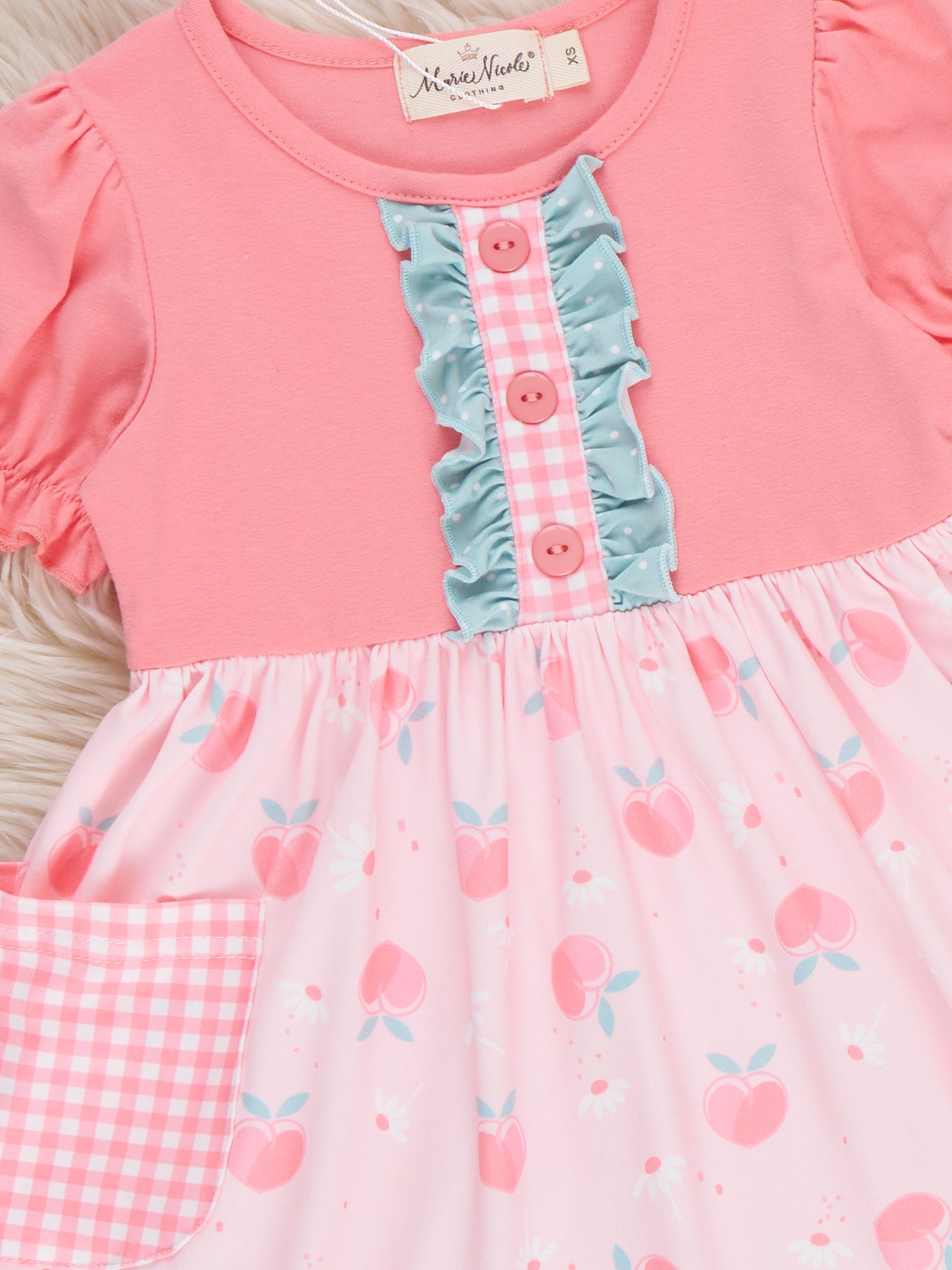 The Peachy Dreams Ruffle Dress by Marie Nicole Clothing combines sweetness and comfort. Featuring a charming peach print and ruffled details, this dress is both playful and comfortable. The gingham pockets add a touch of fun, making it perfect for casual days and sunny outings, offering a delightful and stylish fit for little ones.