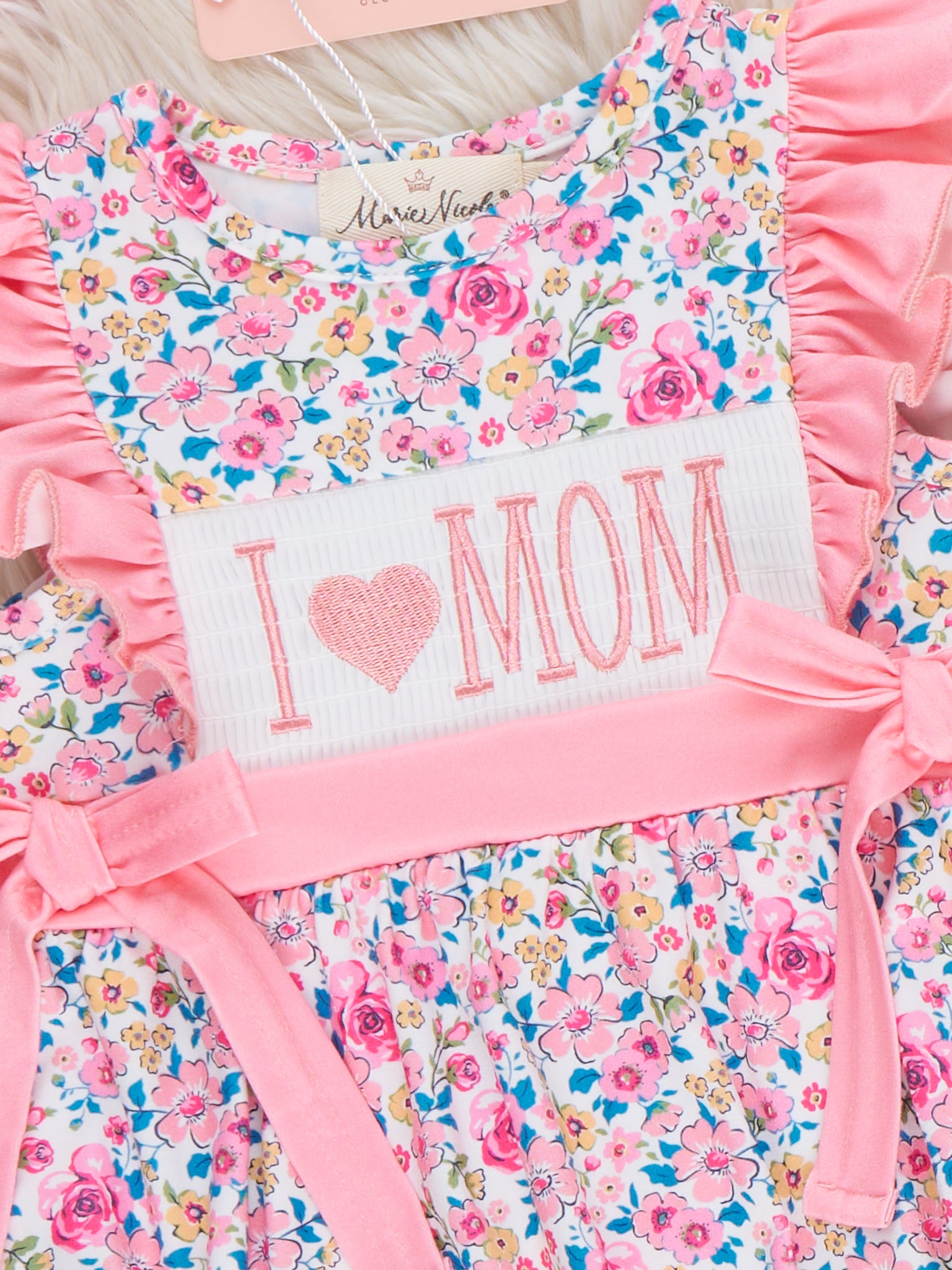 Coral Floral "I Love Mom" Smocked Bubble Romper
