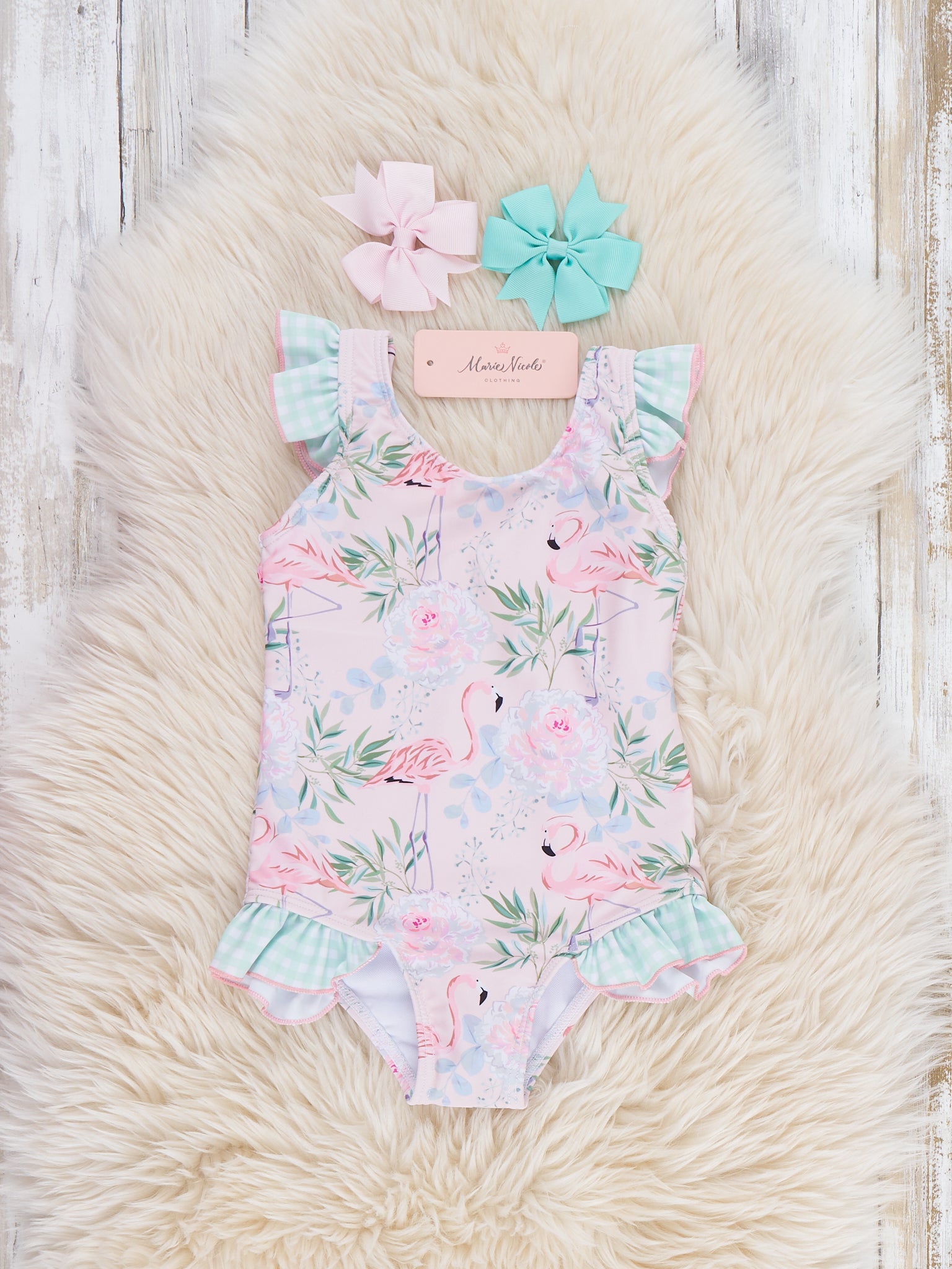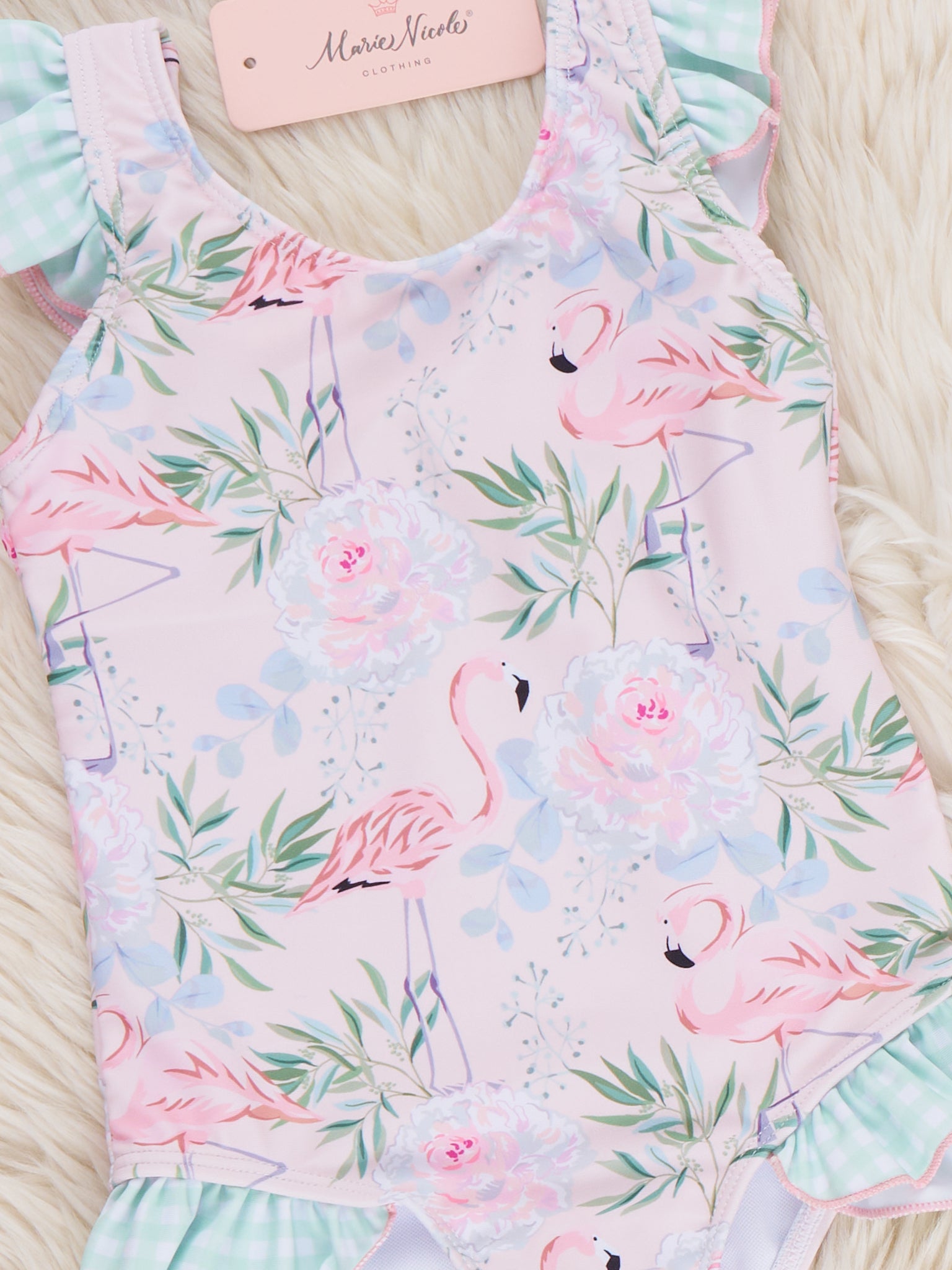 The Flamingo Leaf Ruffle Swimsuit by Marie Nicole Clothing features ruffle tank straps, flamingo and leaf print, and ruffle trim on a stretchy one-piece. It is fully lined for coverage and comfort, great for summer splashes or vacation photos.