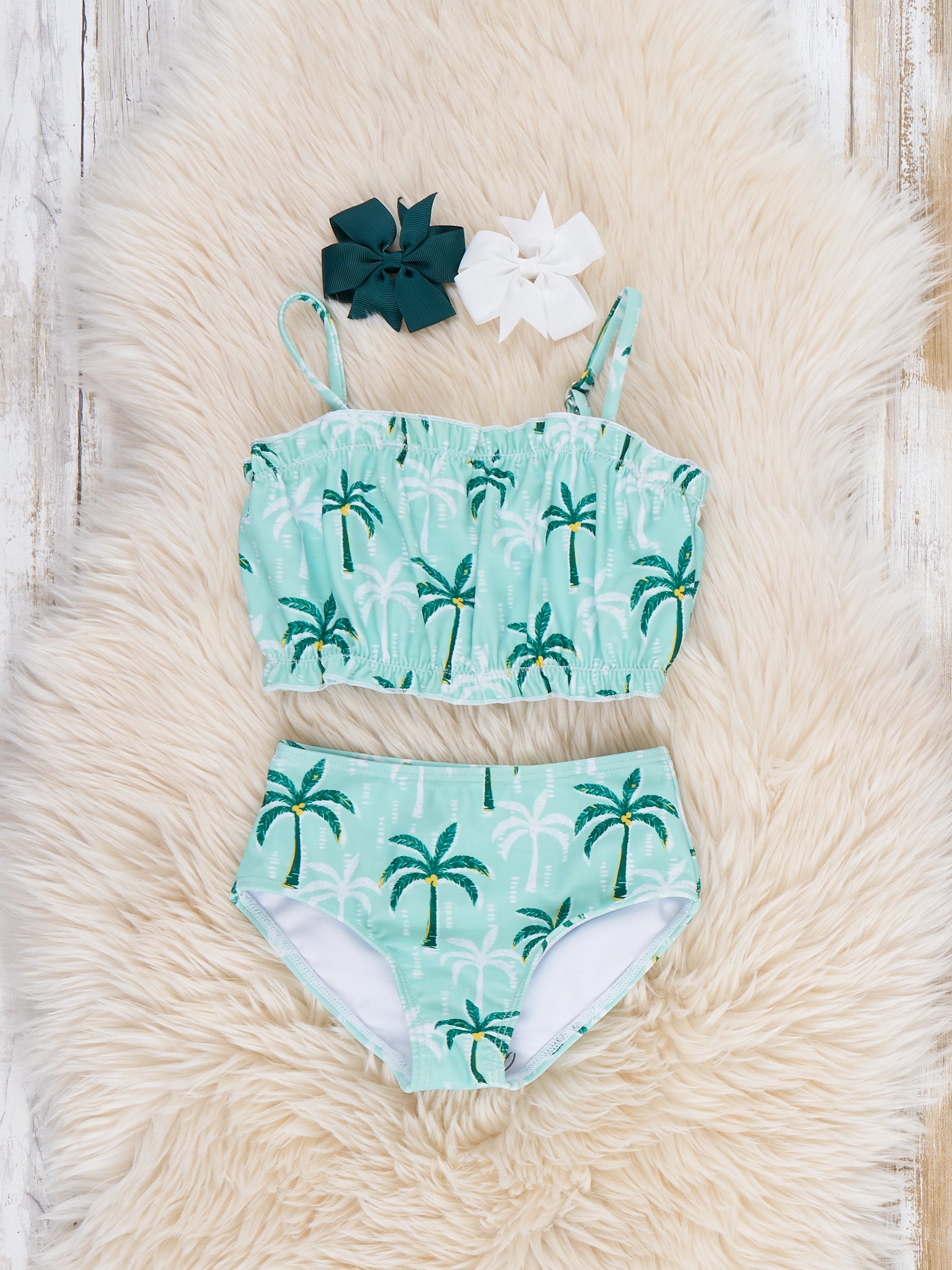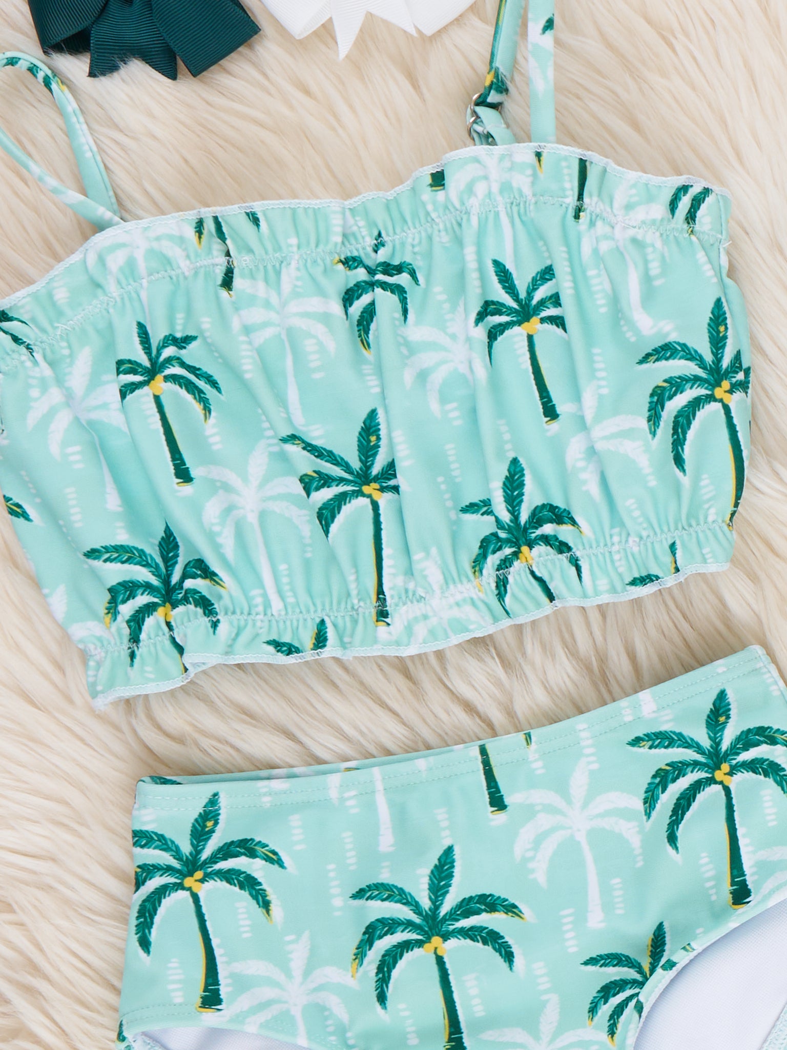 Palm Breeze Swimsuit by Marie Nicole Clothing is a two-piece set featuring a ruched, crop-style top and coordinating high-waist bottoms in an allover palm-tree print. The soft, stretchy fabric and comfy fit make it perfect for sunny beach days, pool time, and matching moments with the coordinating mom suit.