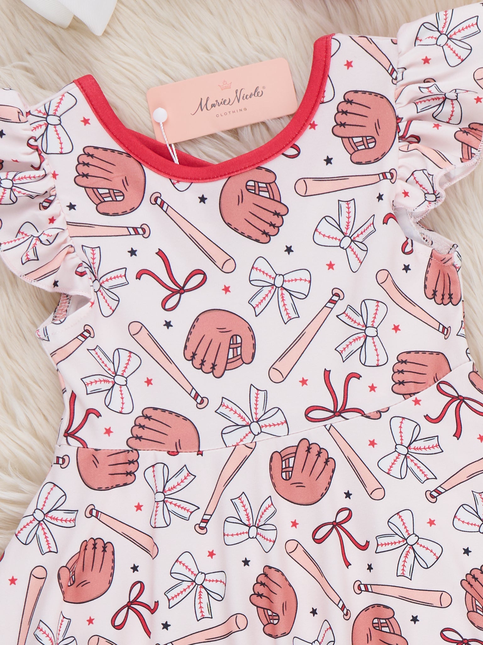 The Ribbon Bat Catch Ruffle Dress by Marie Nicole Clothing brings whimsical charm to little wardrobes. With its playful baseball print and ruffled sleeves, this dress is perfect for active days and casual outings. The vibrant ruffle hem adds a sweet finishing touch, making this dress as fun as it is stylish.