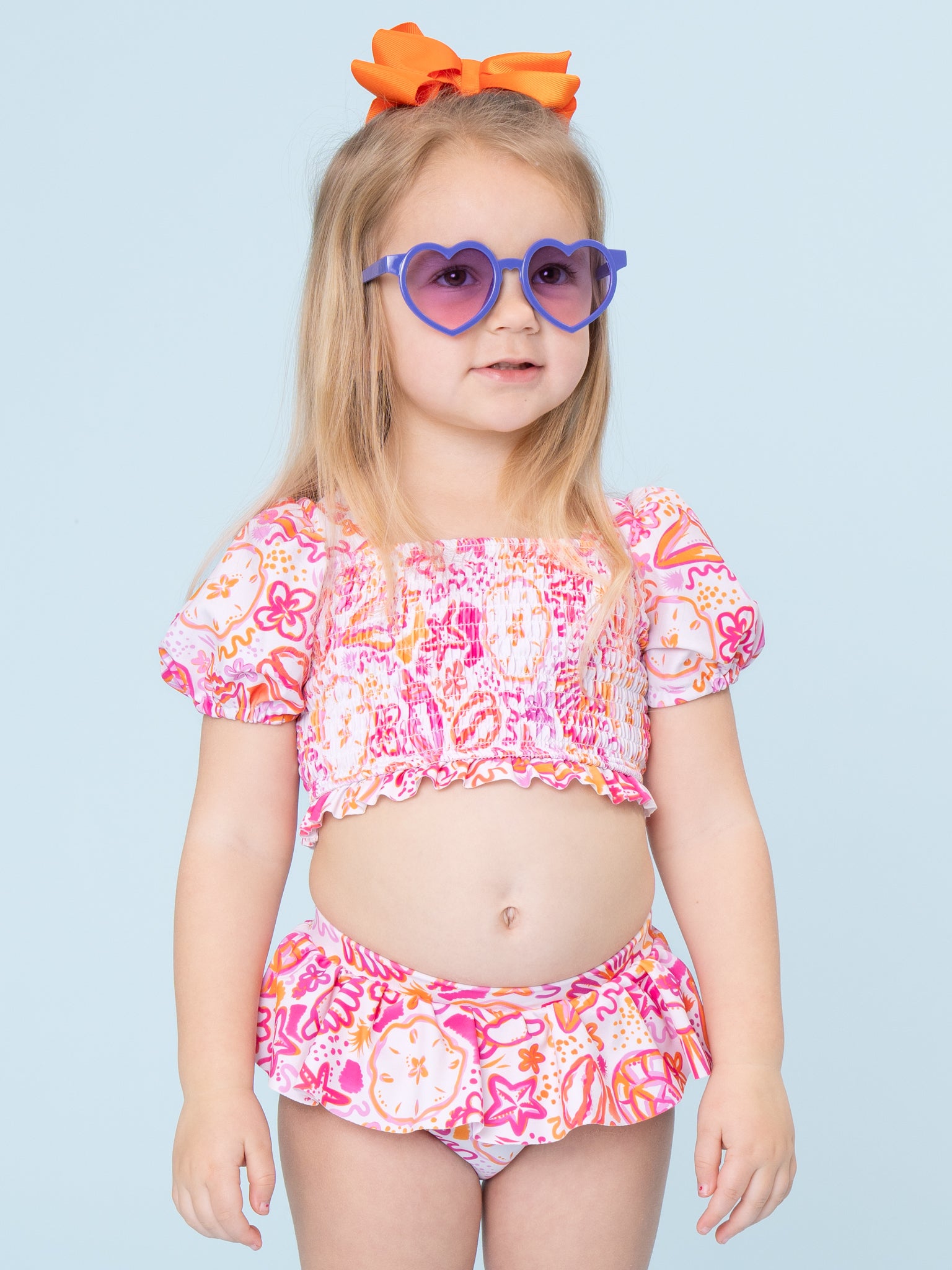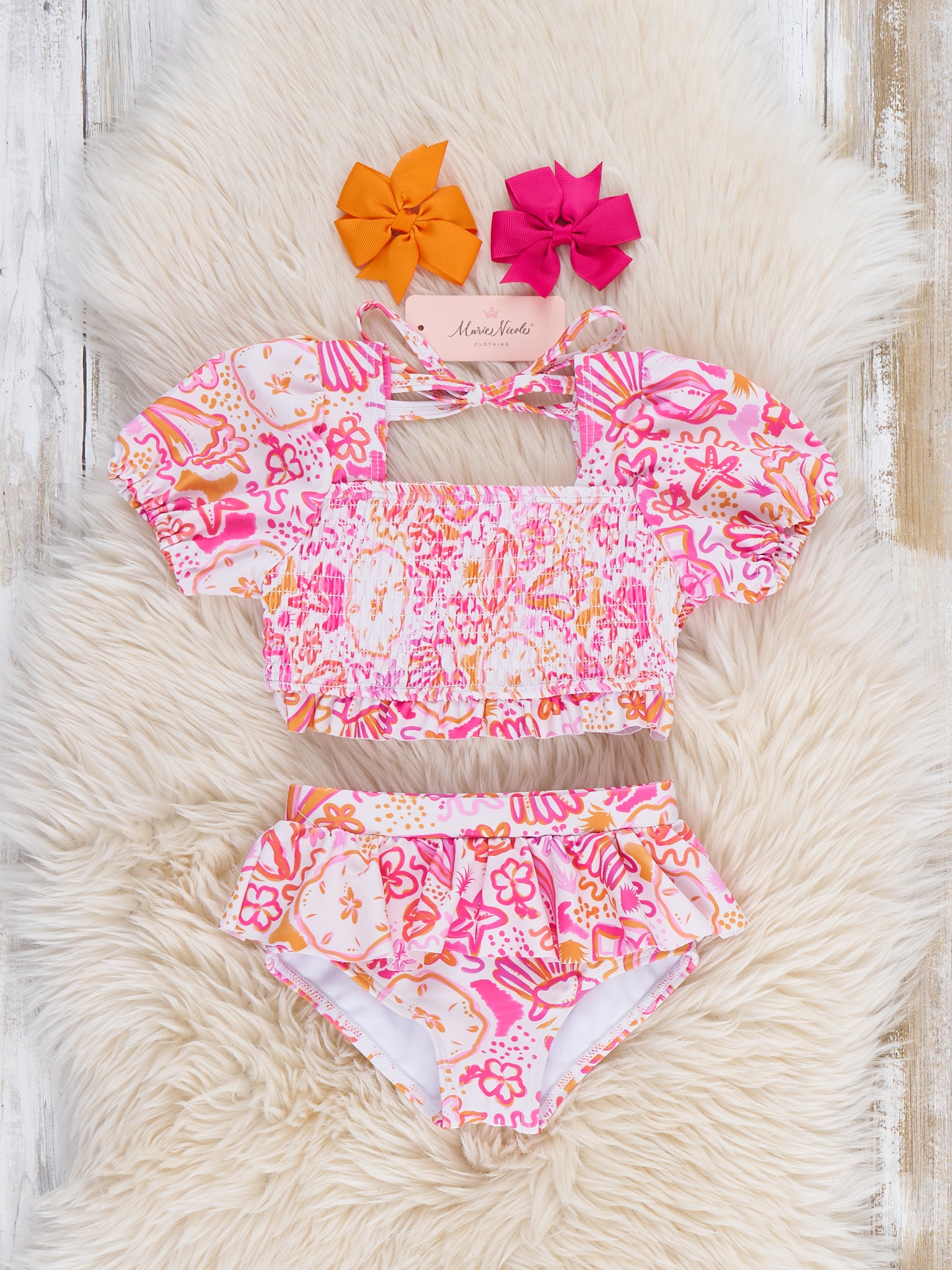 The Starfish and Sand Dollar Smocked Ruffle Swimsuit by Marie Nicole shimmers with puffed sleeves, smocked bandeau top, and ruffled bottoms featuring starfish prints. Adjustable ties and durable fabric empower seaside escapades, tide pool treasures, or bubbly baths alive with dives, dreams, and delightful discoveries.