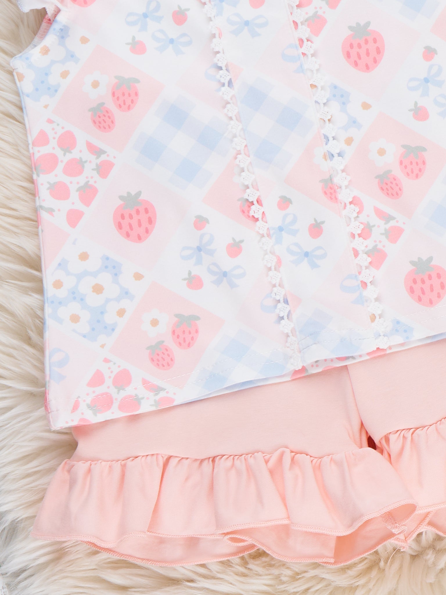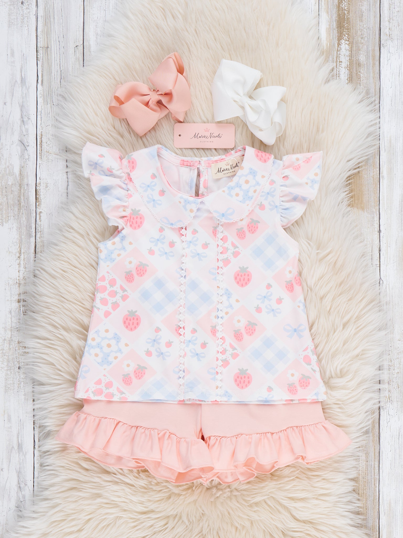 The Strawberry Sherbet Ruffle Outfit by Marie Nicole Clothing serves up soft, dreamy sweetness with a flutter-sleeve top in a patchwork-style berry print and coordinating ruffle-hem shorts. Comfy knit fabric and an easy pull-on fit make this set perfect for play, lounging, and picture-ready days filled with snuggles and twirls.