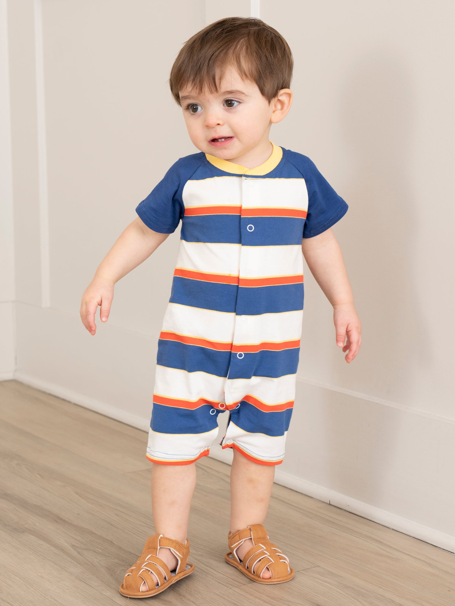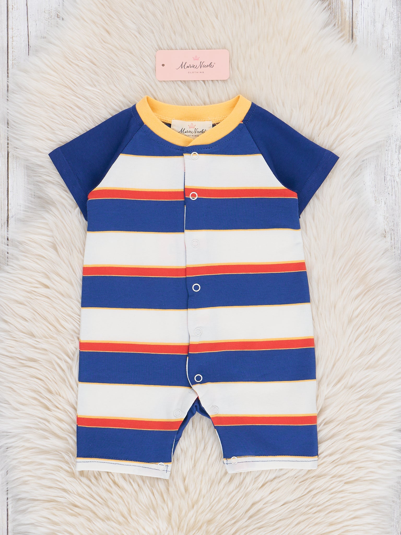 Add some playful style to your little one's wardrobe with the Blue & Red Striped Raglan Romper from Marie Nicole Clothing! Featuring a button-front design, bold stripes, and a yellow accent collar, this boys striped romper is perfect for a fun-filled day of exploration. Don't forget to check out the matching brother set!