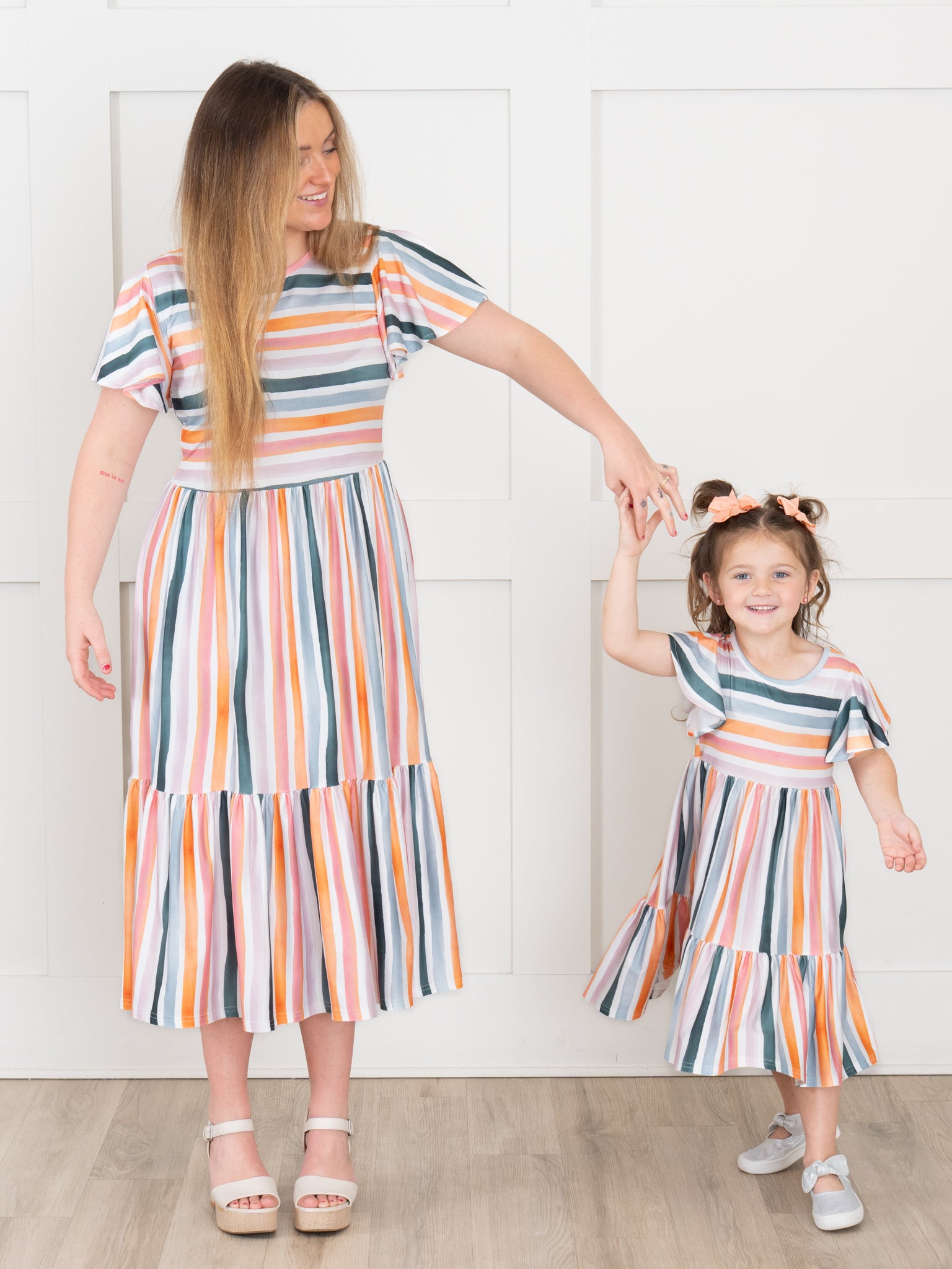 This Coastal Tide Tiered Stripe Ruffle Dress by Marie Nicole Clothing features the sweetest stripes & ruffle trim for a beautiful family match. With colors inspired by the sea foam and sunny beaches, this soft, comfy one-piece is perfect for warmer weather, whether spring or summer. The lovely ruffles make it extra cute. As a Mom & Me set, it is perfect for family matching!
