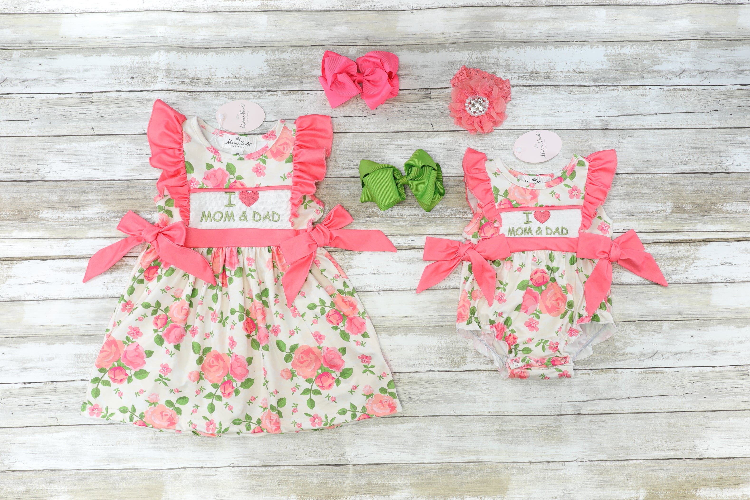 Mom & Dad are the apples of our eye! This adorable dress features a bright pink floral print & ruffles, but the best part is the embroidered, "I Love Mom & Dad." Shop the entire collection here!