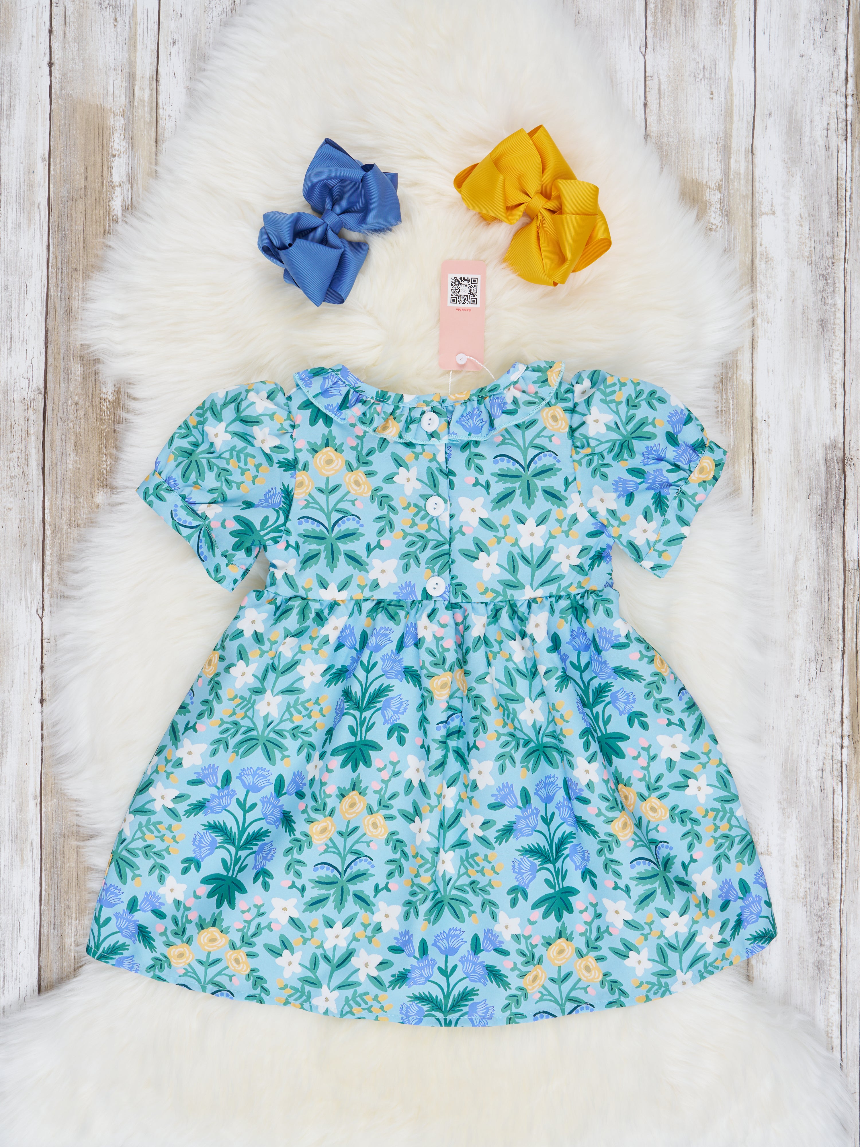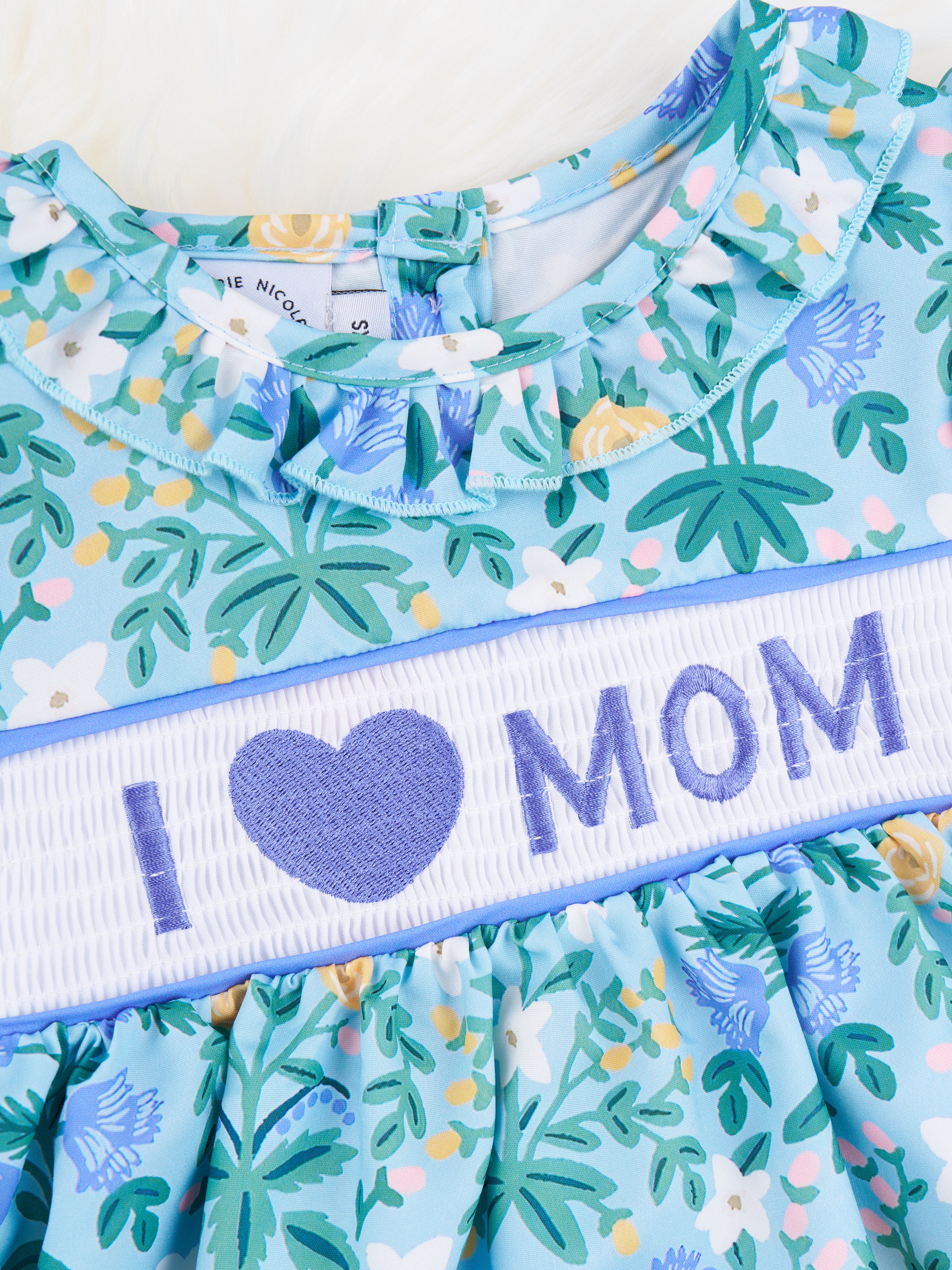 Let your little ones twin in style with this sweet sister set! Adorned with a smocked design and an embroidered "I Love Mom," this teal floral print dress will make momma's heart melt. The round ruffle neck adds a little extra sweetness for twice the love!