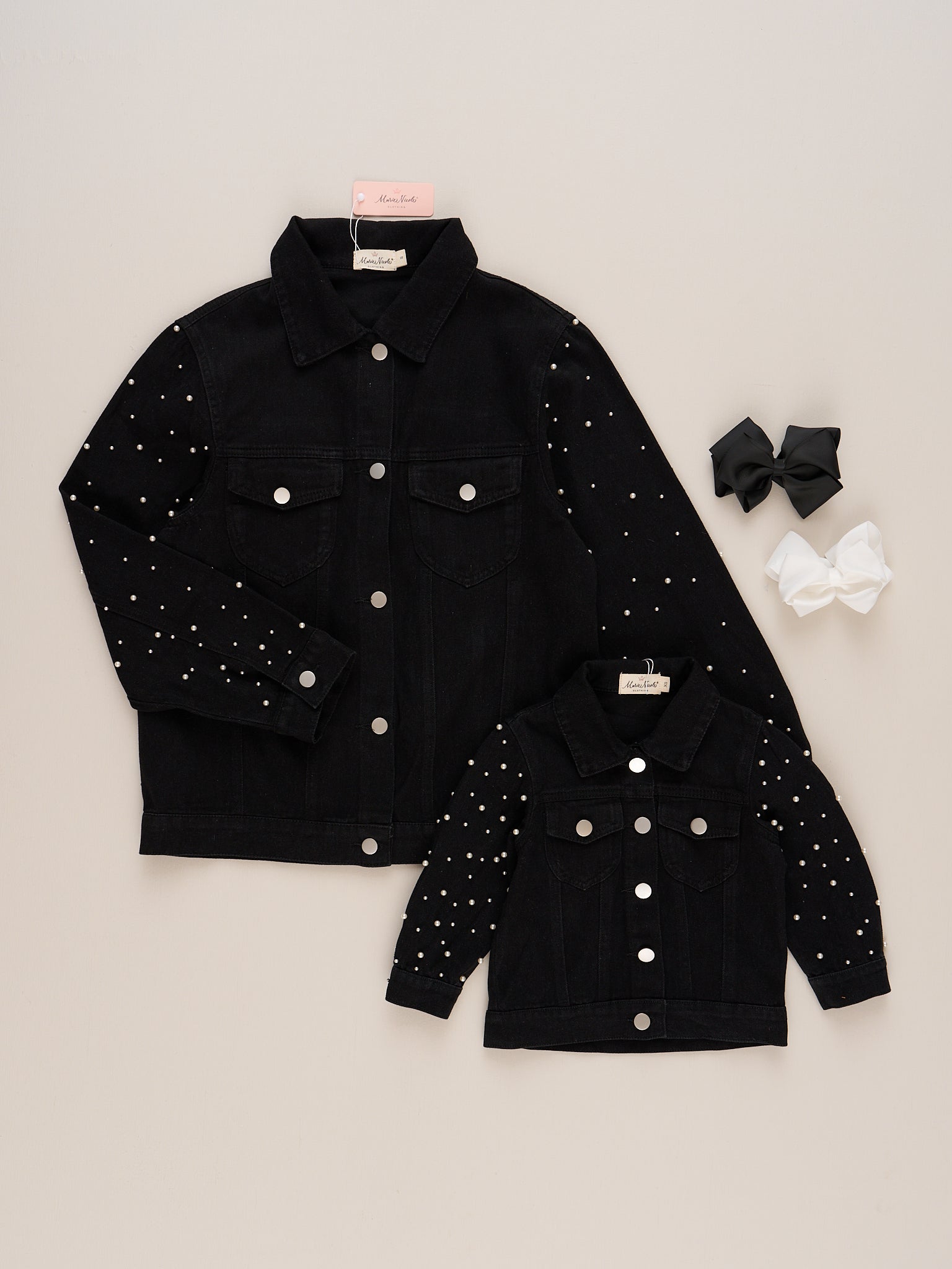 The Mom & Me Pearl Glow Jacket for moms features classic styling with a modern twist, adorned with glimmering pearl accents on the sleeves for an eye-catching look. Crafted by Marie Nicole Clothing, this black denim jacket offers comfortable layering and a chic design, perfect for making matching moments truly shine during outings or special occasions.