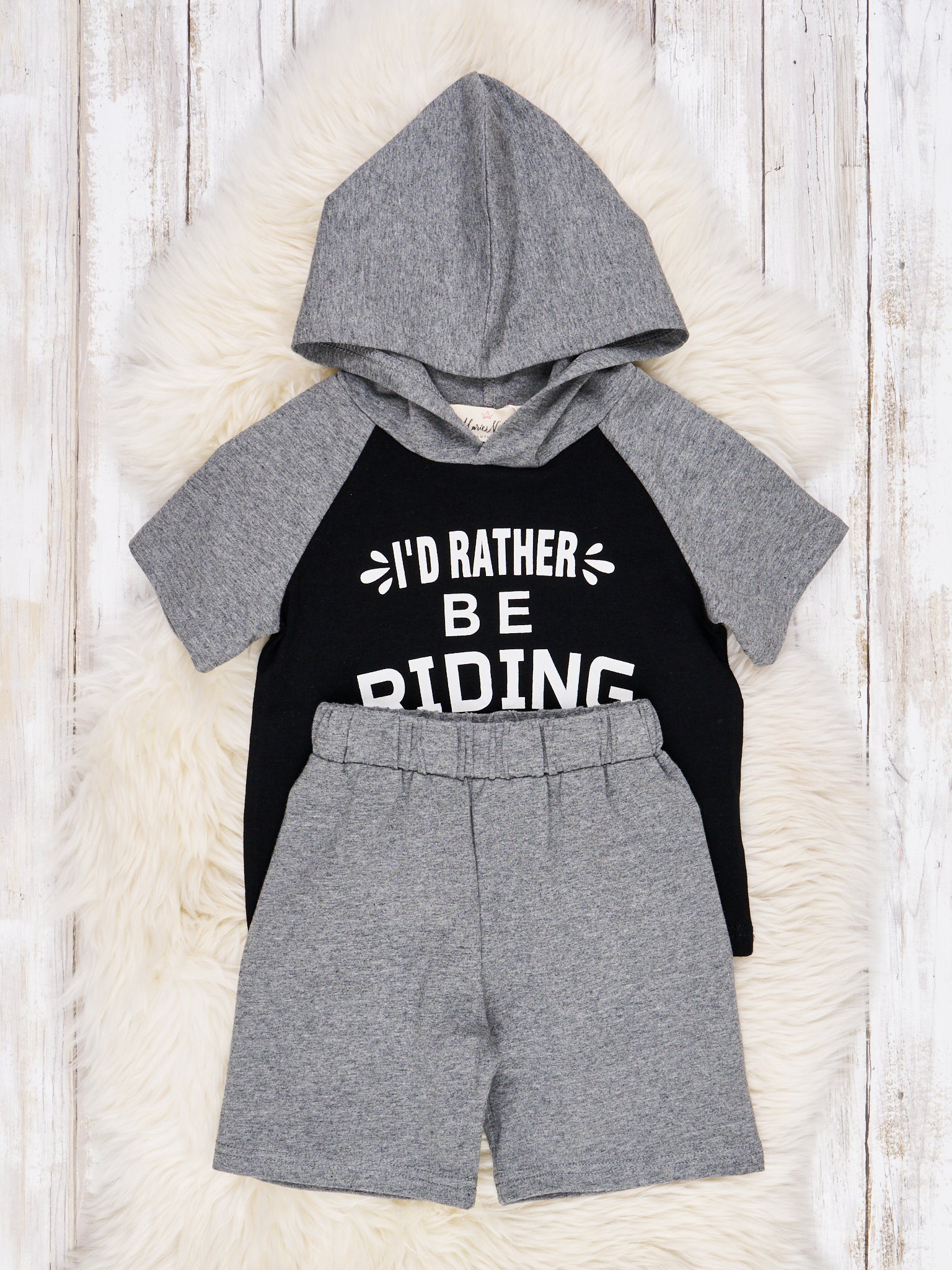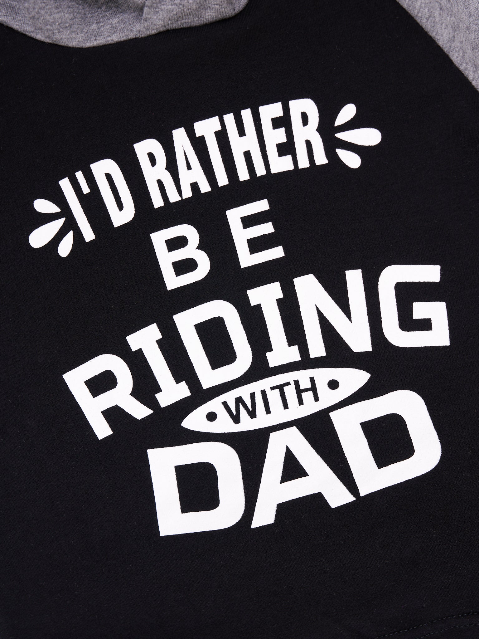 Grab this "Riding With Dad" Hoodie Outfit and show off your kiddo's style! This look features a classic hooded top with raglan sleeves, perfect for those cool days, plus shorts with an elastic waistband. And, of course, they'll be sporting the cutest slogan in town - "I'd rather be riding with dad"!