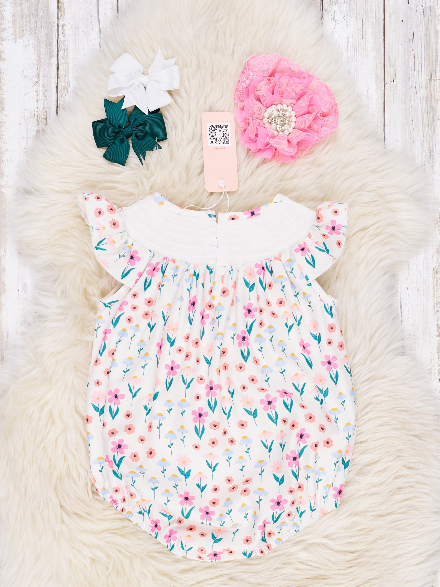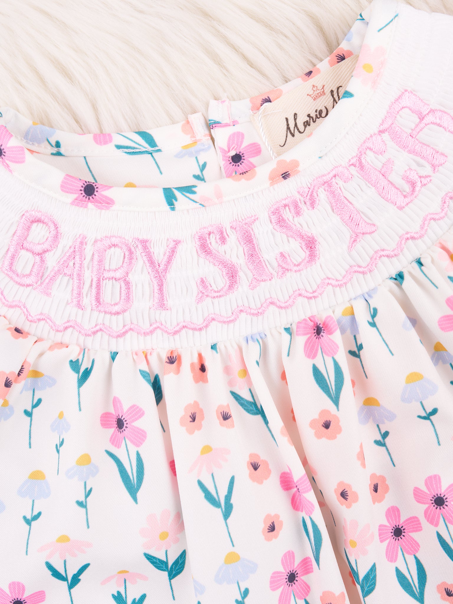 Your daughters will be blooming in this delightful sister set! This romper is undeniably adorable and has detailed smocking, pretty pink florals, and a frilly ruffle design. She'll love looking as cute as a button!
