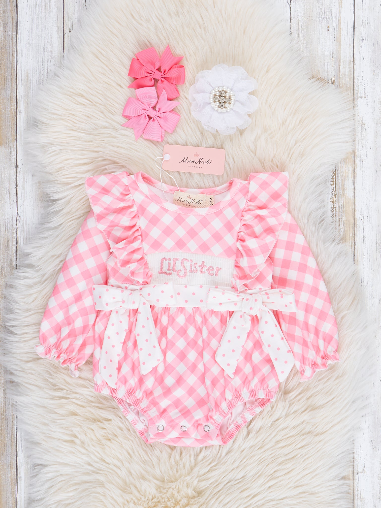 Rose Gingham Smocked "Little Sister" Ruffle Bubble