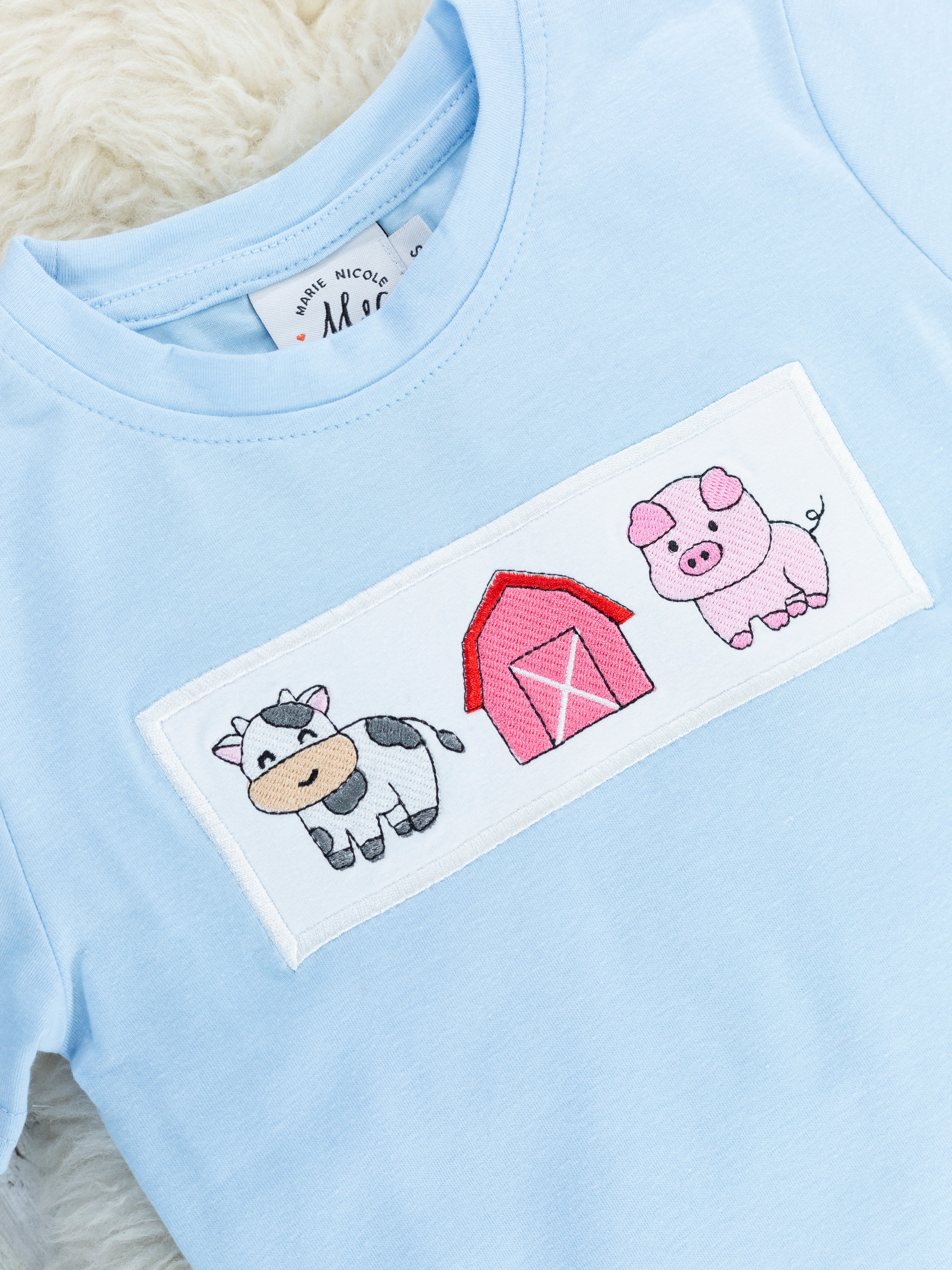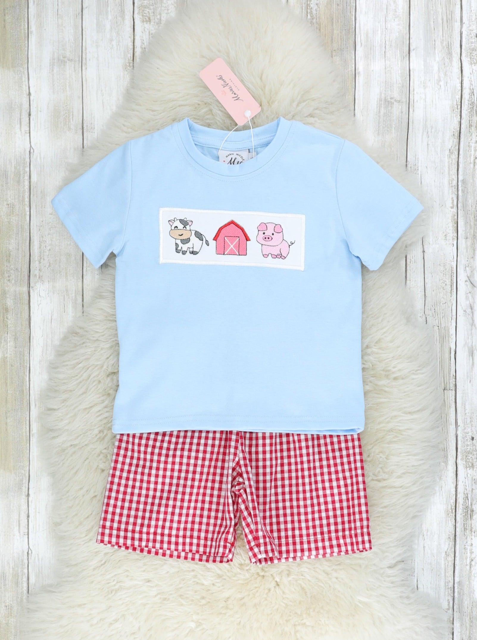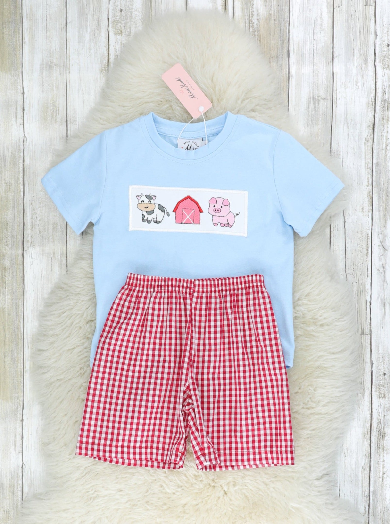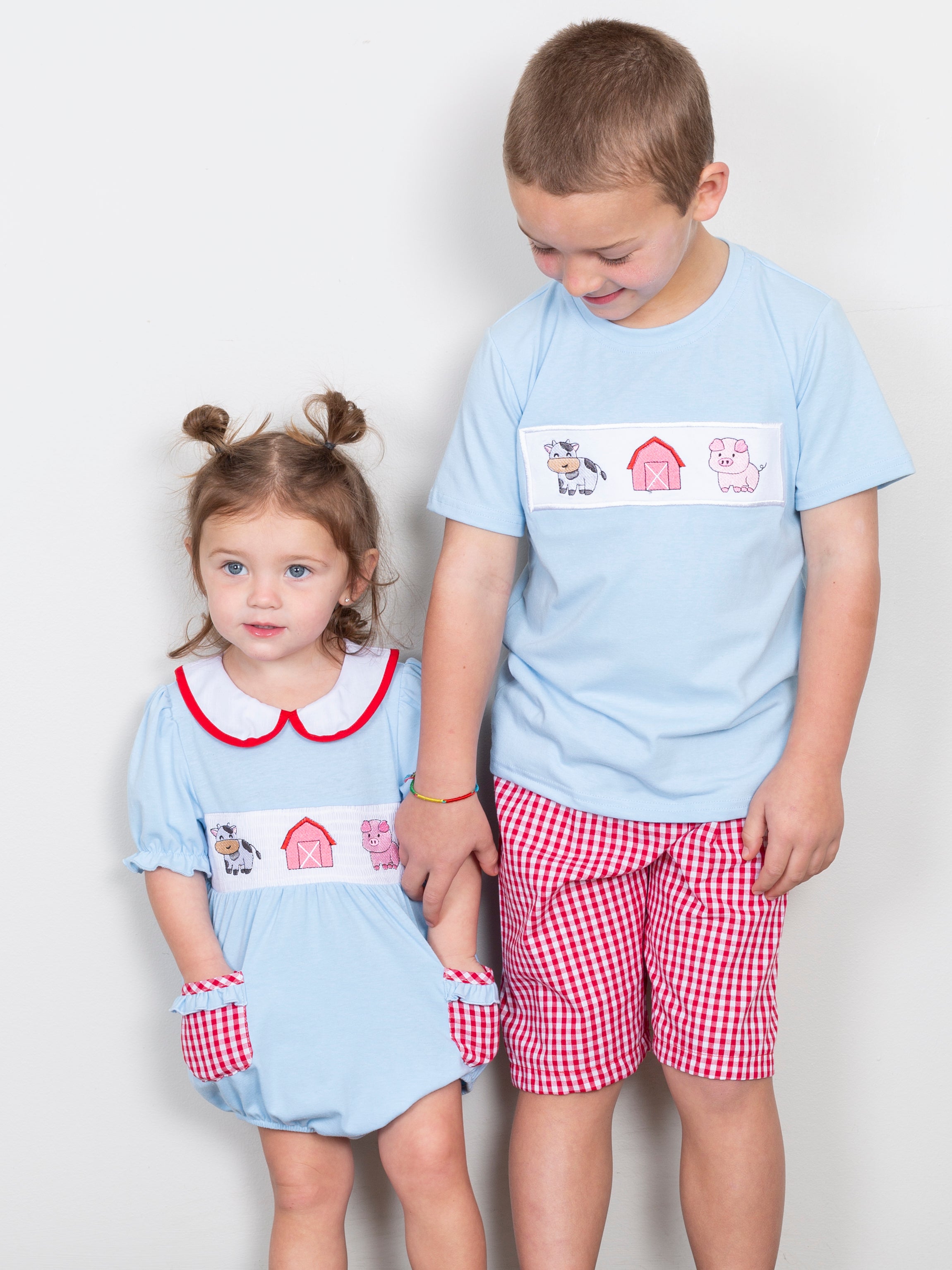 This FARMtastic sibling set is perfect for all the kiddos! This outfit features a light blue top with smocking, embroidered farm friends, & red gingham shorts with an elastic waistband.