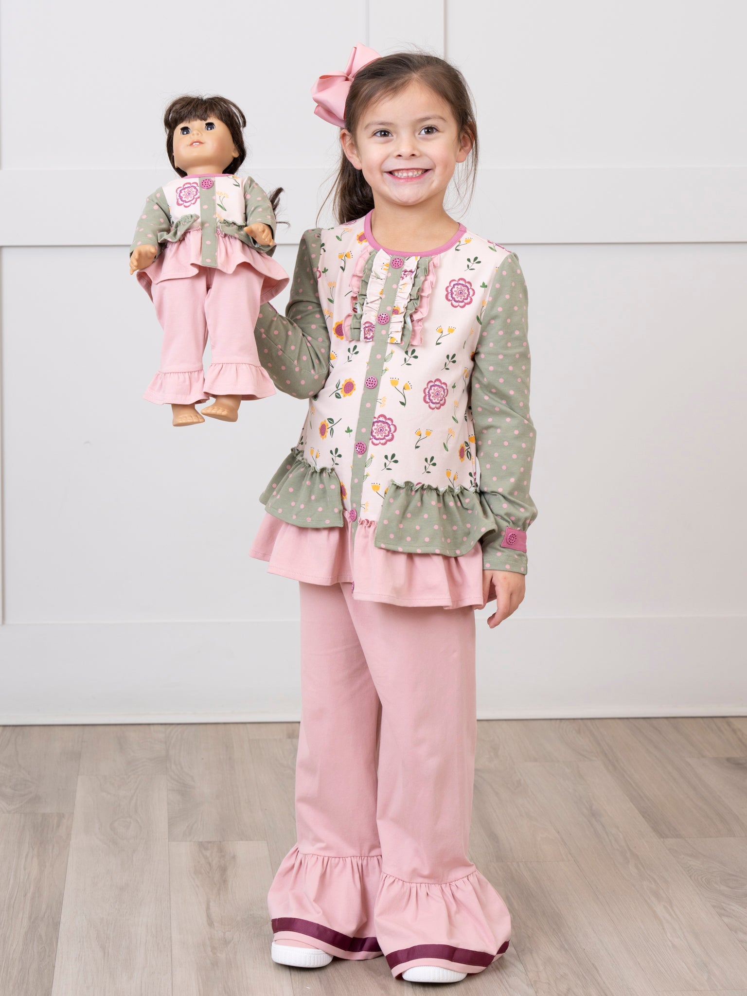 These doll outfits features our Bloomberry Fields print, ruffle trim, & velcro backs for easy changing.