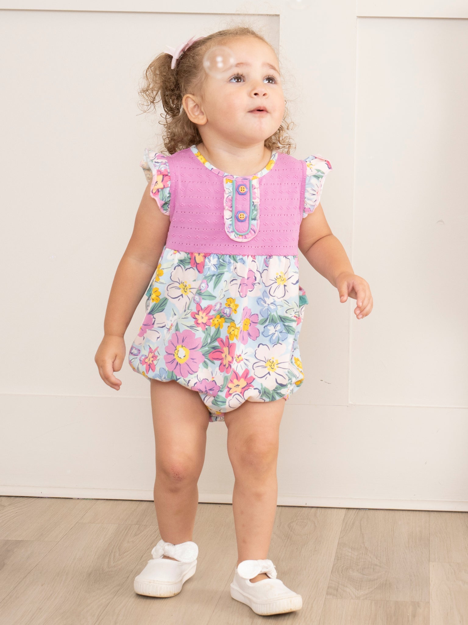 This sweet ruffle bubble features eyelet fabric, our Southern Garden floral print, and ruffles galore along the shoulders, chest, leg openings, and super fun pockets.