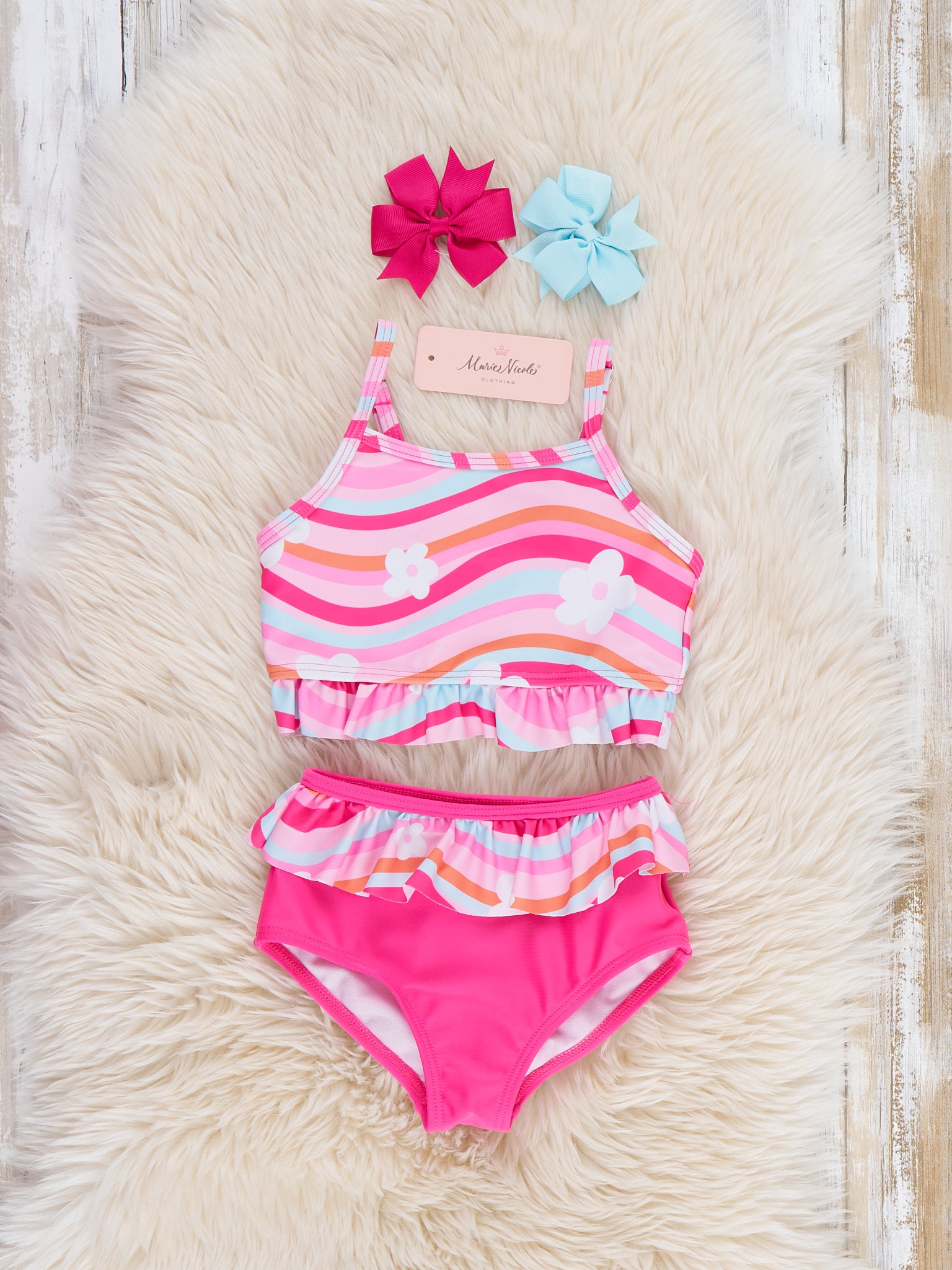 The Wavy Blooms Ruffle Swimsuit by Marie Nicole Clothing pairs a halter top with hibiscus flowers and wave print plus ruffle trim with matching ruffle-bottom briefs for tropical fun. These are designed for splashy beach days and pool parties!
