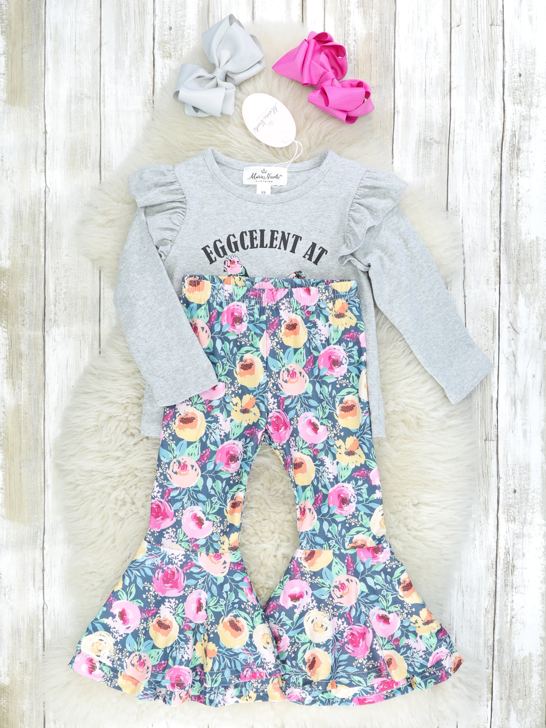 The perfect floral outfit for your girls who are "EGGcelent at winging it"! This outfit features a grey top with flutter trim, a floral chicken detail, & matching floral bell bottoms.