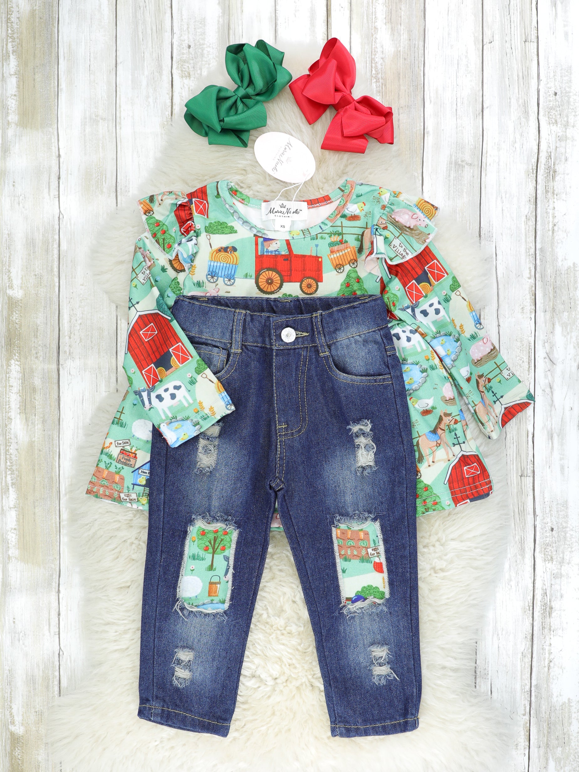 Hay there- we have the perfect farm fun outfit for fall! This outfit features a peplum top with a farm fun design & flutter trim. The distressed denim pants have matching patches for all the farm fun!