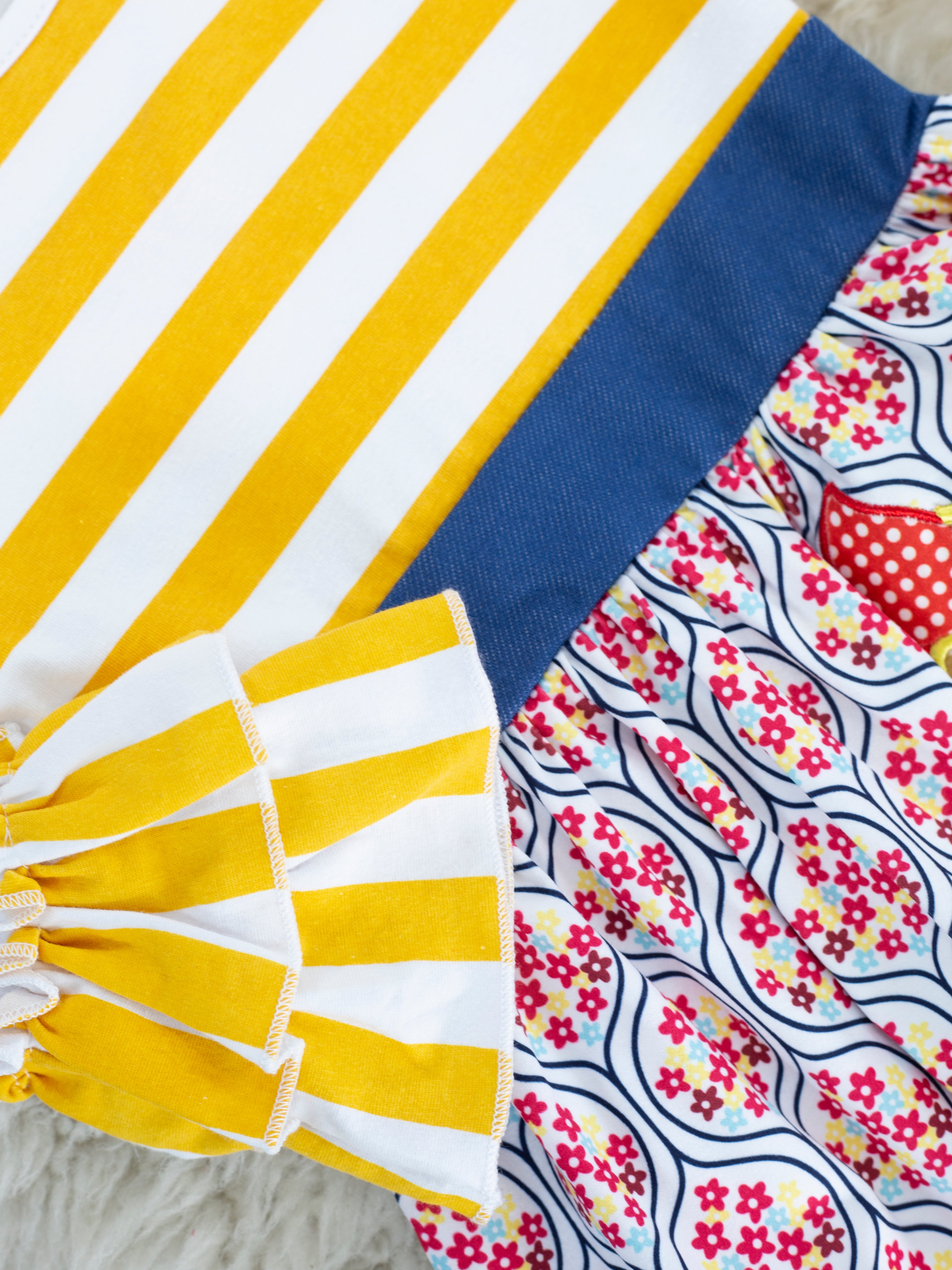 A sweet transitional piece for your chick this spring! This dress features mustard stripes, stunning florals, a chicken appliqué, & ruffle details.