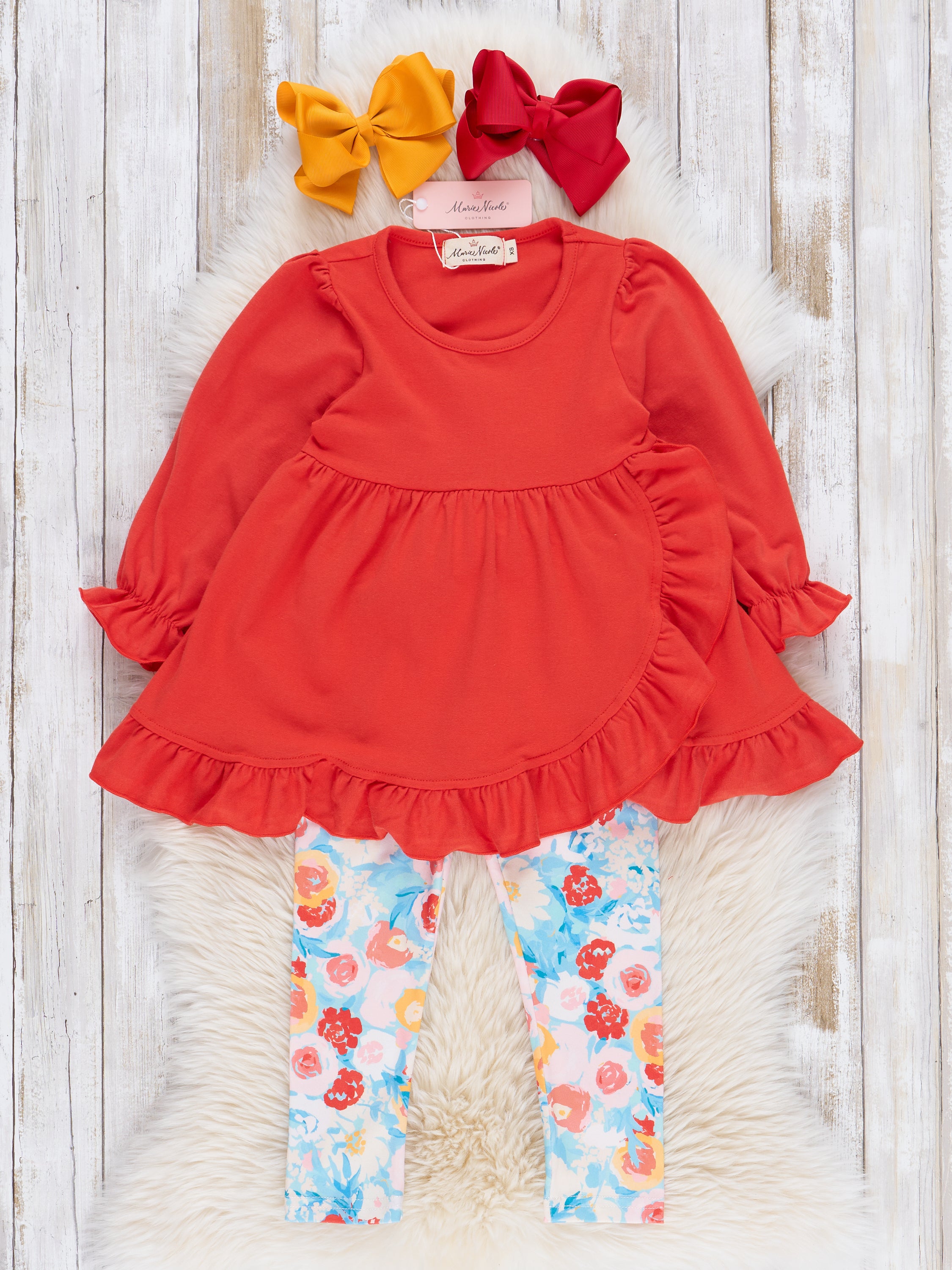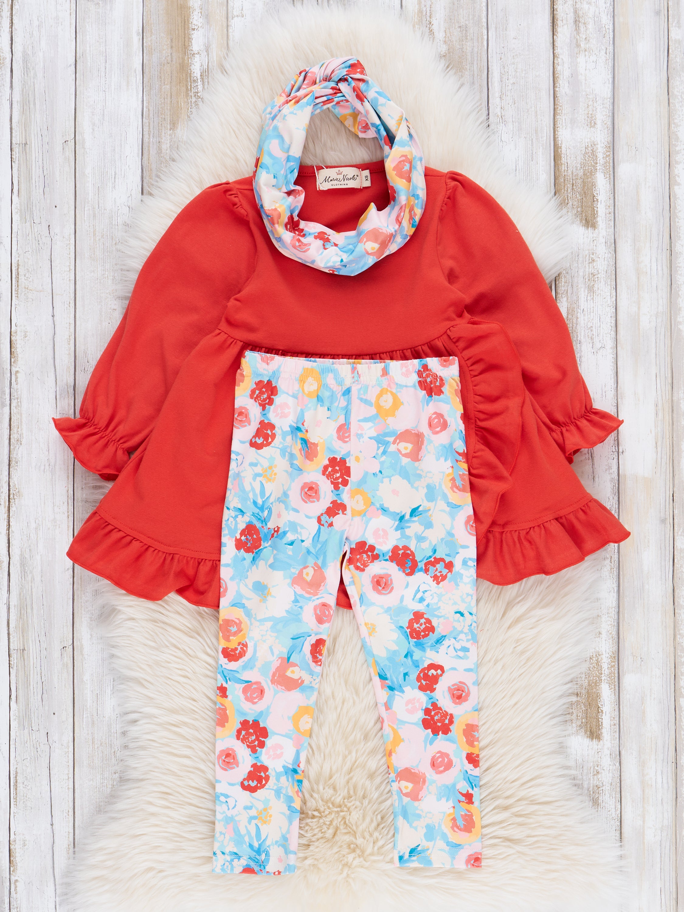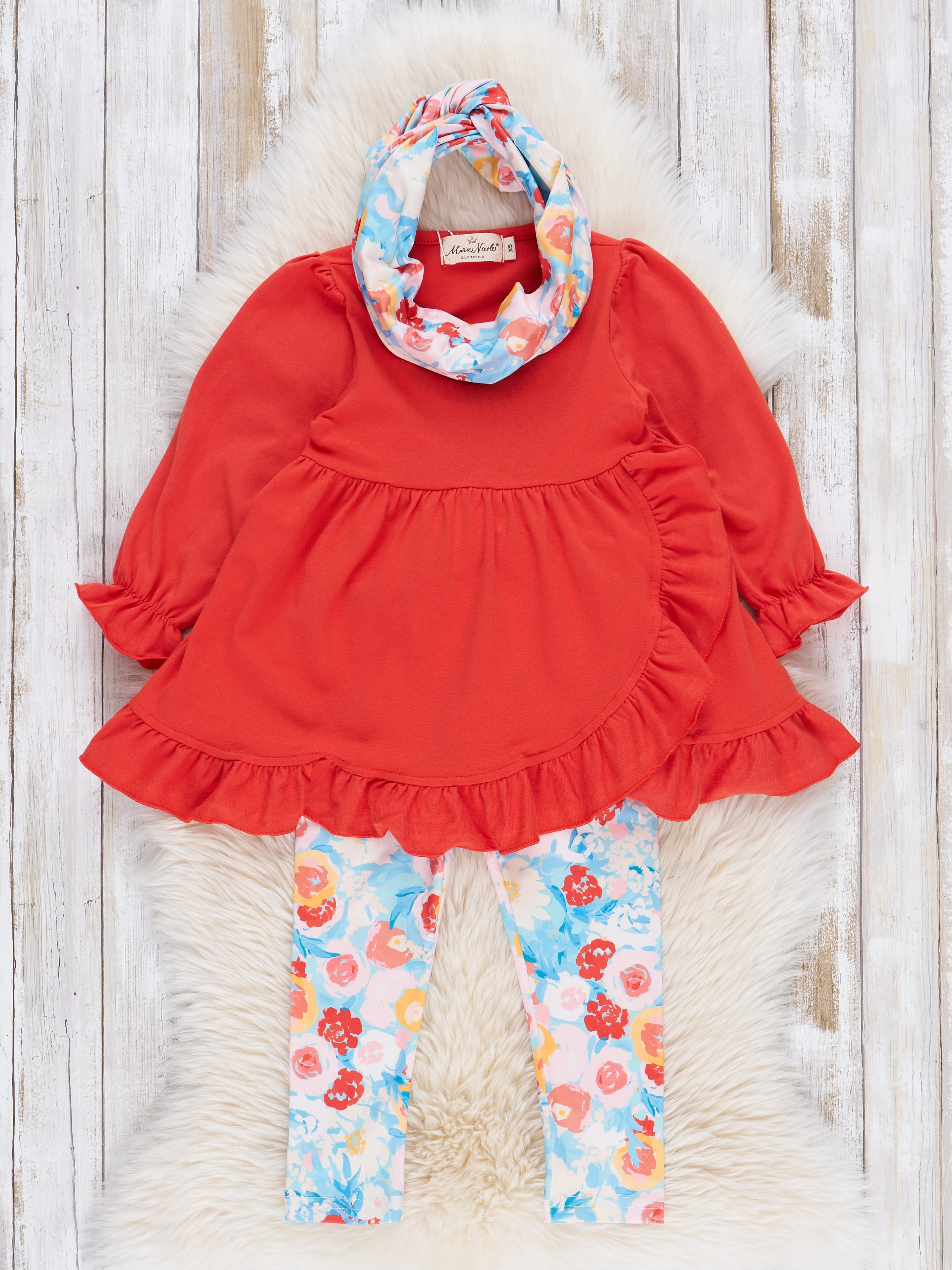 Get ready for your little one to bloom in the Orange Floral 3 Piece Set! This playful girls outfit features a trendy chicken embroidered tunic with pom pom trim, comfy floral leggings, and a matching scarf. Perfect for any occasion, this set will keep your child looking stylish and feeling comfortable all day long.