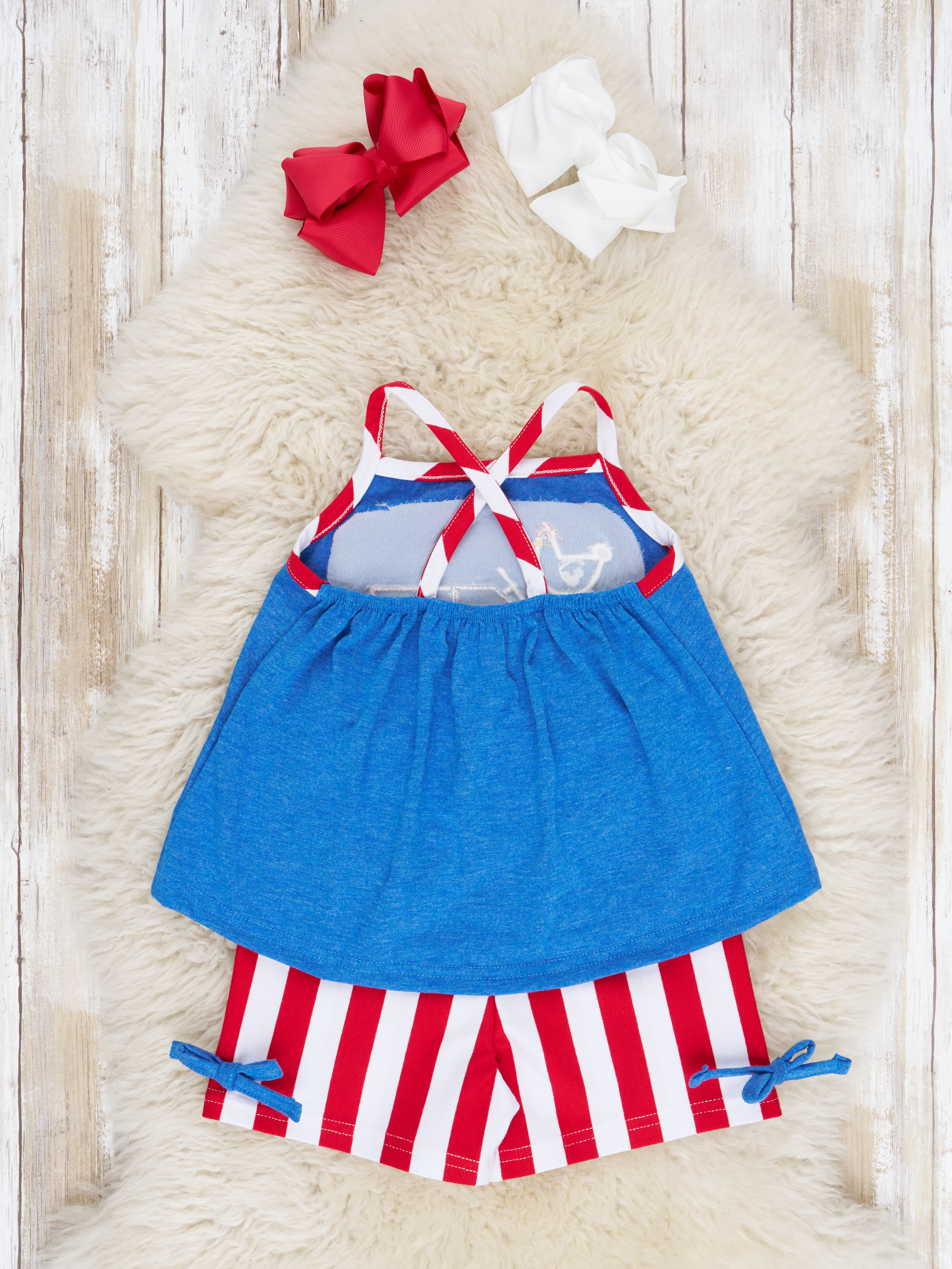 This sibling set is red, white, and awesome! Show your patriotic spirit with this outfit, complete with a chicken on a tractor appliqué and an American flag. It's a surefire way to dress up your little ones in style!