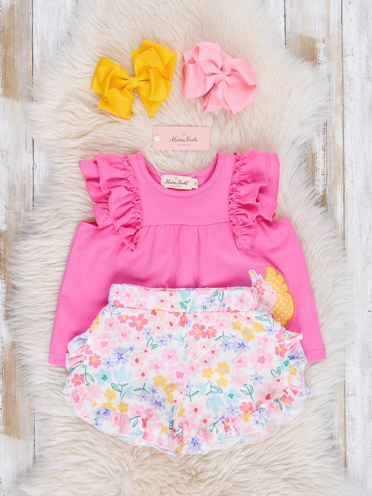 Dress up your little one in this "peck"-fect outfit featuring an embroidered hen design in playful pink and yellow. With its matching sister set and adorable ruffles, this outfit is sure to make your little stand out in style and cuteness!