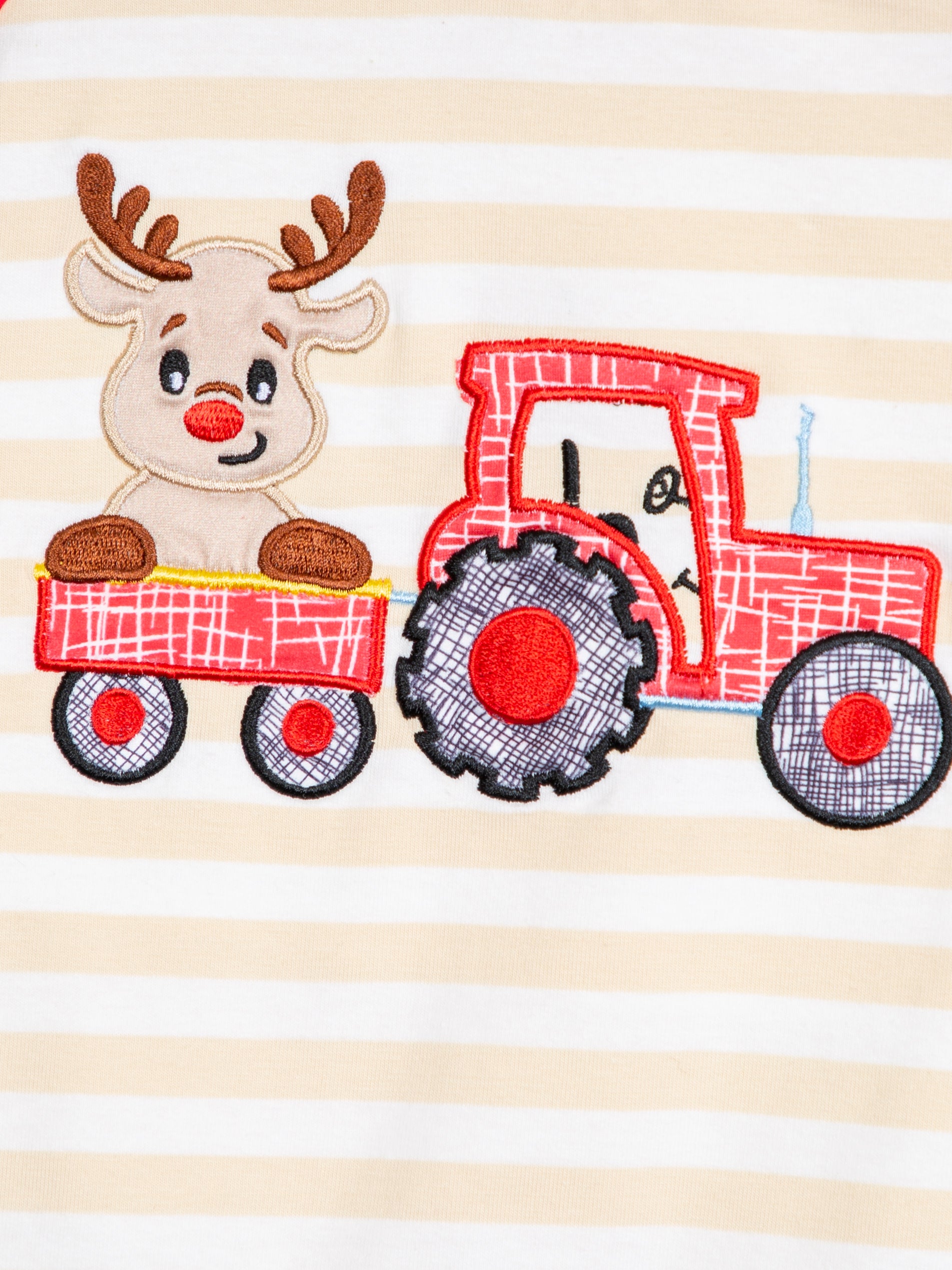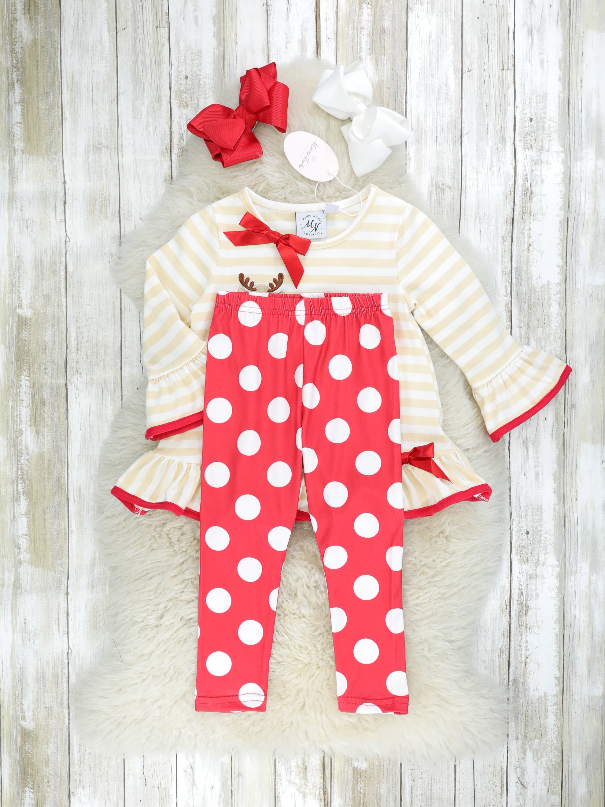 The perfect Christmas sibling set for your little farmers! This outfit features a striped top with an adorable reindeer on a tractor detail, ruffle details, bow details, & red polka dot pants with an elastic waistband.