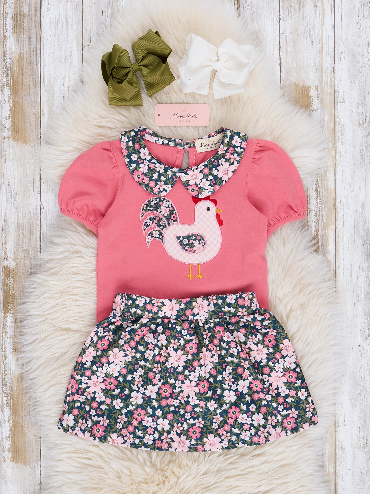 Get ready to strut your style with this Rose Floral Embroidered Hen Outfit w/ Skirt! With a charming embroidered hen and a playful floral print peter pan collar & matching skirt, you'll be the talk of the flock. And don't forget to grab the matching sister set for an adorable coordinated look. Quirky, fun, and oh-so-cute!