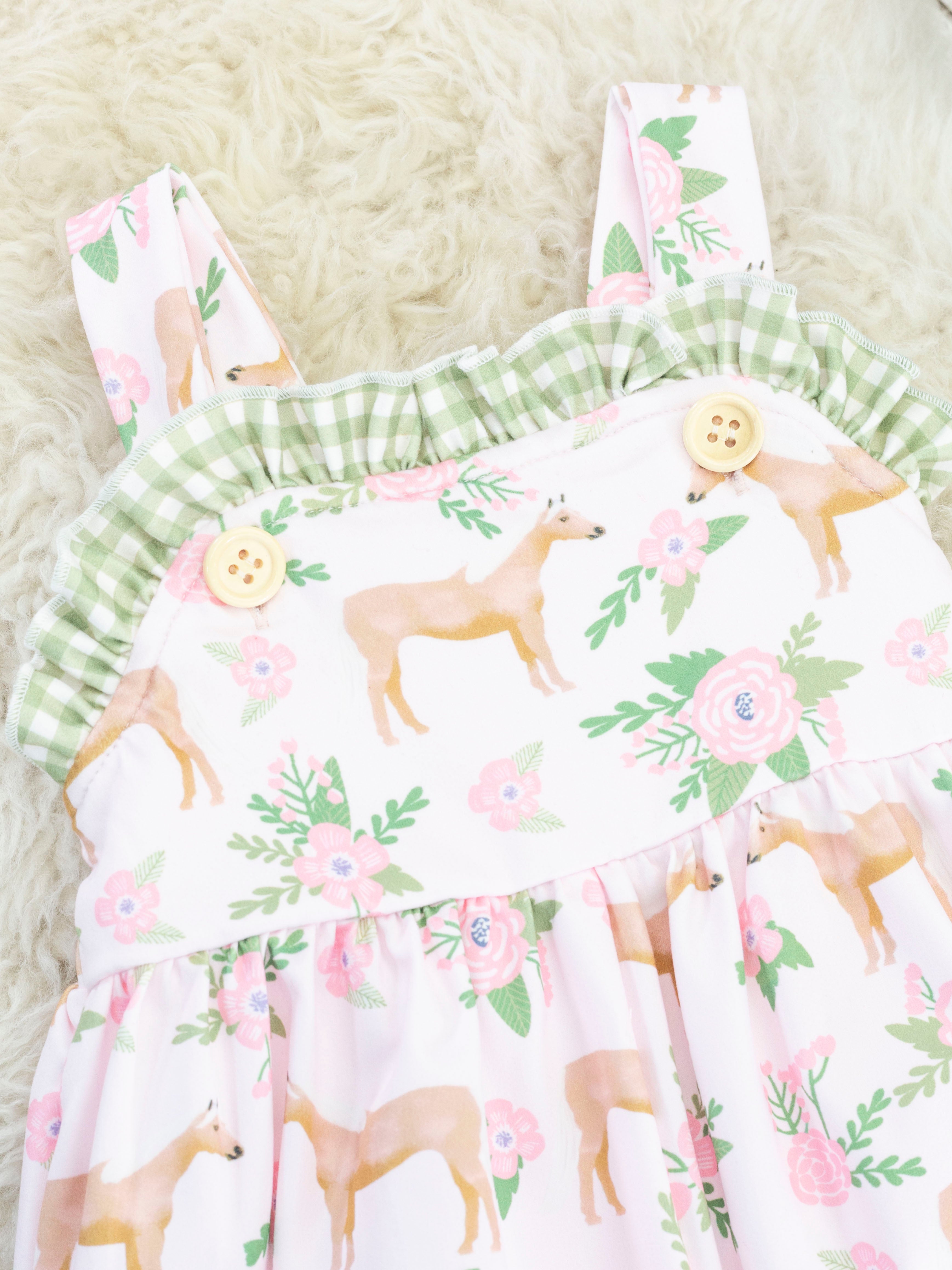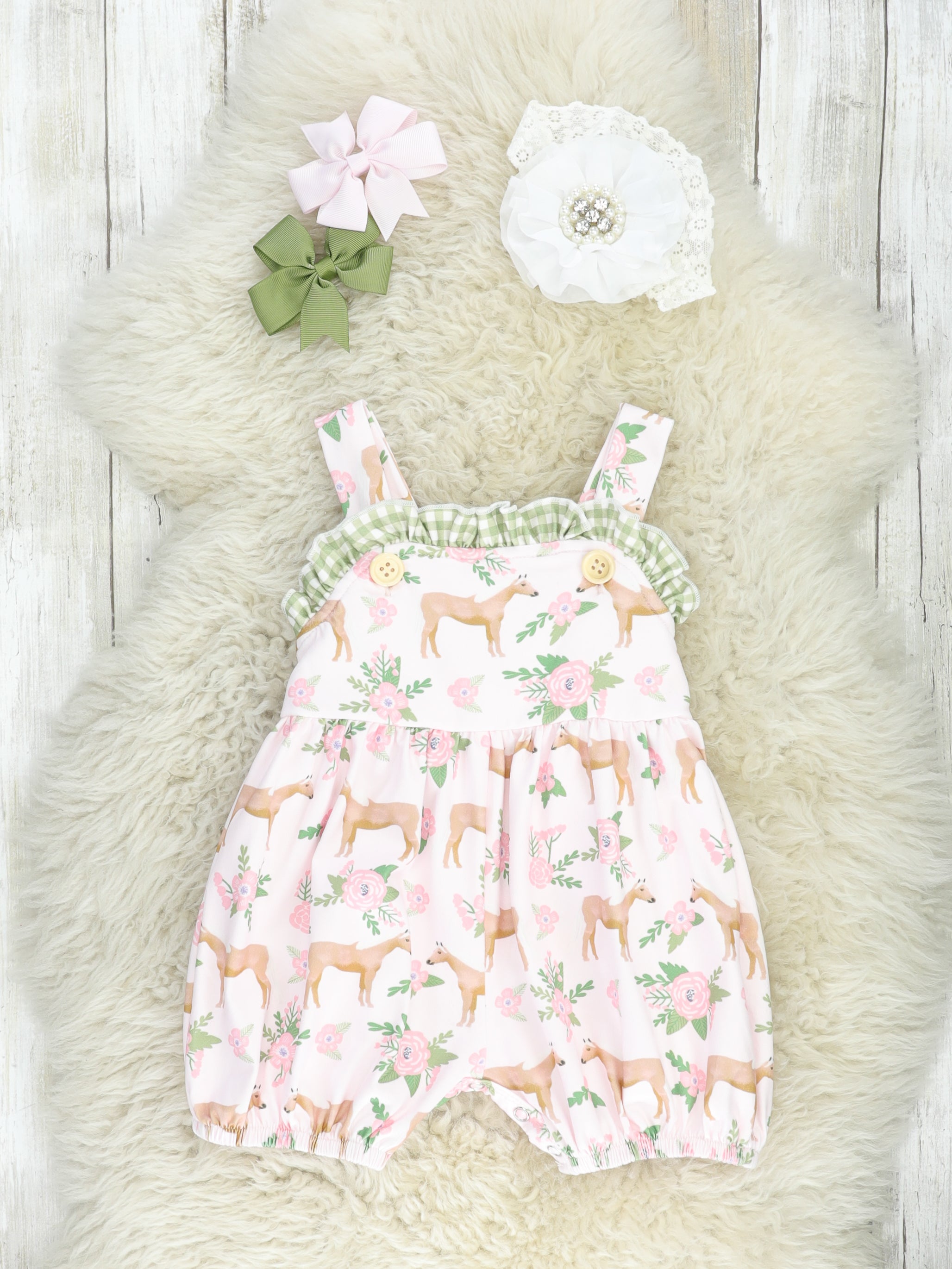 Your kids will gallop in style with this adorable sister set! The romper features a playful horse and floral print, plus frilly ruffles-it's perfect for your little princesses and their wild imaginations!