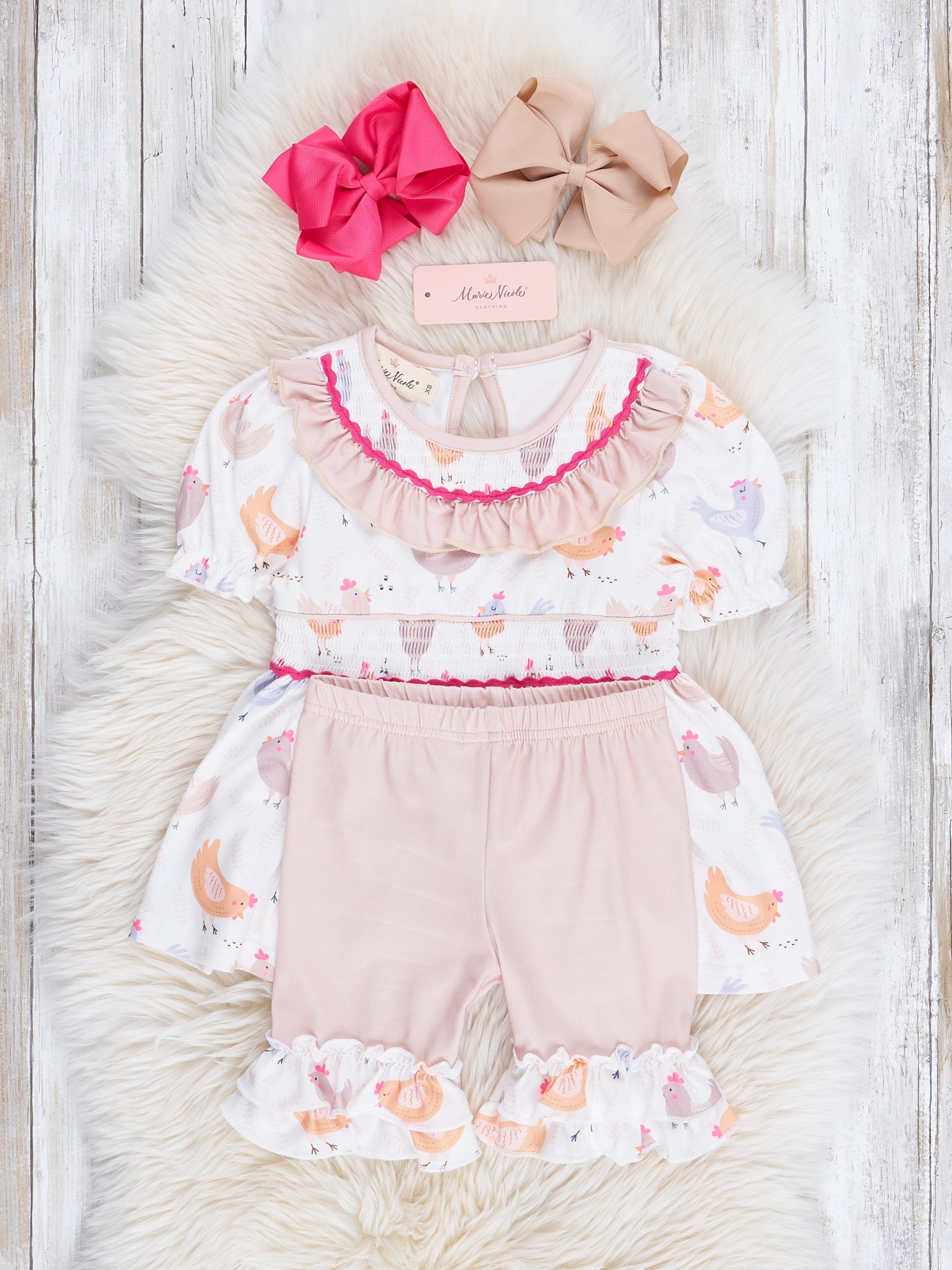 This cute and fun sister set features a smocked design and a darling ruffle collar. The soft tan color and charming chicken print add an extra touch of sweetness. Perfect for days spent playing on the farm or just looking adorable together.