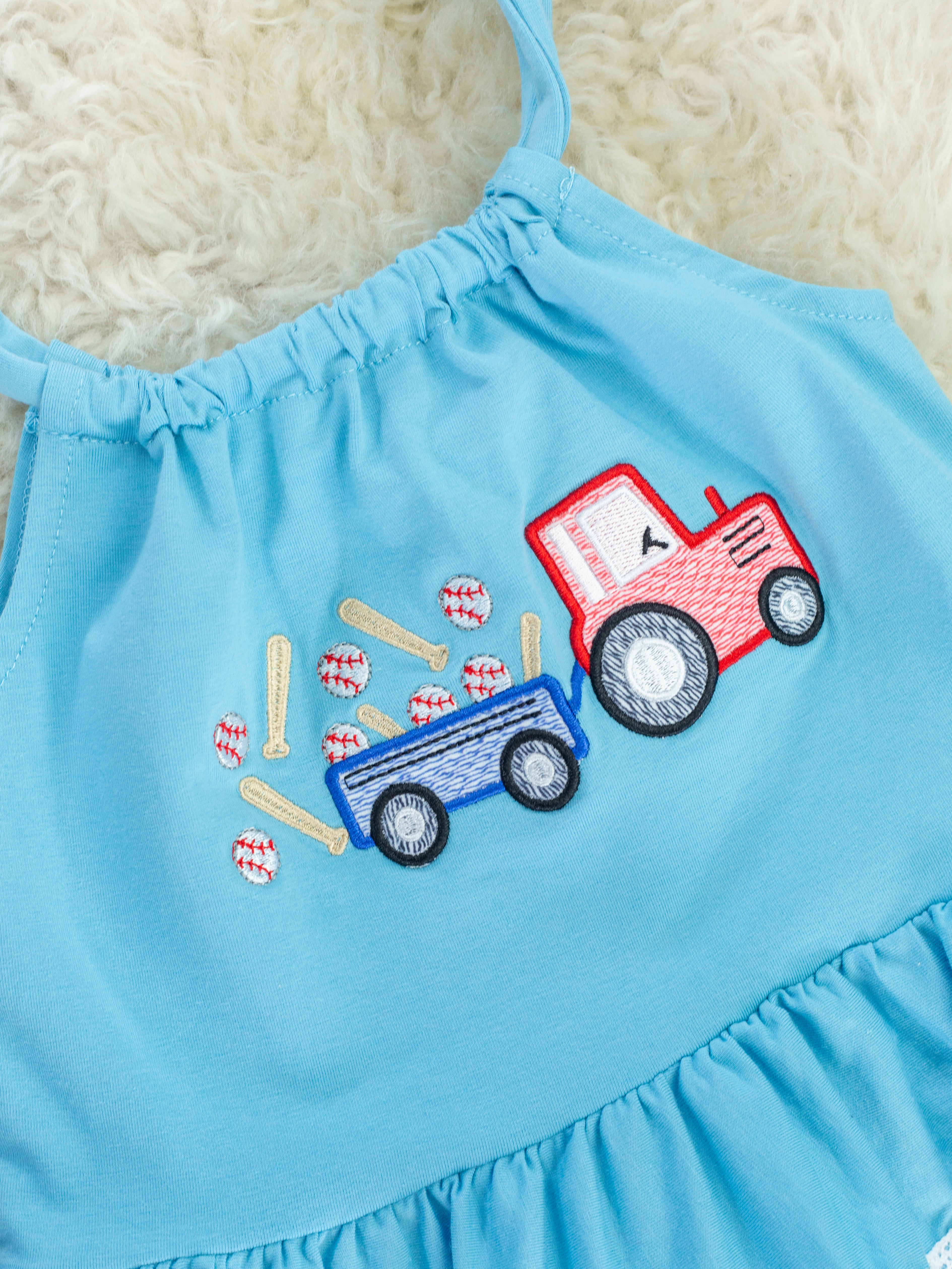 This sibling set is the perfect choice for a winning look! With a baseball truck design, bold red pinstripes, and a flouncy ruffled short, your little all-stars will stand out in the cutest way. #winning!