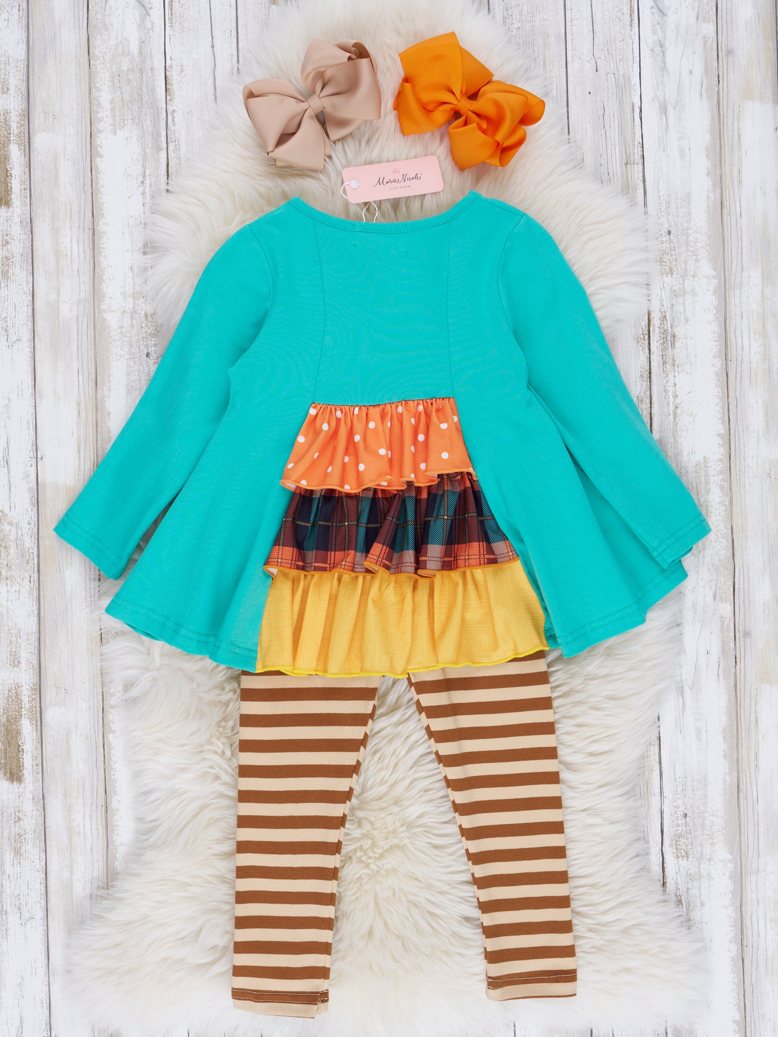 Keep your kiddos looking stylish and scarecrow-chic this fall in our Turquoise Scarecrow Stripe Outfit! Perfect for younger siblings with its matching set, this comfy outfit features leggings with an elastic waistband so the lil' ones can play without any of the fuss. We guarantee it'll make them the cutest crows in the patch!
