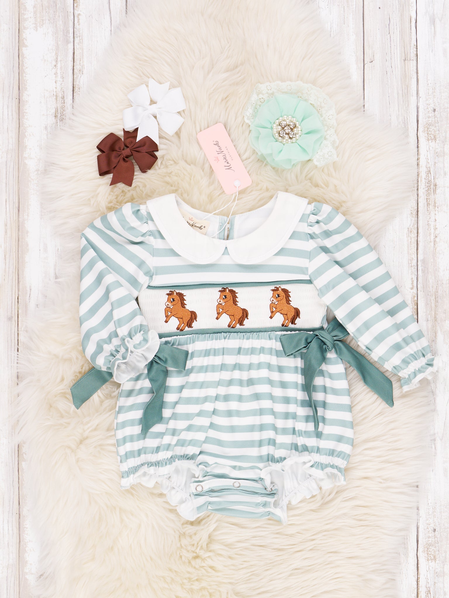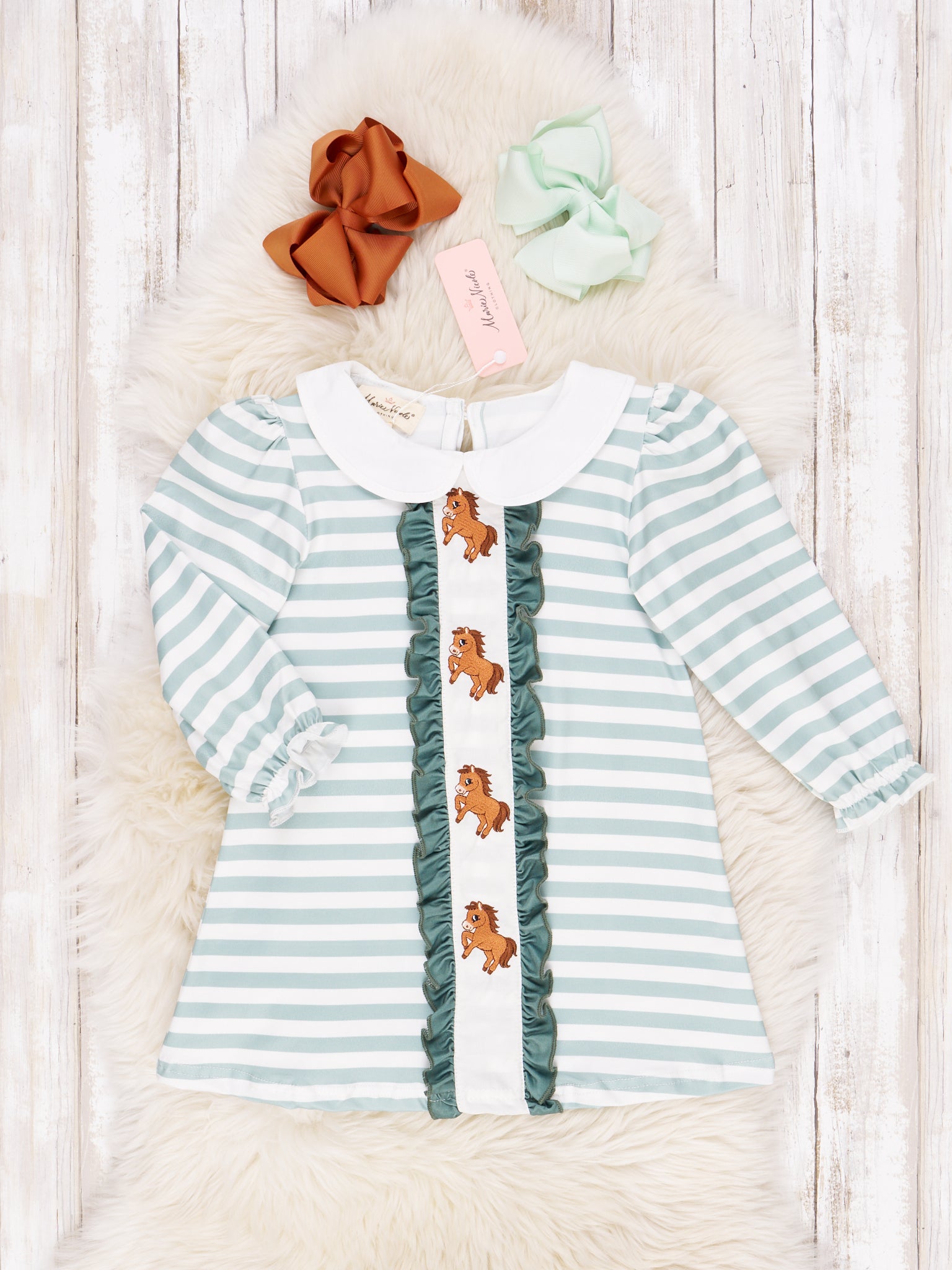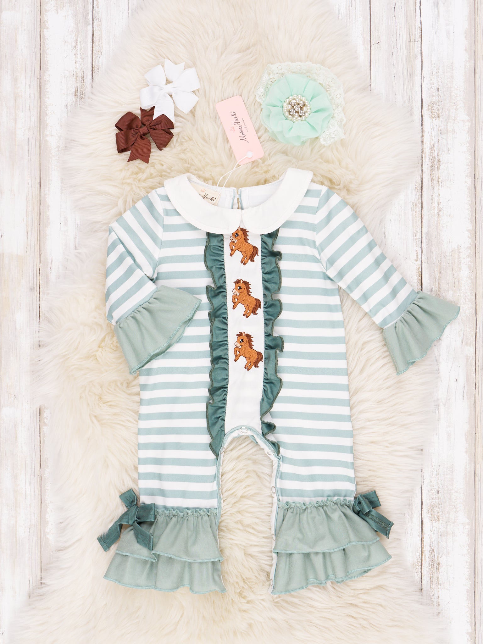 Green & White Stripe Embroidered Horse Ruffle Romper