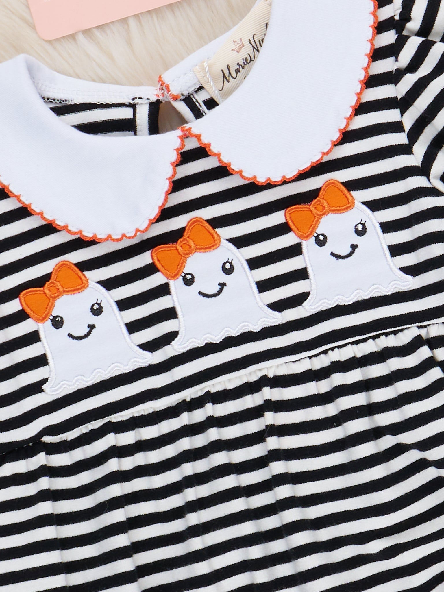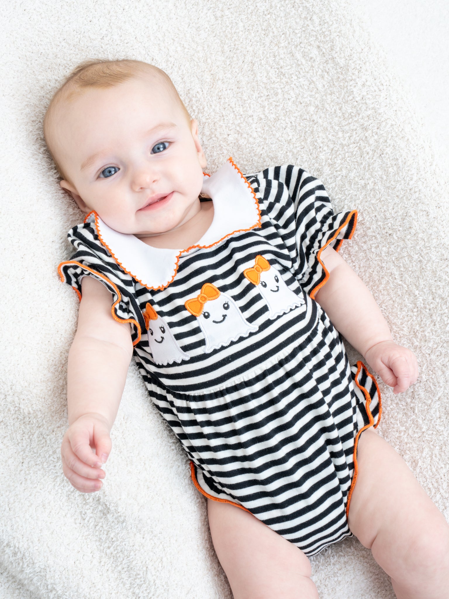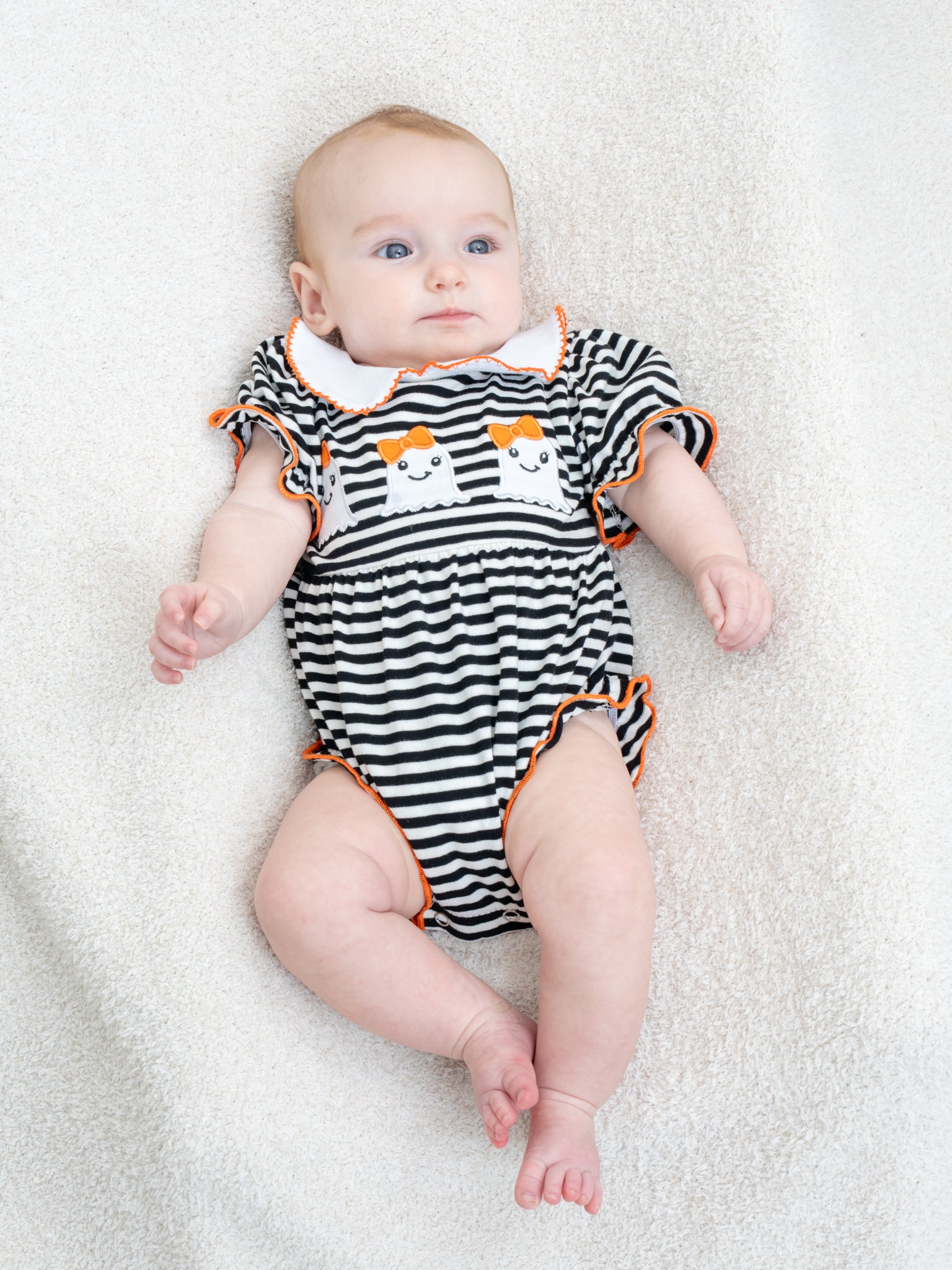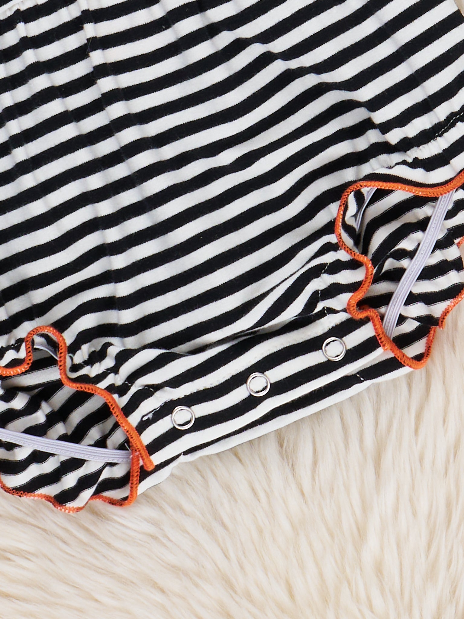 Striped Boo & Pumpkin Embroidered Ruffle Romper