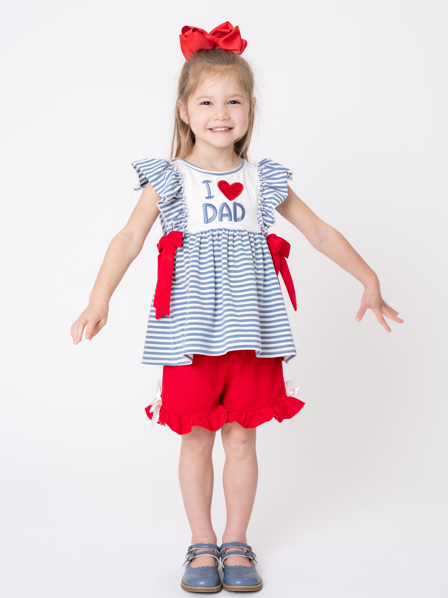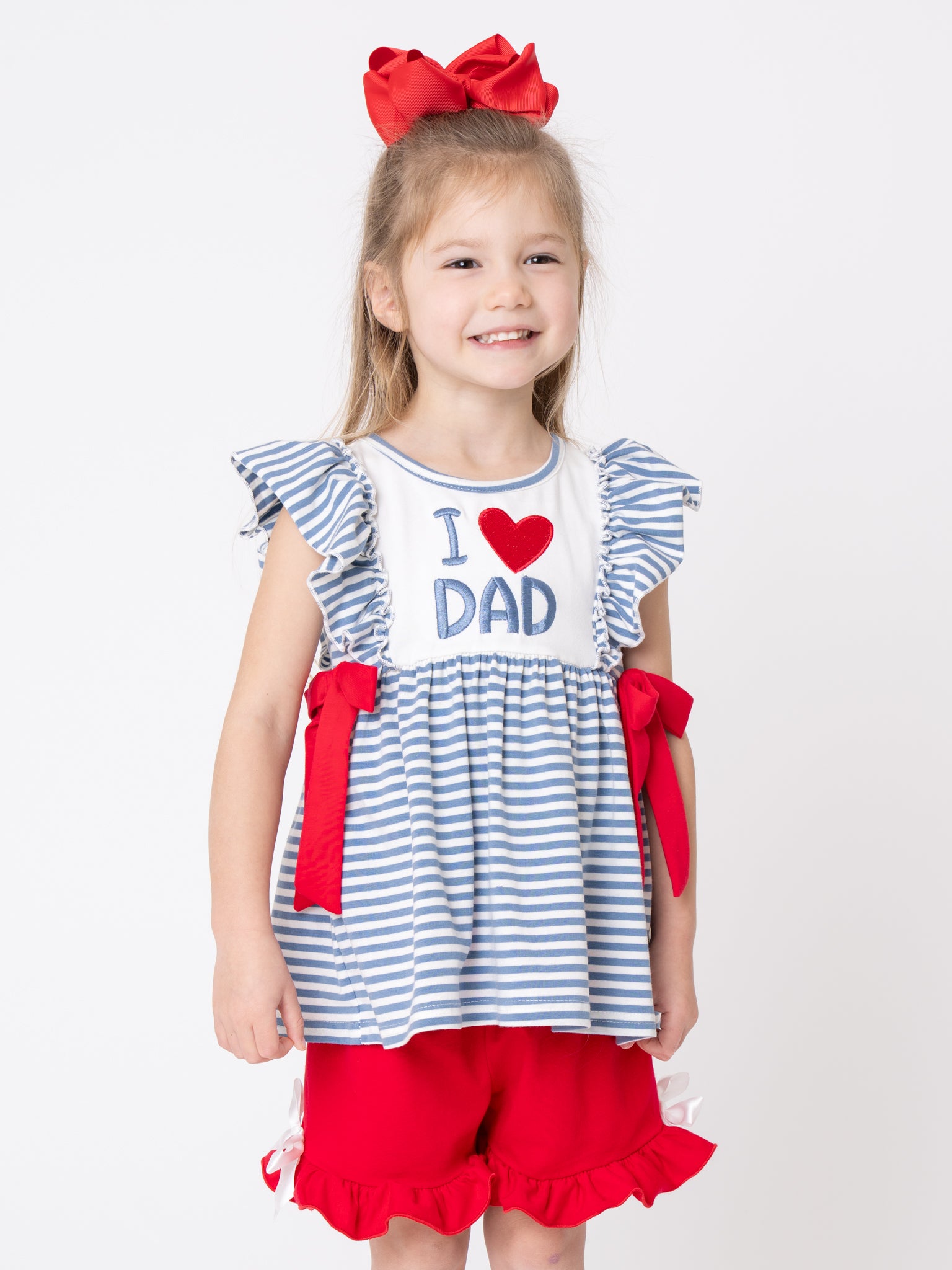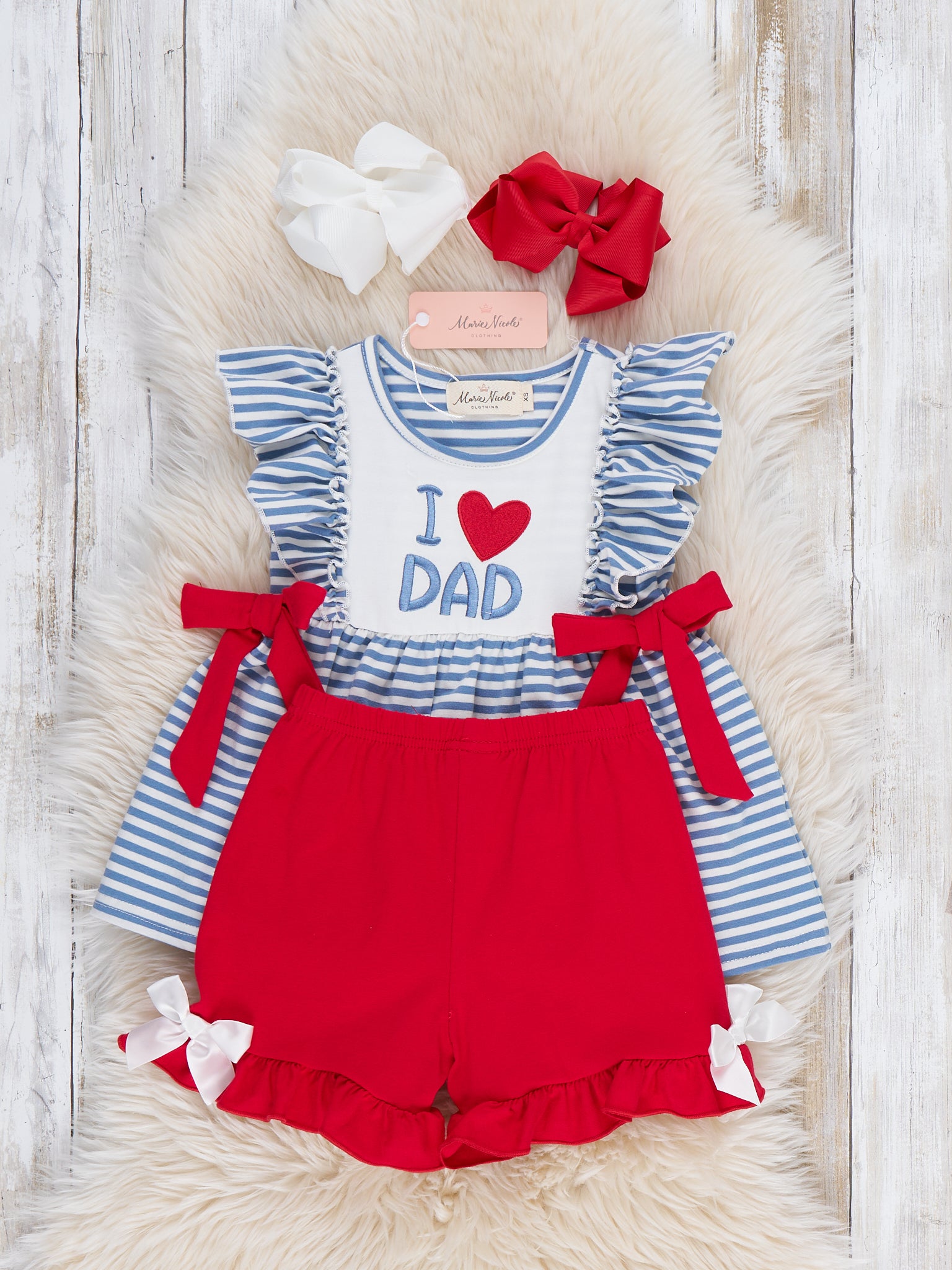 The I Love DAD Stripe & Ruffle Embroidered Outfit by Marie Nicole Clothing honors Dad with its adorable bodice and matching shorts set. Tiered ruffles and flutter sleeves add playful movement, while stretchy fabric ensures comfy fit for active adventures. Ideal for daddy dates, family outings, or heartfelt photo moments filled with stripes, bows, and boundless joy.