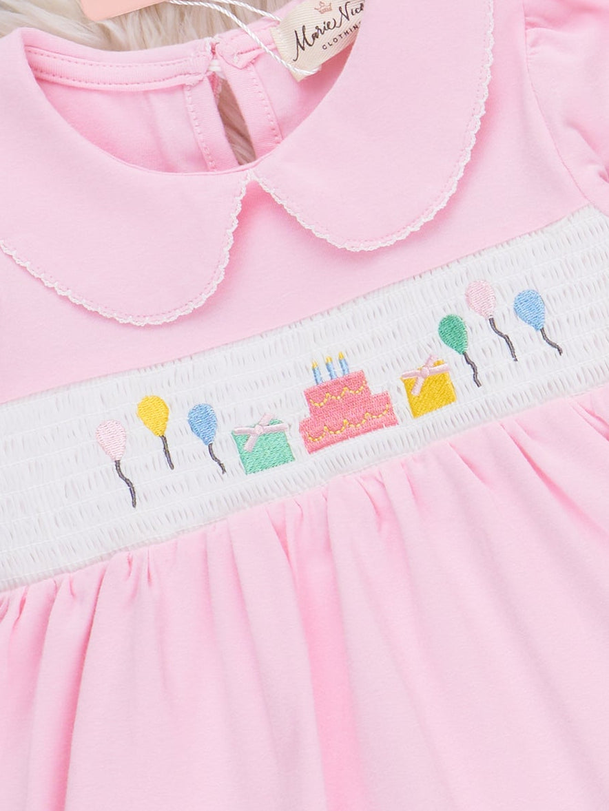 The Balloon Bliss Smocked Dress by Marie Nicole features a lively balloon print, sweetly gathered neckline with decorative trim, and long elastic-cuffed sleeves for comfort. Adjustable side ties and a bubble silhouette make this style perfect for birthday celebrations and everyday adventures.
