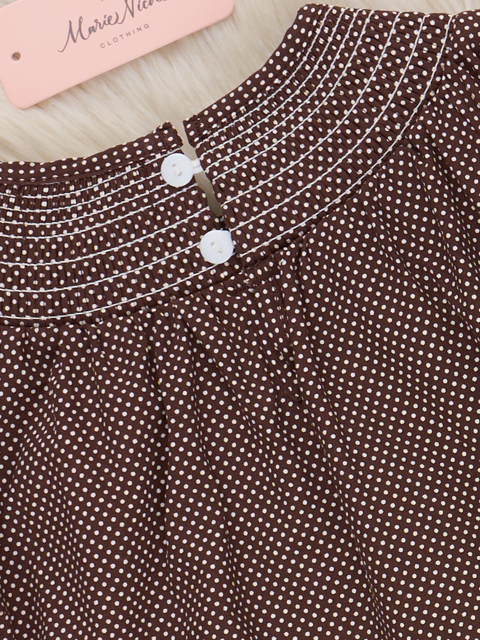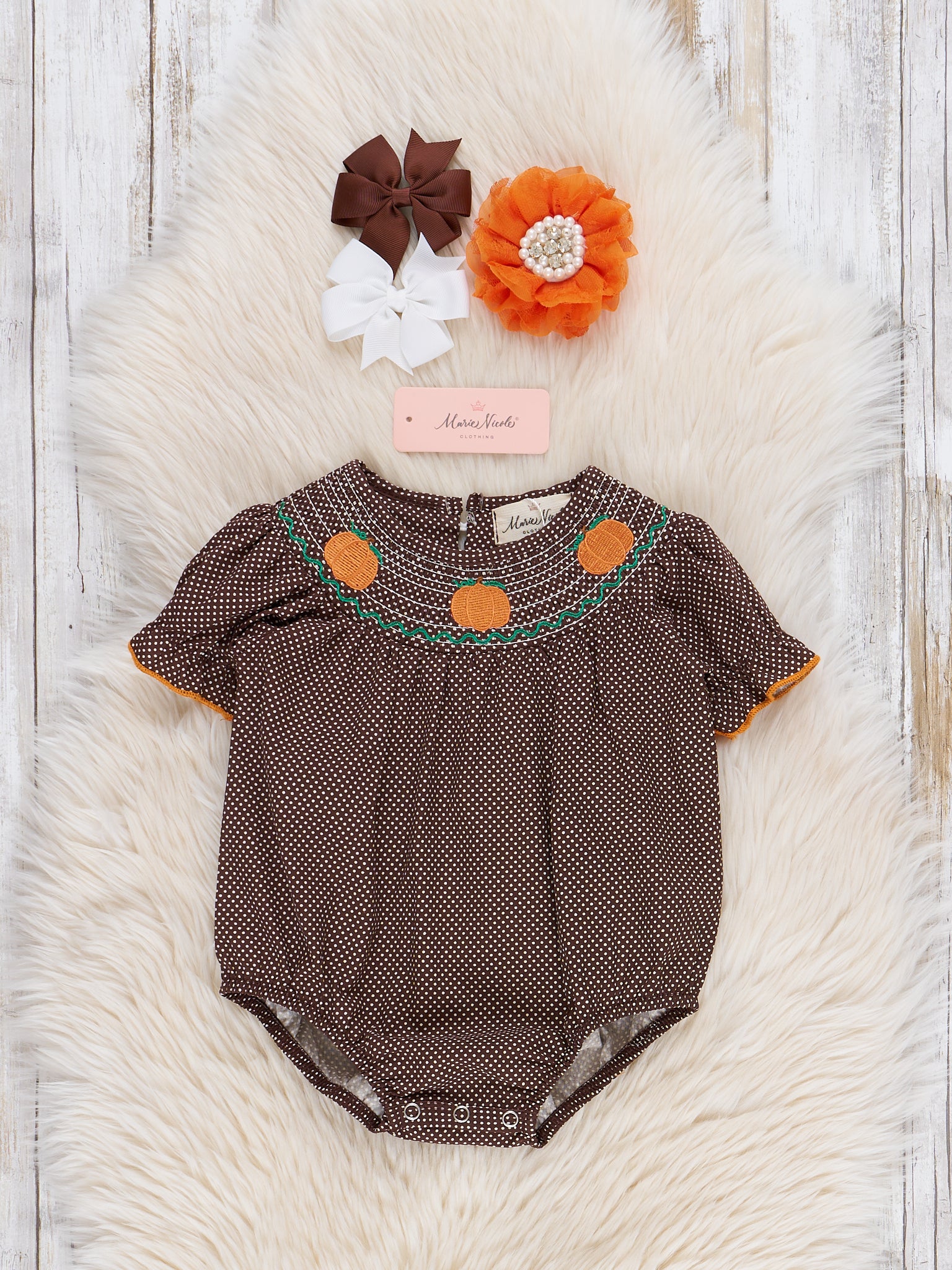 Go big or GOURD home with the Brown Smocked Pumpkin Bubble Romper! This cute and classic romper by Marie Nicole Clothing features smocking, embroidered pumpkins, polka dots, & orange trim. Crafted with soft, cotton fabric, your little girl will be so comfy and cute wearing this in the fall!
